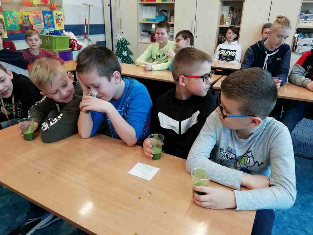Na warsztatach „BE FIT NOT FAT” p. Aneta Ostanek uczyła dzieci jak czytać skład produktów, a także jak obliczyć ile cukru zawierają popularne słodycze i napoje (ciastka, żelki, batony, czekolada, jogurty, soki). Ciekawostką było dosłowne pokazanie dzieciom ile cukru zawierają ich ulubione przekąski. Uczniowie z zainteresowaniem przyglądali się eksperymentowi odbarwiania kolorowych napojów za pomocą chusteczki do prania wyłapującej kolory. Tą wiosenna akcją chcieliśmy uzmysłowić dzieciom jak ogromny wpływ mamy na to co jemy. I że mamy wybór – zastąpić niezdrowe, gotowe produkty, domowymi, smacznymi odpowiednikami!