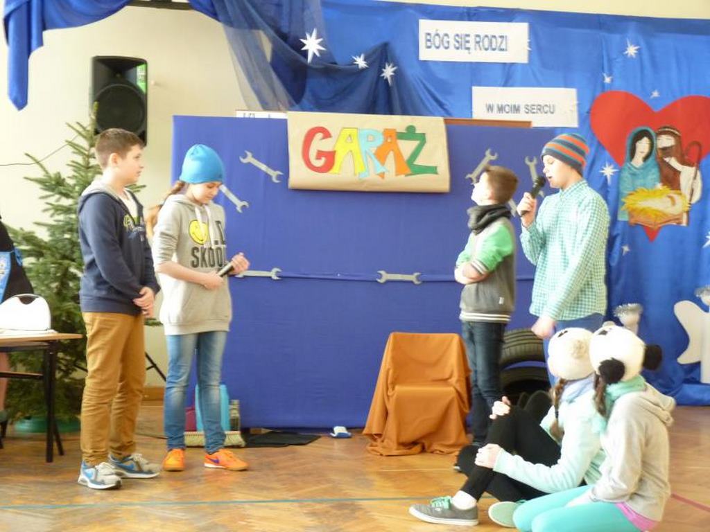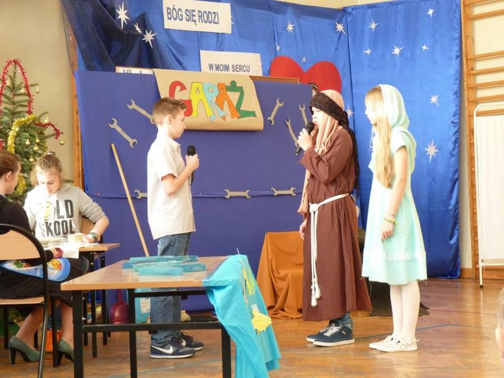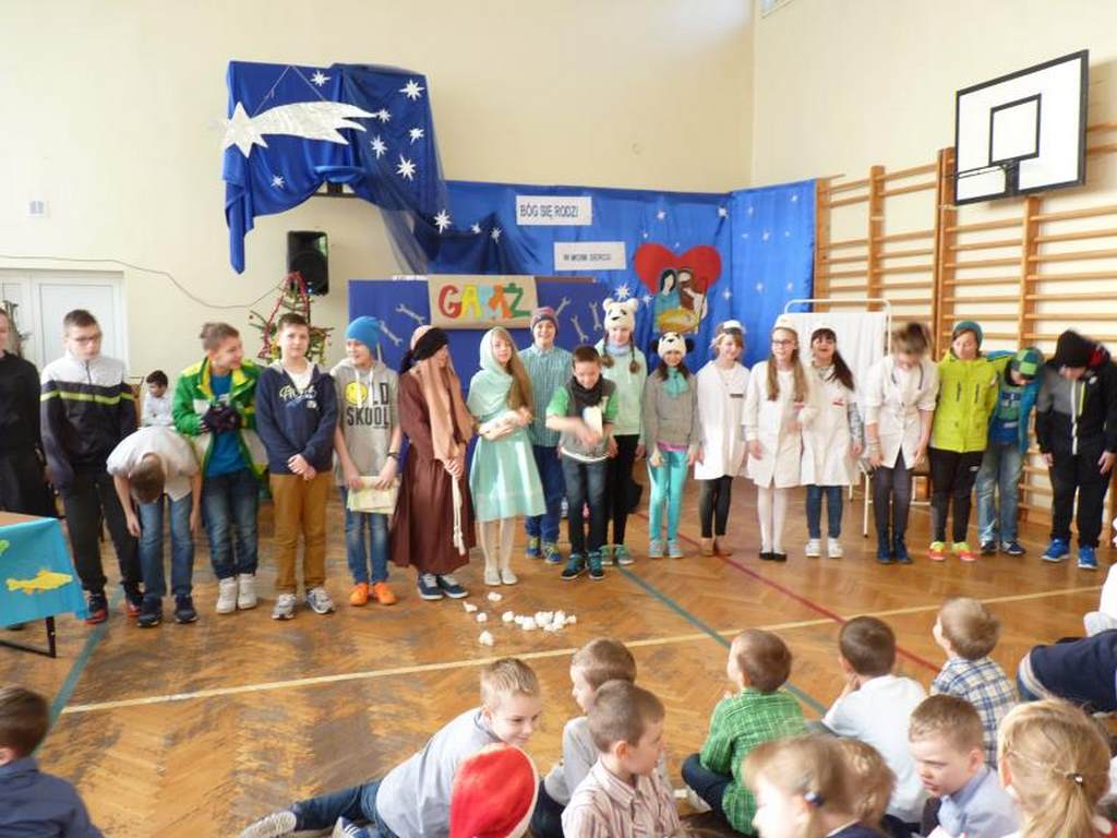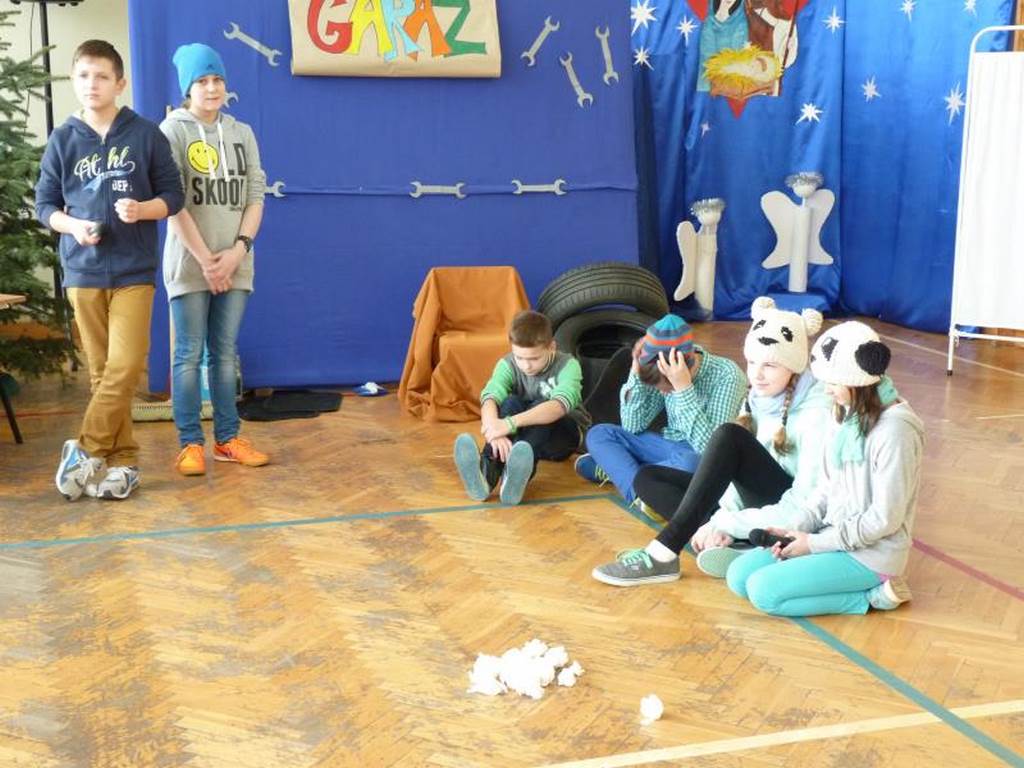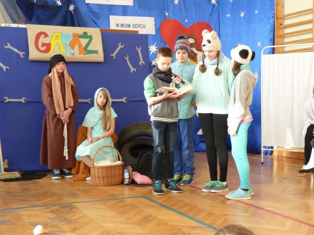 Dnia 22 grudnia 2015r. wszyscy uczniowie naszej szkoły wraz z gronem pedagogicznym obejrzeli „Jasełka w garażu” przygotowane przez ks. Karola Wagę, przy współpracy katechetów i innych nauczycieli. Młodzi aktorzy z klasy szóstej wprowadzili widzów w świąteczny nastrój. Wplecione w scenariusz tradycyjne kolędy wykonał zespół wokalno – instrumentalny pod kierunkiem p. Marii Nawrott. Wszyscy włączyliśmy się w śpiew, aby przywitać Nowonarodzonego Pana.