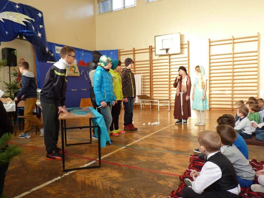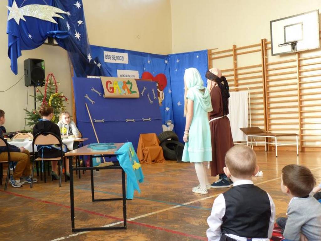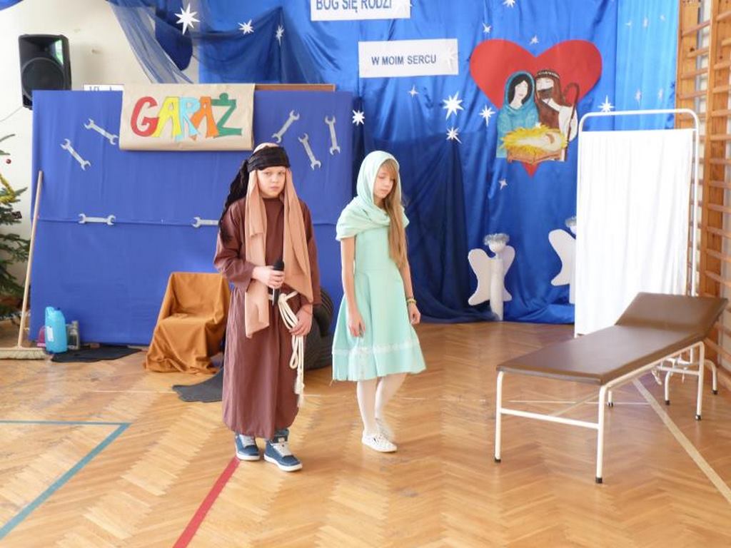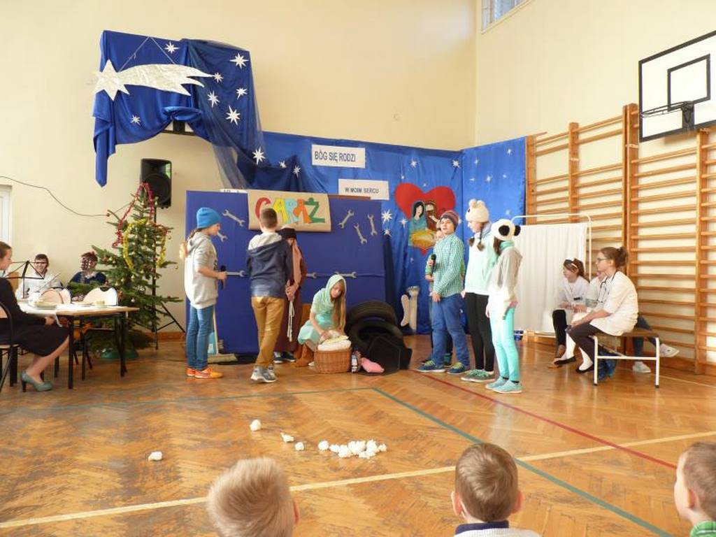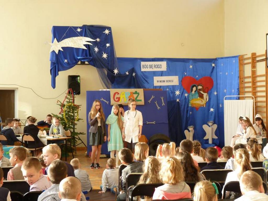 Dnia 22 grudnia 2015r. wszyscy uczniowie naszej szkoły wraz z gronem pedagogicznym obejrzeli „Jasełka w garażu” przygotowane przez ks. Karola Wagę, przy współpracy katechetów i innych nauczycieli. Młodzi aktorzy z klasy szóstej wprowadzili widzów w świąteczny nastrój. Wplecione w scenariusz tradycyjne kolędy wykonał zespół wokalno – instrumentalny pod kierunkiem p. Marii Nawrott. Wszyscy włączyliśmy się w śpiew, aby przywitać Nowonarodzonego Pana.