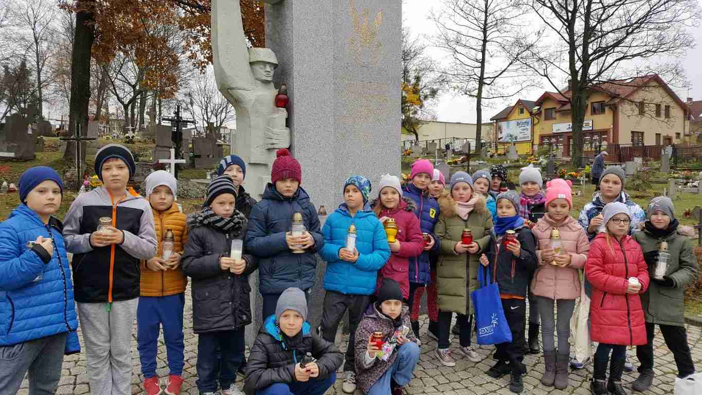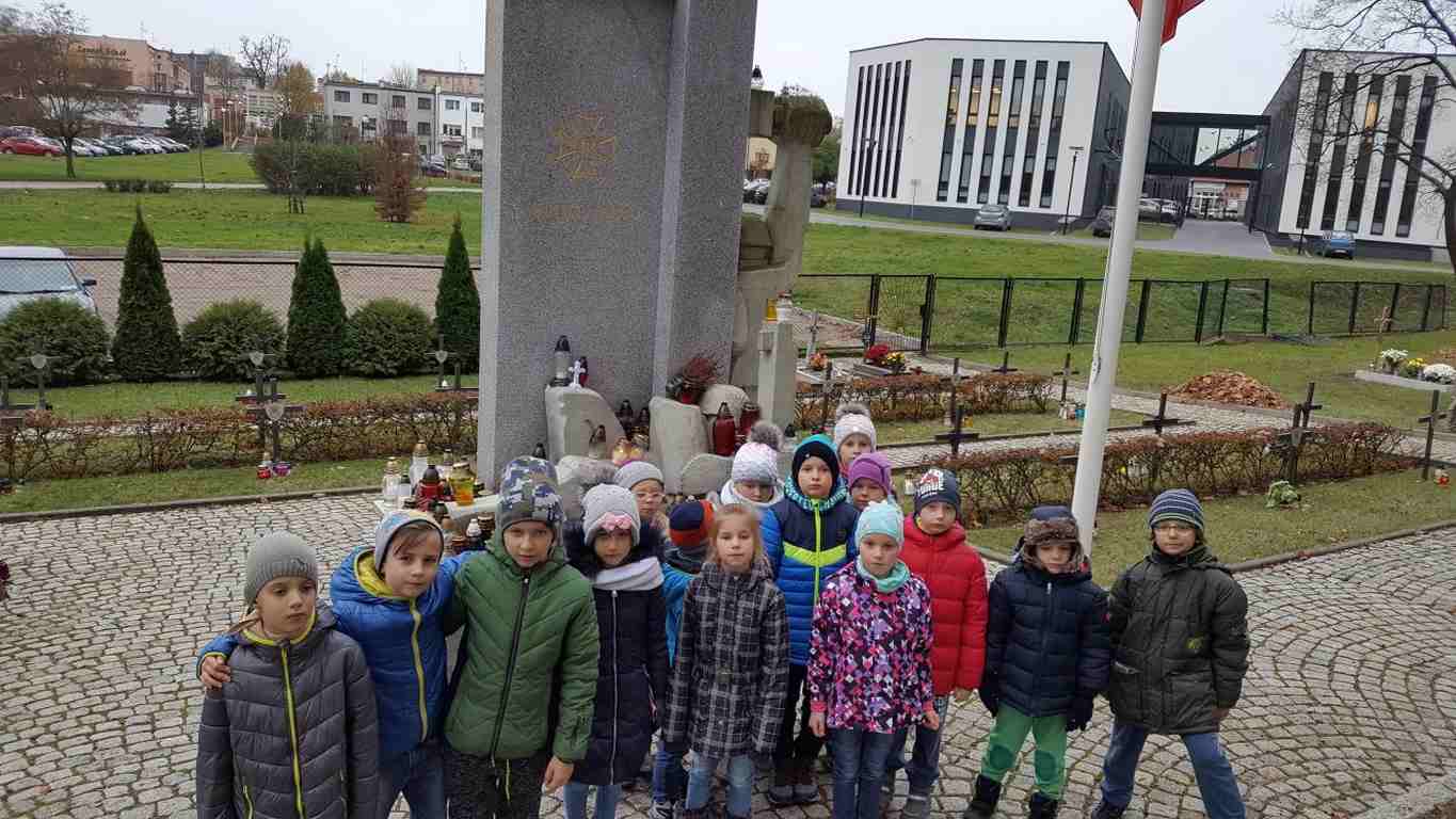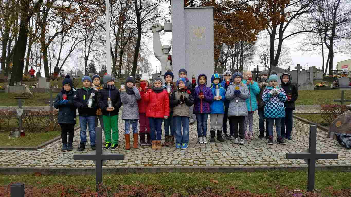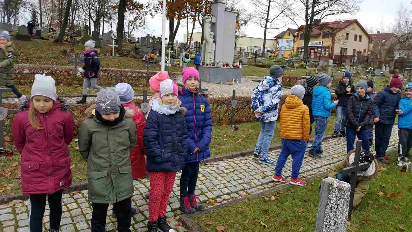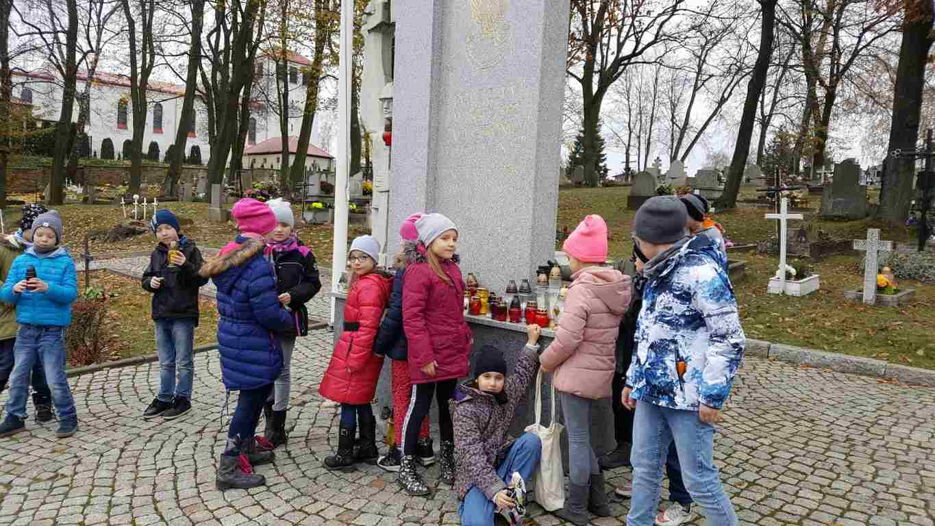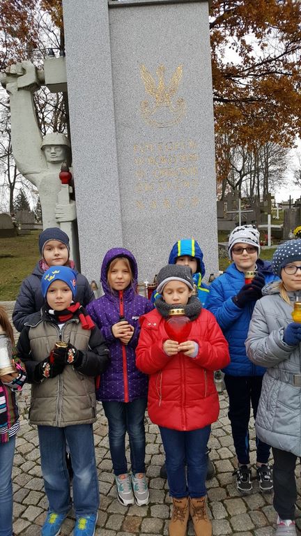 W związku ze zbliżającym się Narodowym Świętem Niepodległości uczniowie klas II a, III b i III c udali się na cmentarz, oddać hołd poległym żołnierzom. Dzieci w ciszy i skupieniu zapaliły znicze i ustawiły je na grobach żołnierzy. W jesiennej zadumie uczniowie wrócili do szkoły analizując wcześniej odczytany wpis na pomniku „Poległym w roku 1939 w obronie Ojczyzny”.
