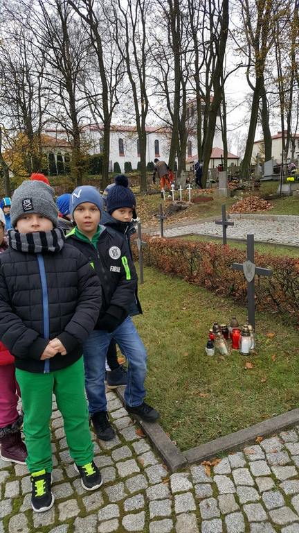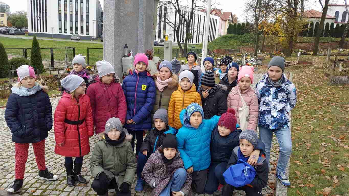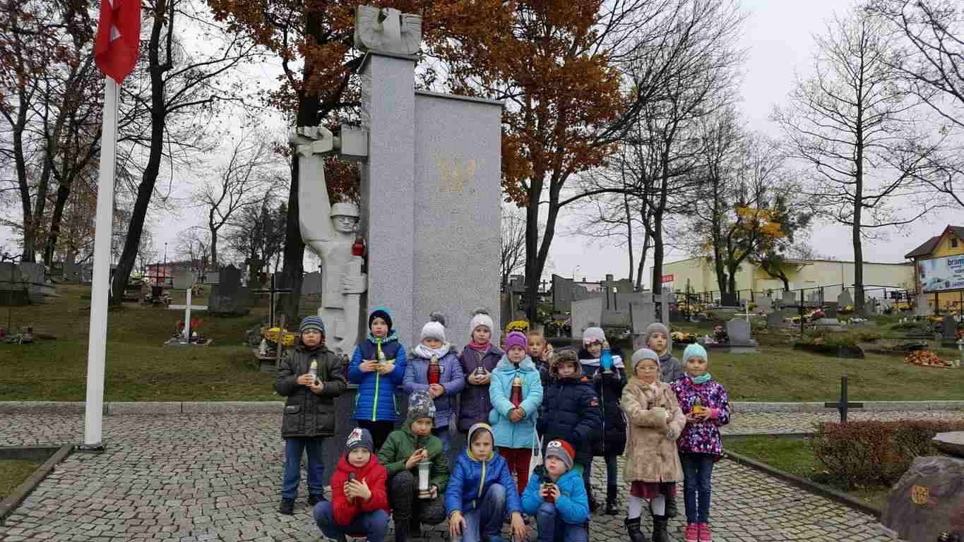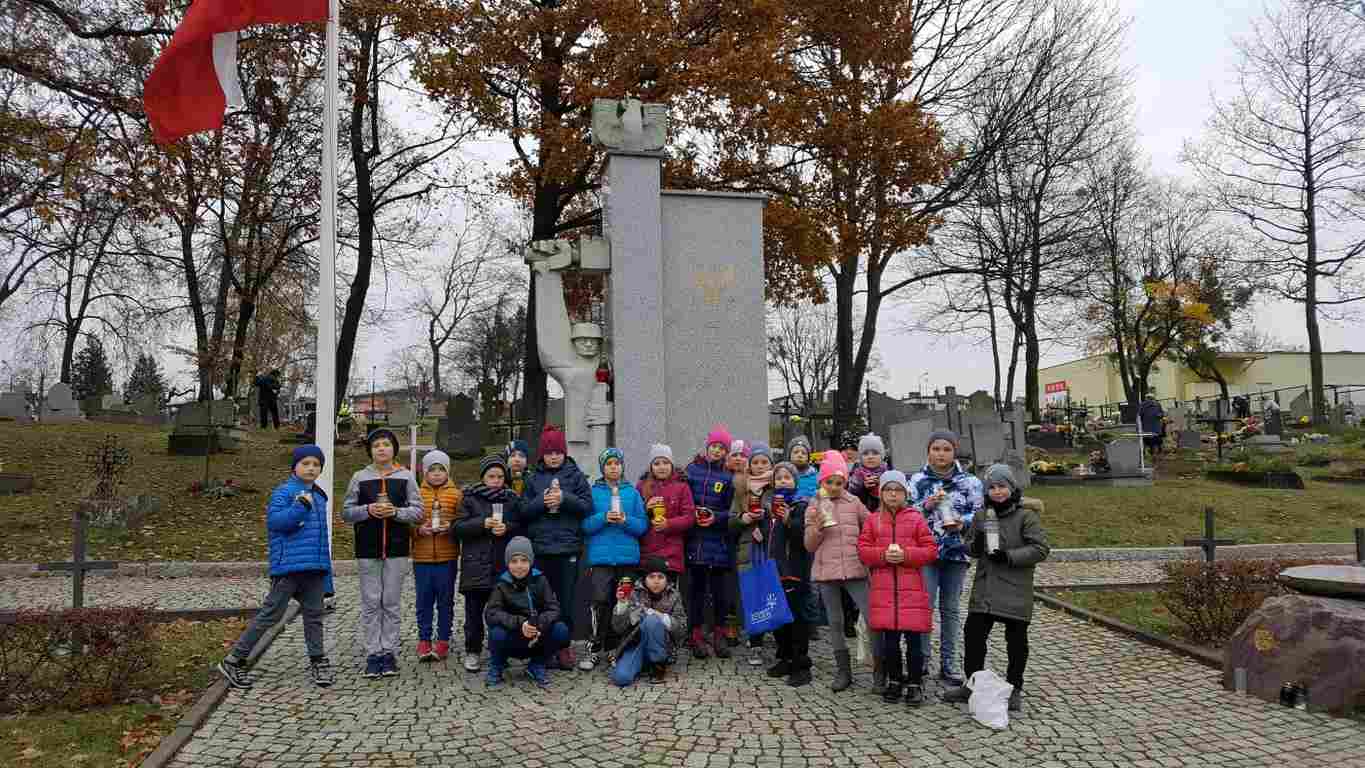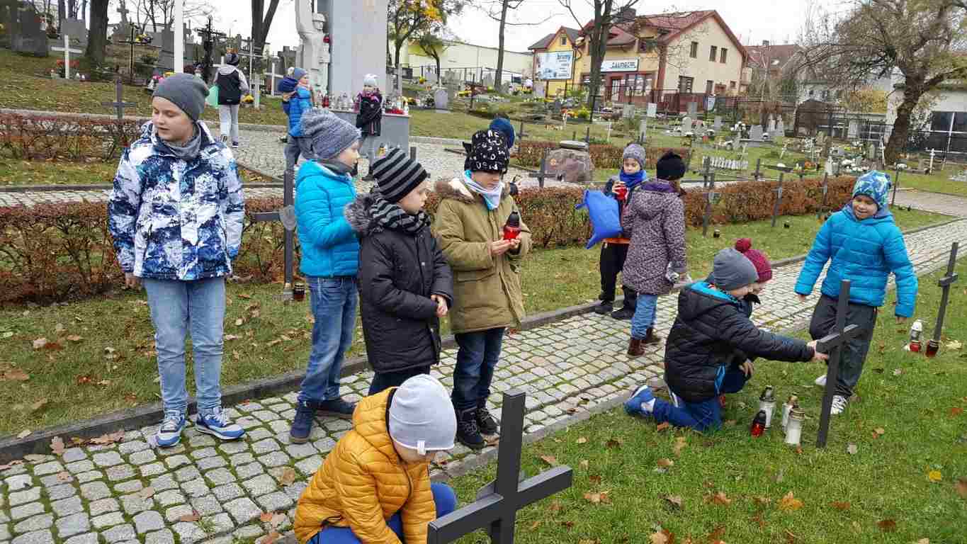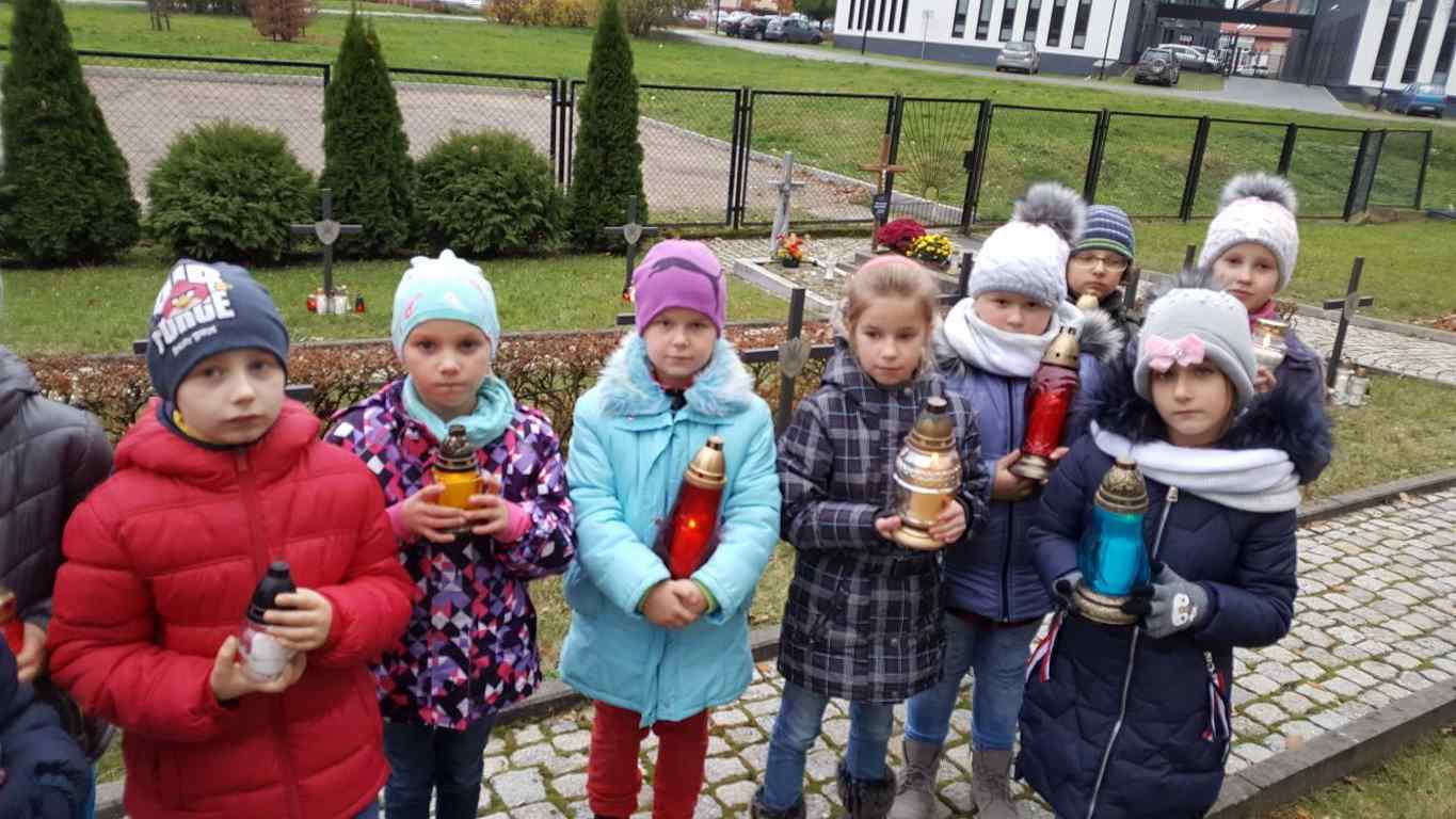 W związku ze zbliżającym się Narodowym Świętem Niepodległości uczniowie klas II a, III b i III c udali się na cmentarz, oddać hołd poległym żołnierzom. Dzieci w ciszy i skupieniu zapaliły znicze i ustawiły je na grobach żołnierzy. W jesiennej zadumie uczniowie wrócili do szkoły analizując wcześniej odczytany wpis na pomniku „Poległym w roku 1939 w obronie Ojczyzny”.