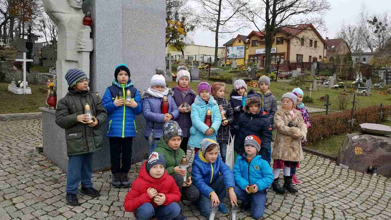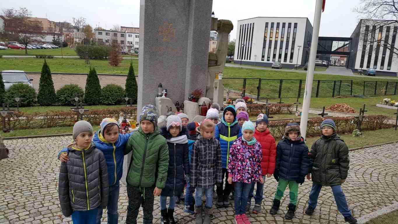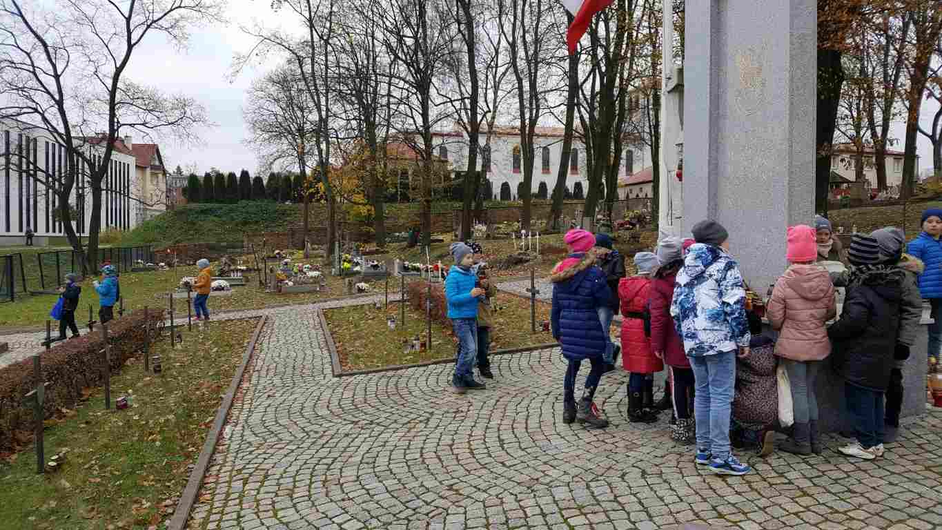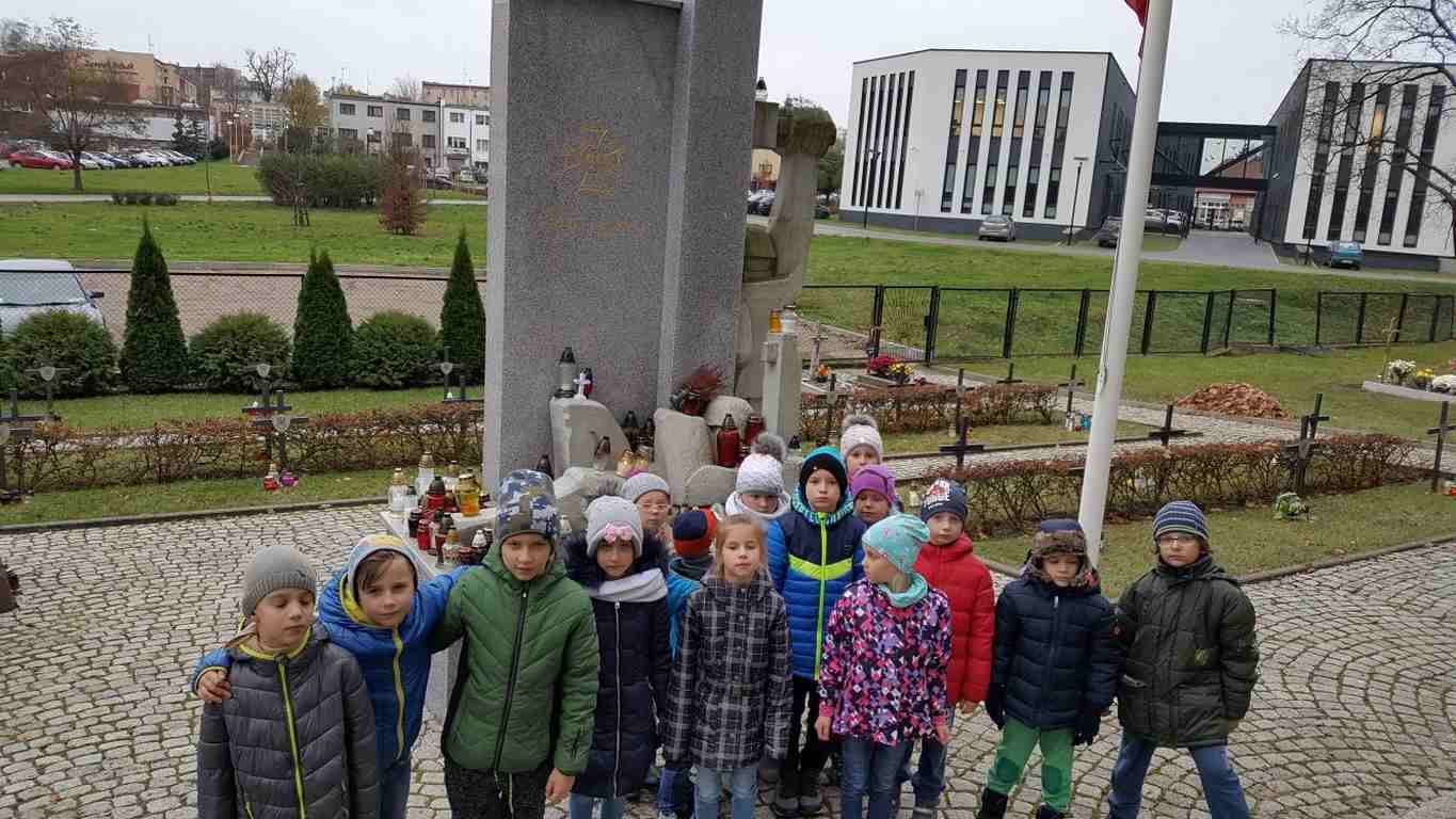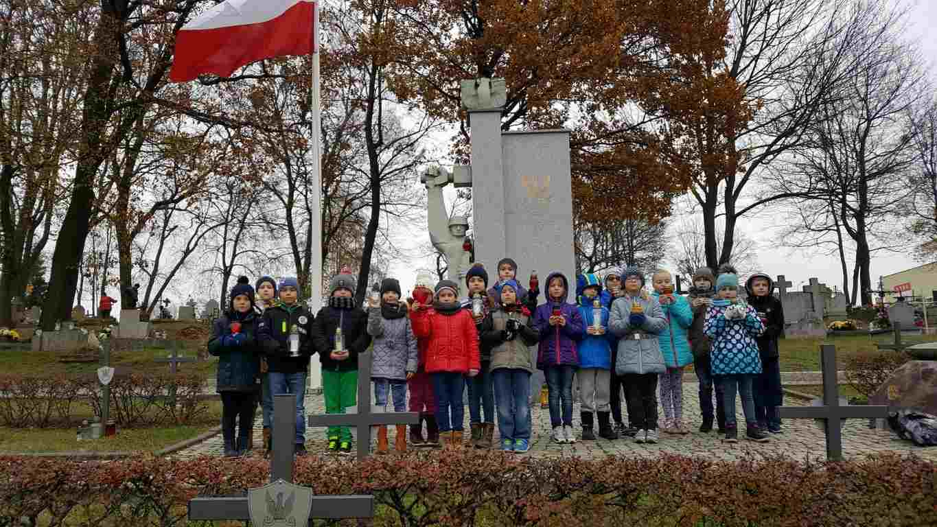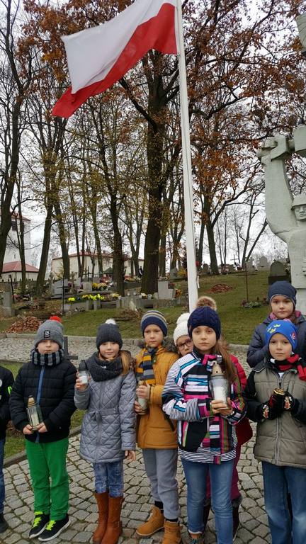 W związku ze zbliżającym się Narodowym Świętem Niepodległości uczniowie klas II a, III b i III c udali się na cmentarz, oddać hołd poległym żołnierzom. Dzieci w ciszy i skupieniu zapaliły znicze i ustawiły je na grobach żołnierzy. W jesiennej zadumie uczniowie wrócili do szkoły analizując wcześniej odczytany wpis na pomniku „Poległym w roku 1939 w obronie Ojczyzny”.