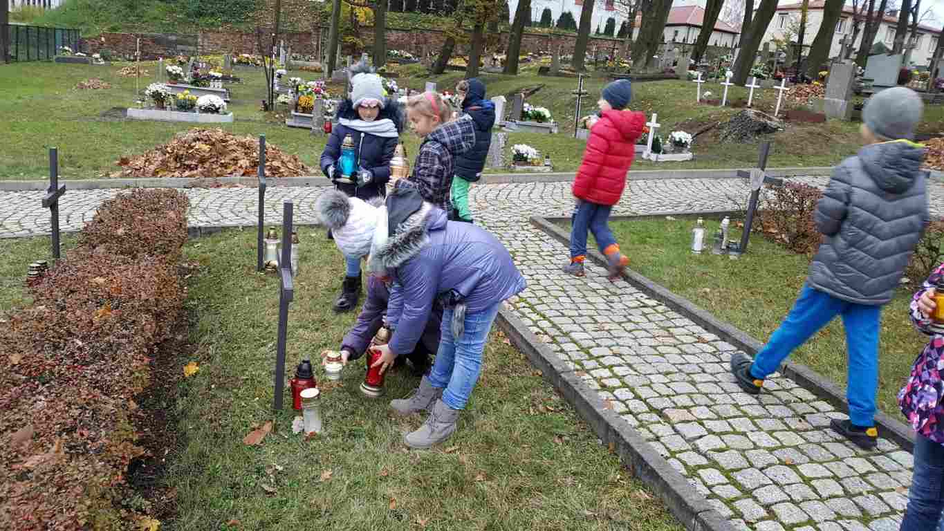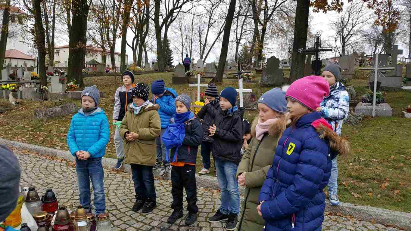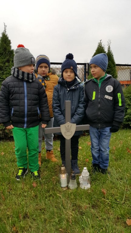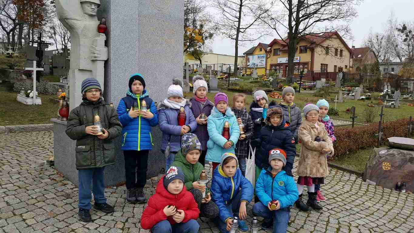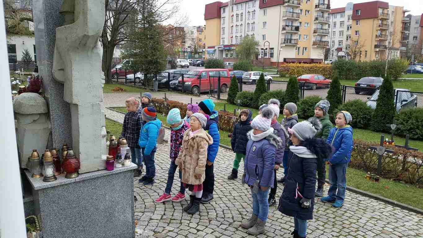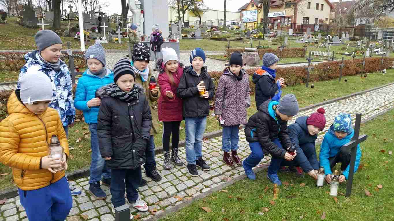W związku ze zbliżającym się Narodowym Świętem Niepodległości uczniowie klas II a, III b i III c udali się na cmentarz, oddać hołd poległym żołnierzom. Dzieci w ciszy i skupieniu zapaliły znicze i ustawiły je na grobach żołnierzy. W jesiennej zadumie uczniowie wrócili do szkoły analizując wcześniej odczytany wpis na pomniku „Poległym w roku 1939 w obronie Ojczyzny”.