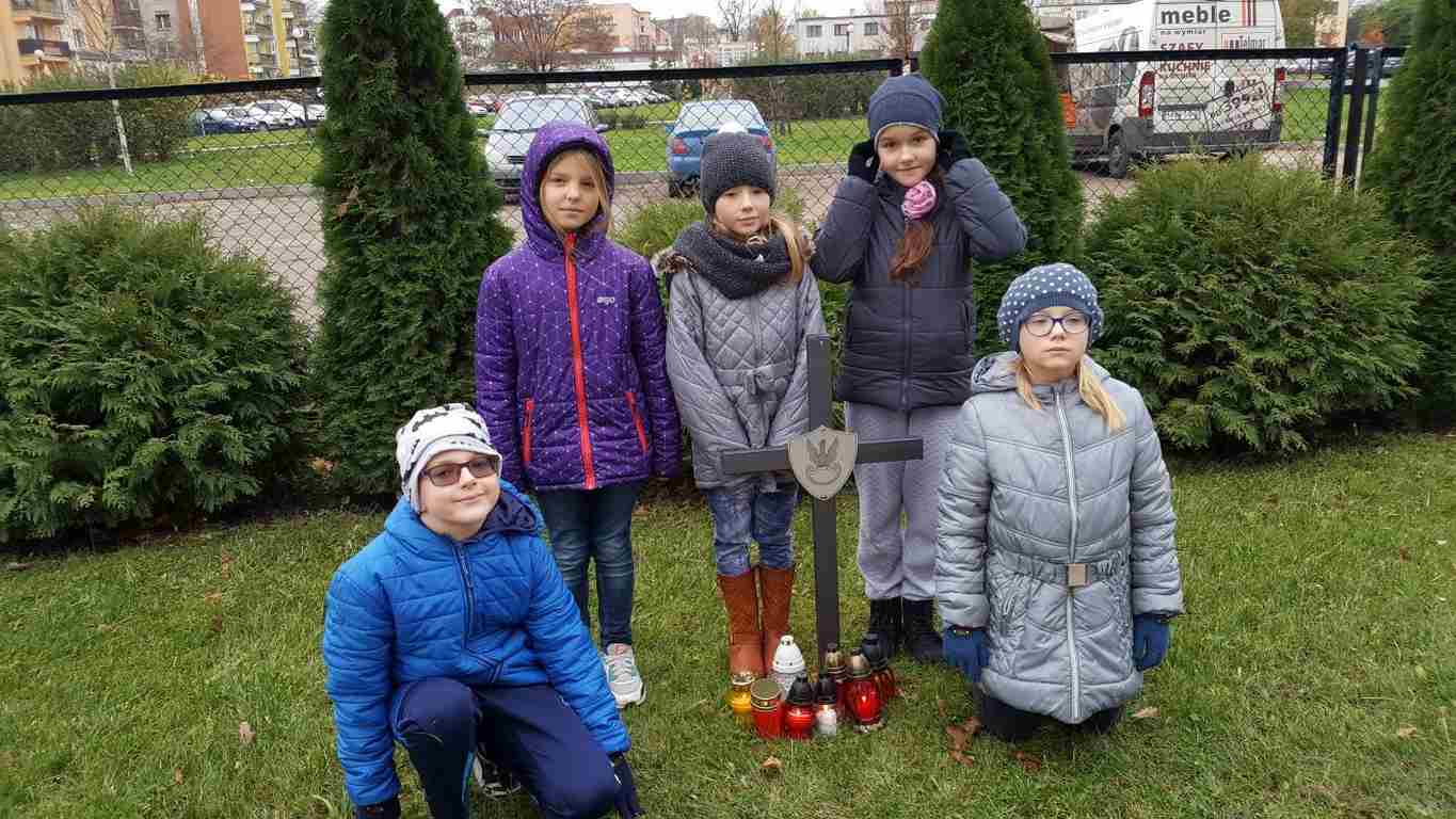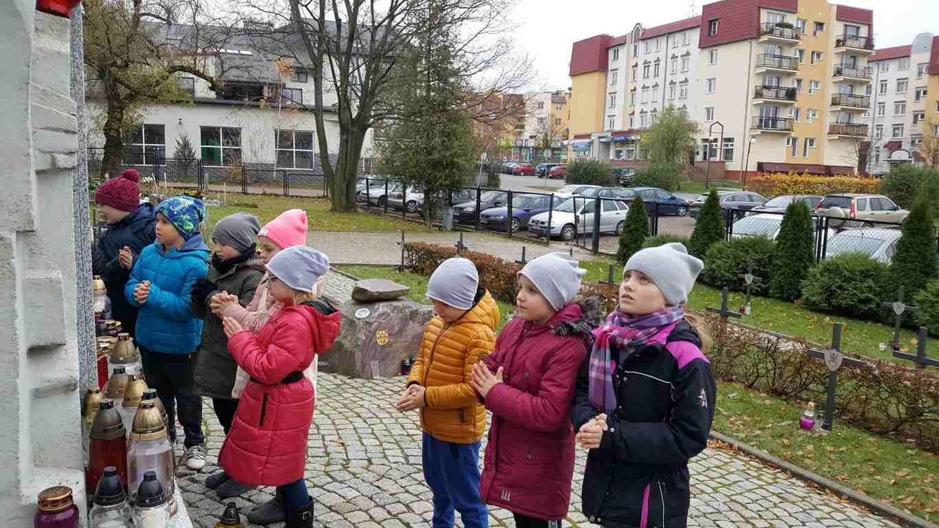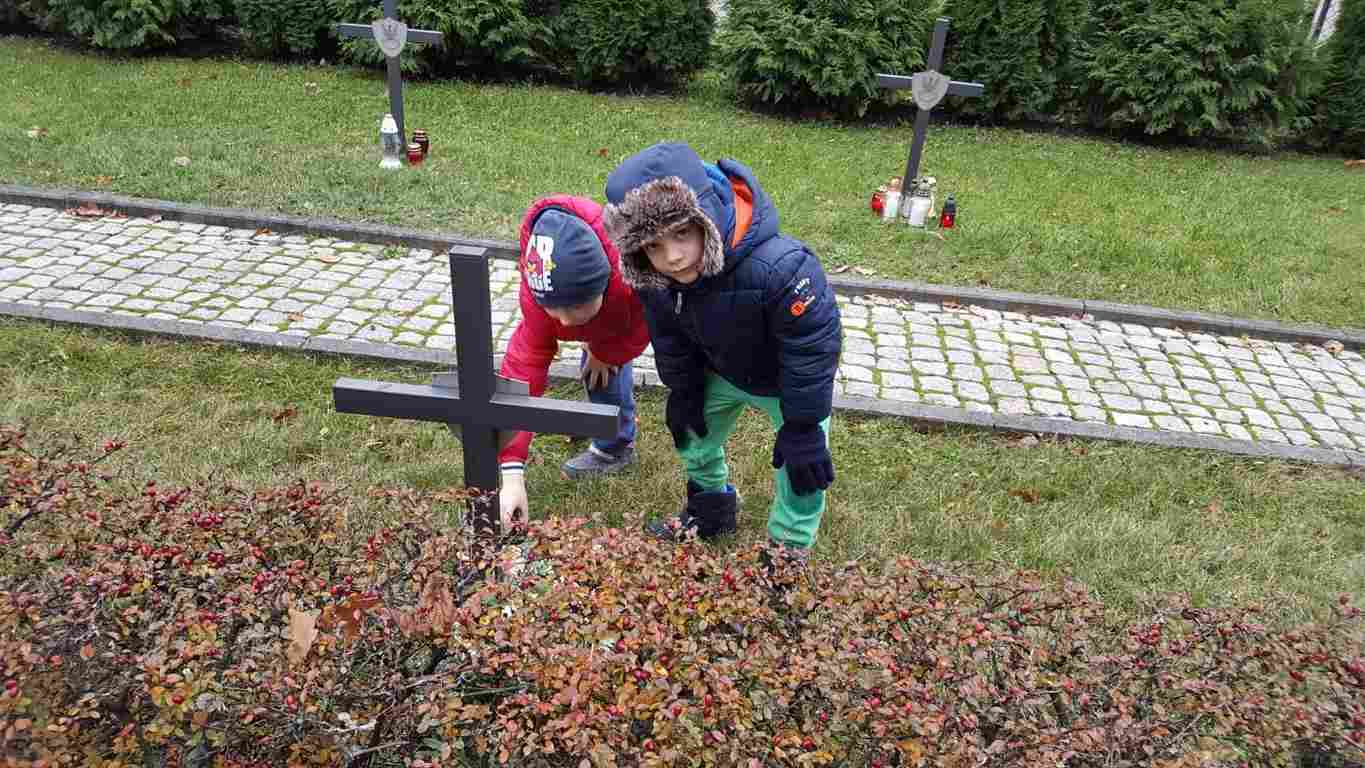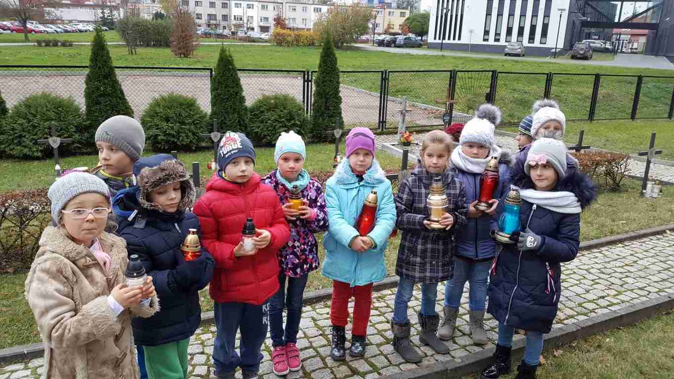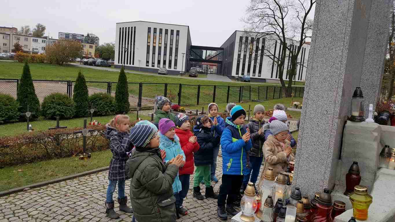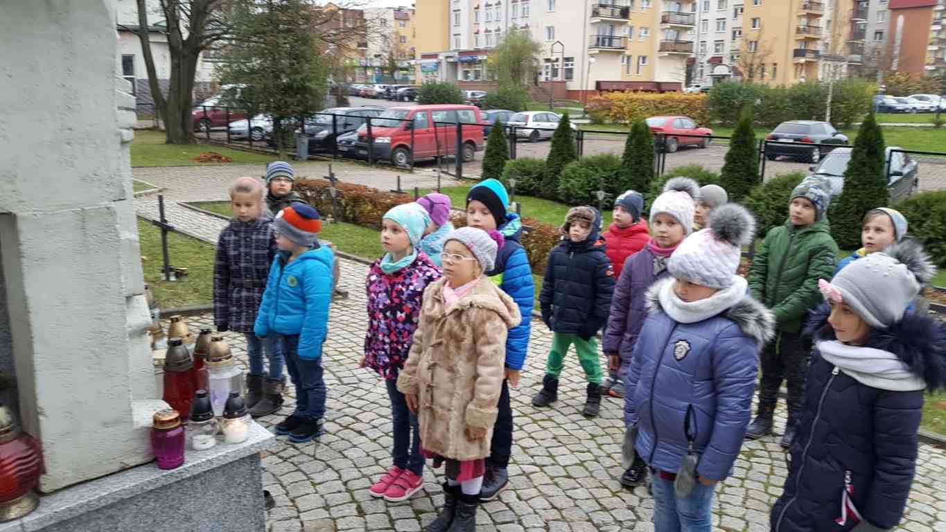 W związku ze zbliżającym się Narodowym Świętem Niepodległości uczniowie klas II a, III b i III c udali się na cmentarz, oddać hołd poległym żołnierzom. Dzieci w ciszy i skupieniu zapaliły znicze i ustawiły je na grobach żołnierzy. W jesiennej zadumie uczniowie wrócili do szkoły analizując wcześniej odczytany wpis na pomniku „Poległym w roku 1939 w obronie Ojczyzny”.