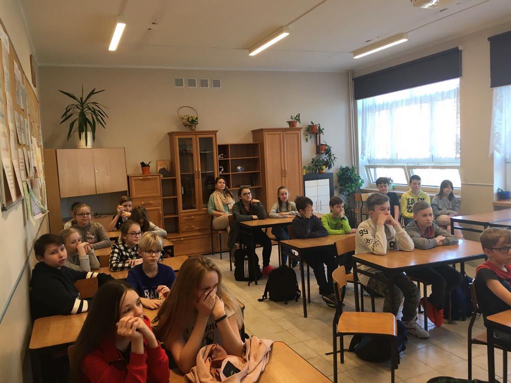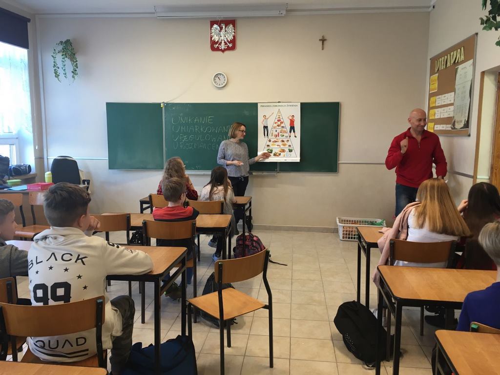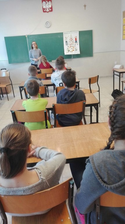 W dn. 19 marca 2018 r. w ramach programu "Owoce i warzywa w szkole" klasy IV - V odwiedziła pani dietetyk Ewa Michałowska. Zajęcia przeprowadzone przez zaproszonego gościa zachęciły dzieci do stosowania zasad zdrowego odżywiania zgodnie z przedstawioną piramidą żywienia. Na przykładach konkretnych dań uczniowie mogli określić jakich produktów należy unikać, a co jest wskazane, aby zdrowo się rozwijać.