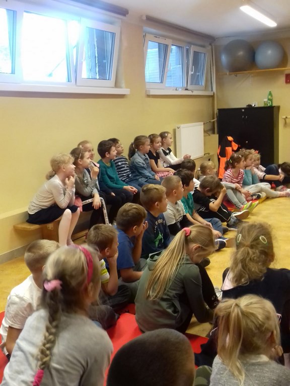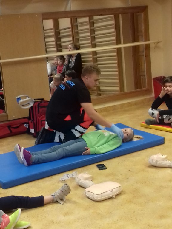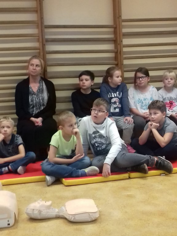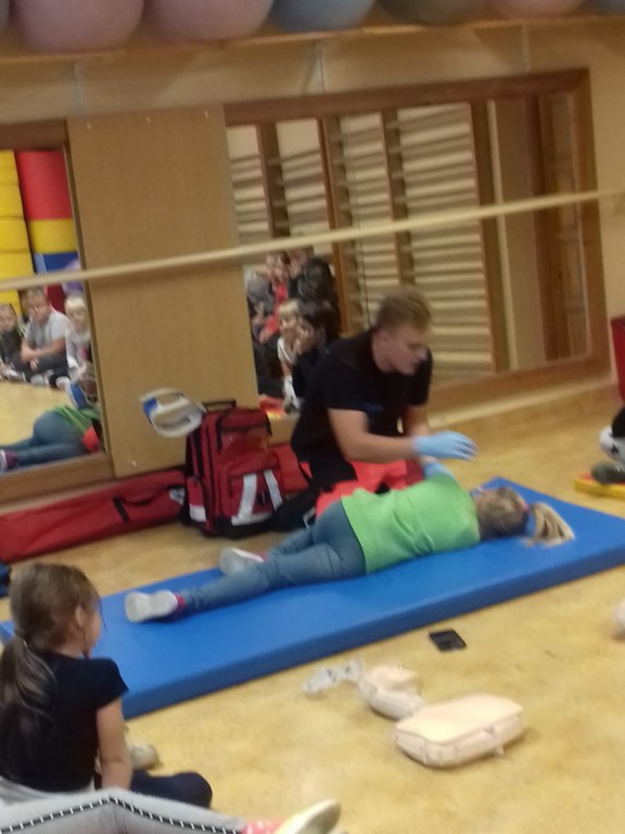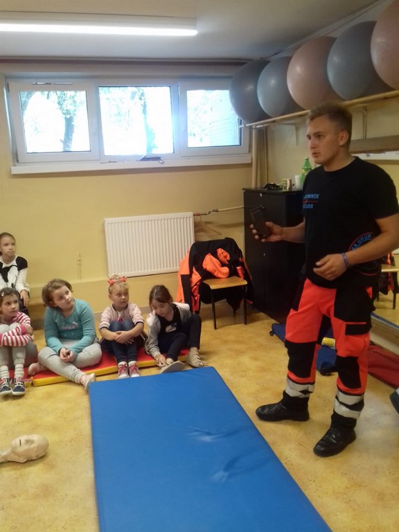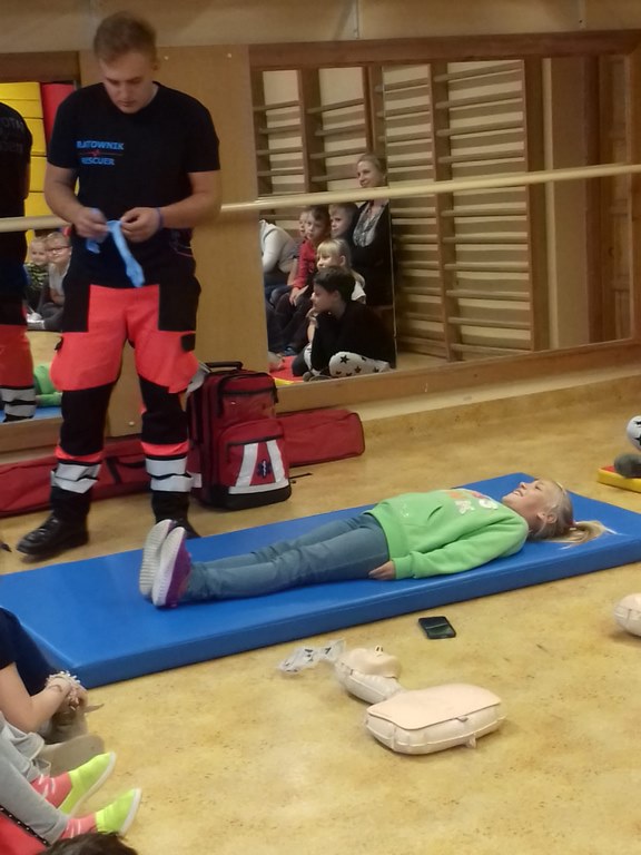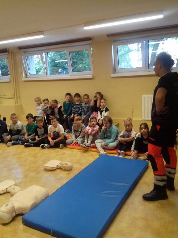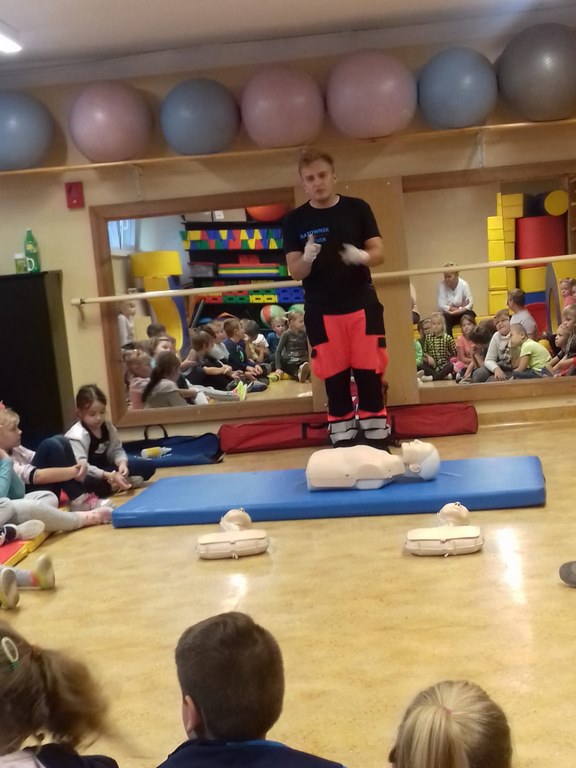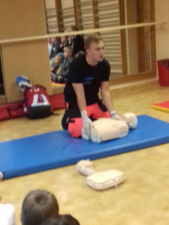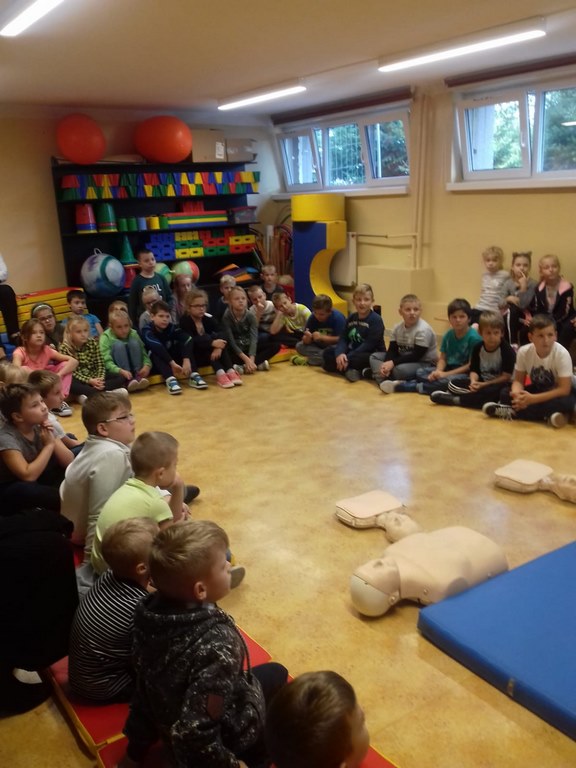 2 października 2018 r. uczniowie klas 2b, 2c i 3b uczestniczyli w pokazie udzielania pierwszej pomocy. Karol Jabłoński przedstawił dzieciom jak powinny się zachować mając do czynienia z osobą poszkodowaną, która jest przytomna i taką, która nie oddycha. Omówił kolejne etapy udzielenia takiej pomocy przez dziecko. Przed dziećmi kolejne zajęcia warsztatowe z ratownictwa o charakterze ćwiczeniowym.