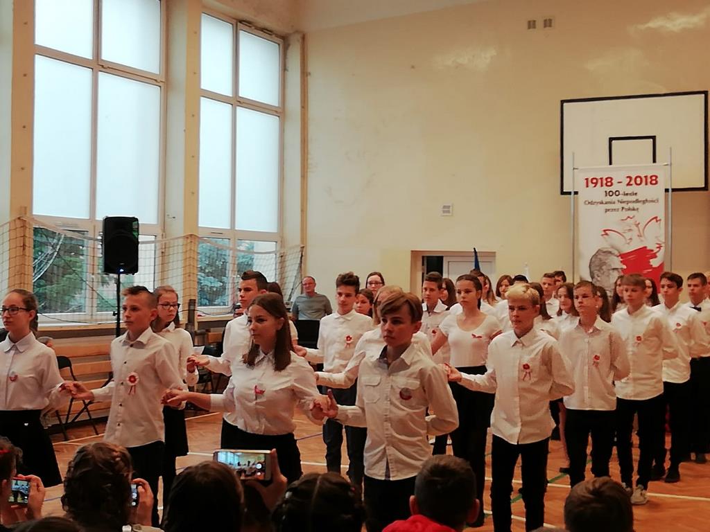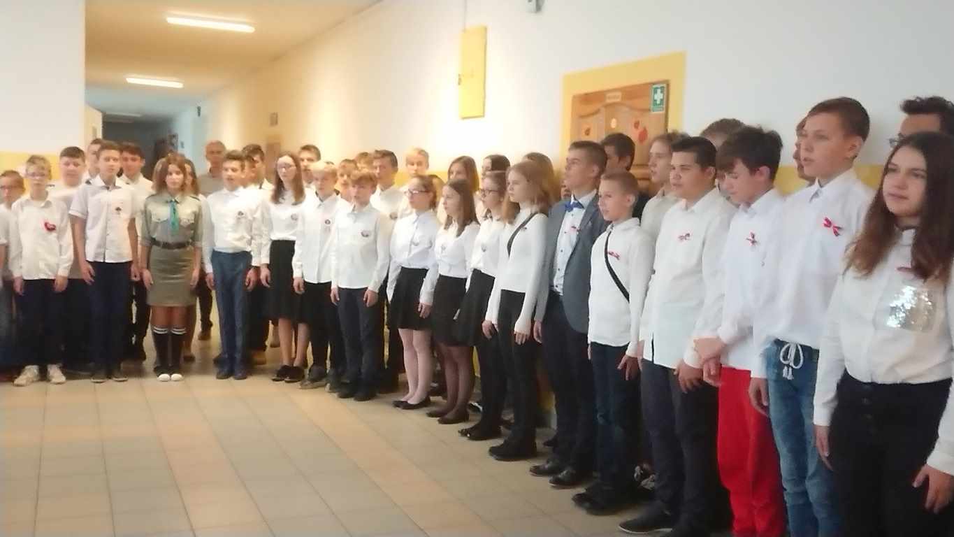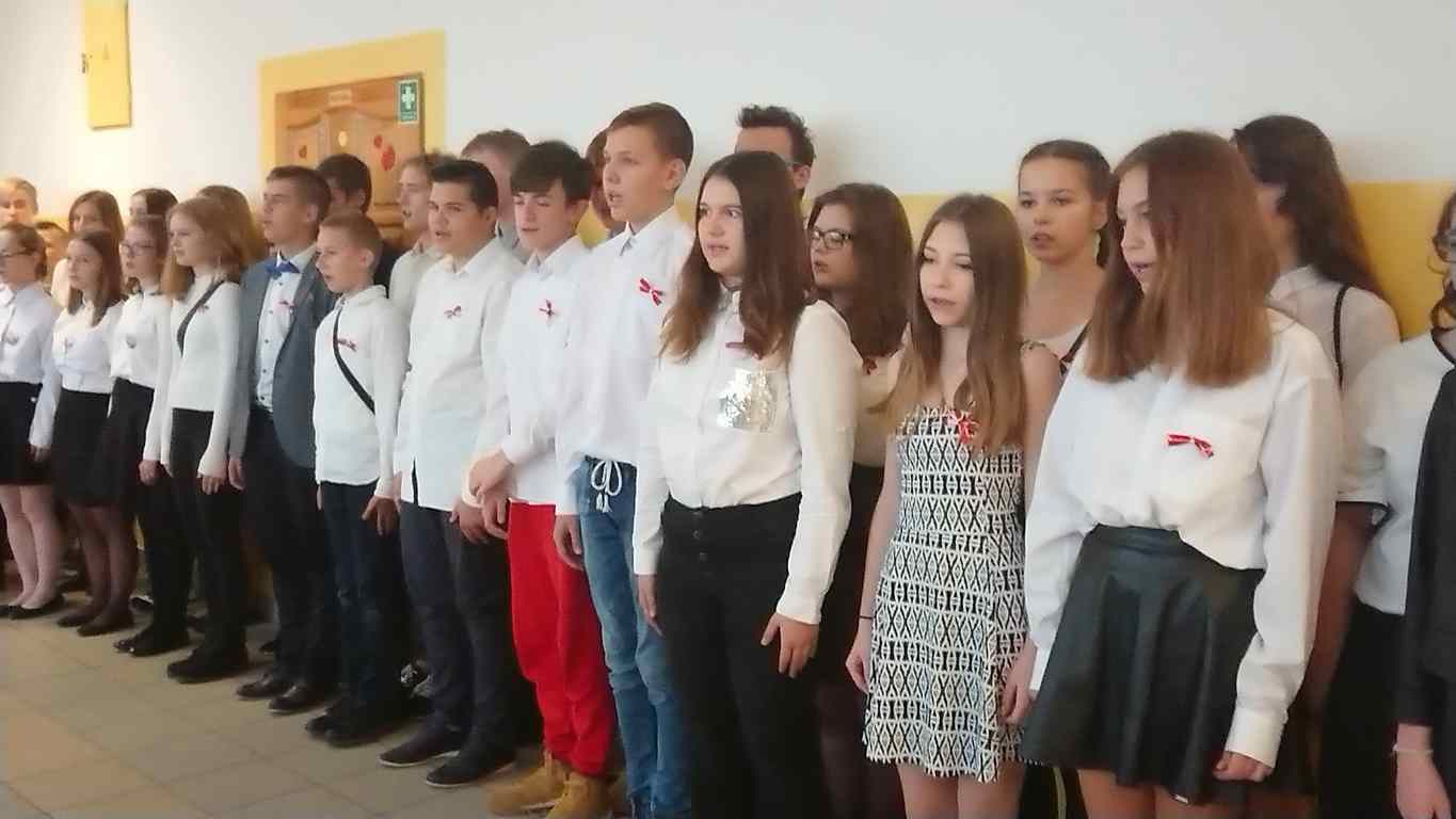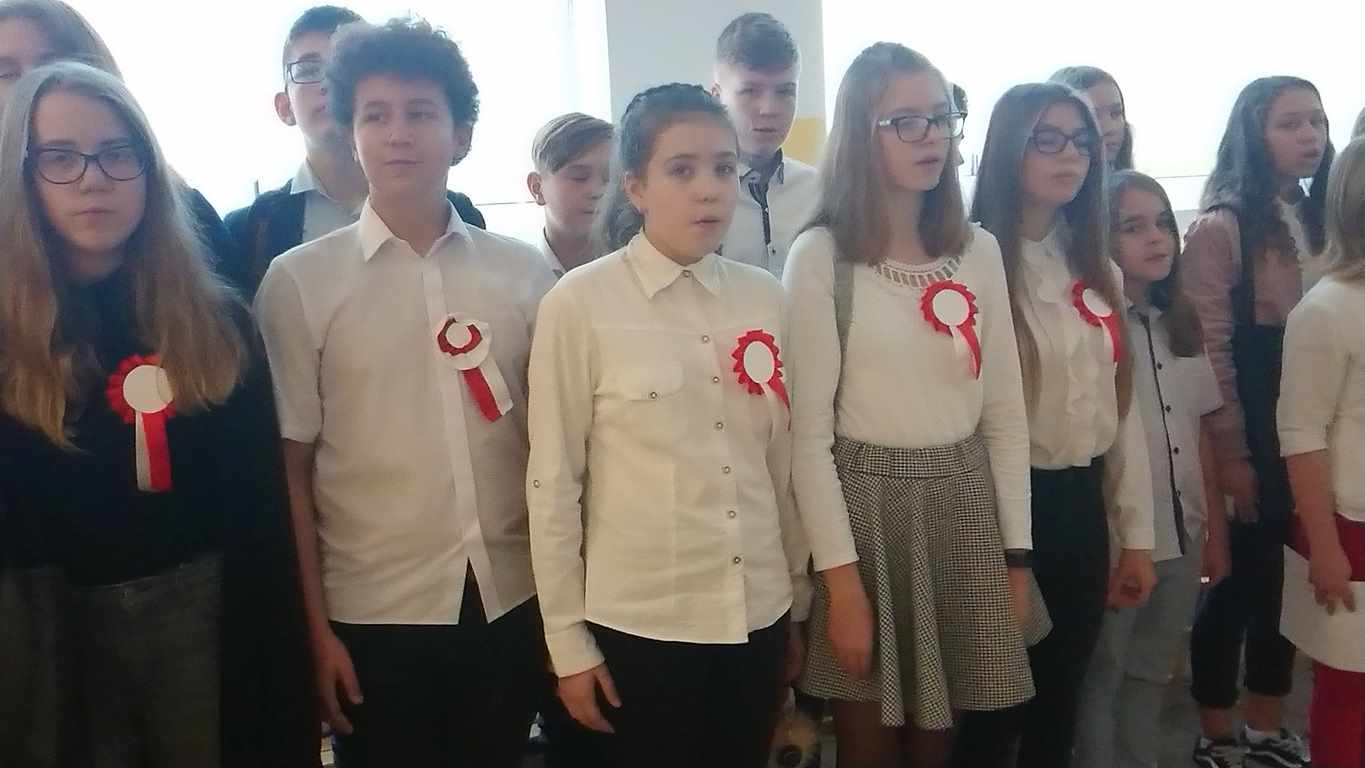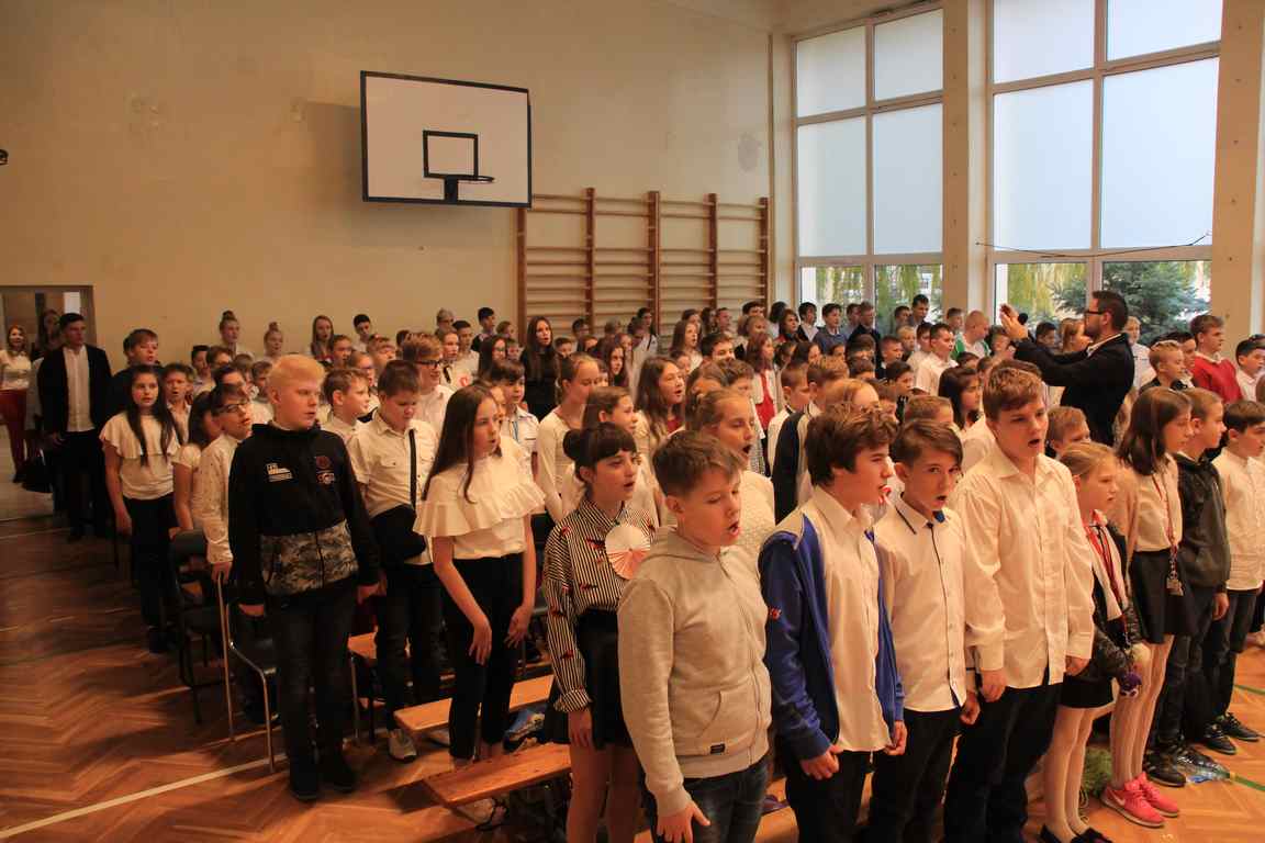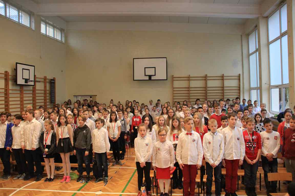 Kolejnym punktem szkolnych uroczystości było wspólne odśpiewanie hymnu. W ramach inicjatywy MEN uczniowie oraz wszyscy pracownicy szkoły zgromadzili się na szkolnych korytarzach, by punktualnie o 11.11 z dumą i powagą na twarzach oraz radością w sercach uczcić najważniejsze święto państwowe czterema zwrotkami „Mazurka Dąbrowskiego”.