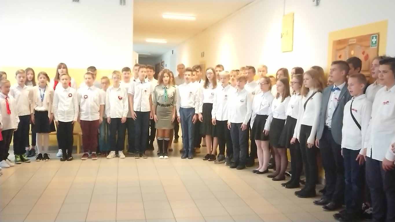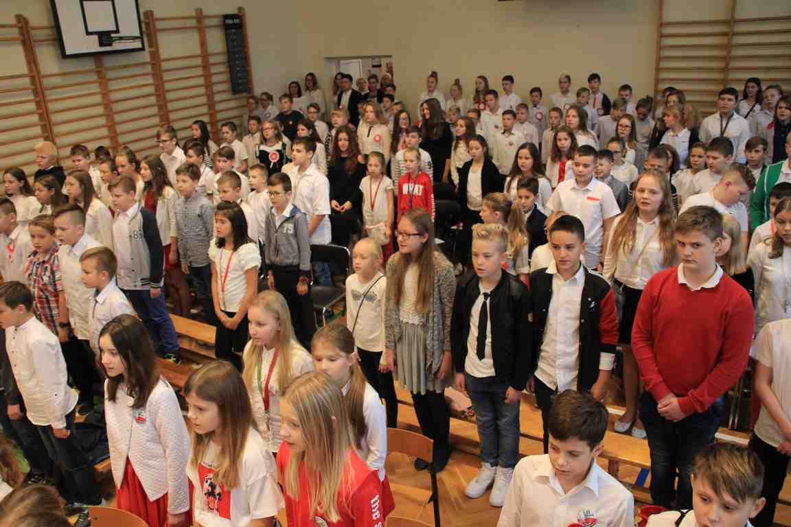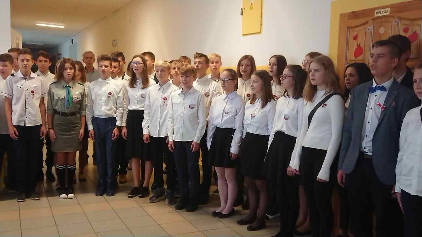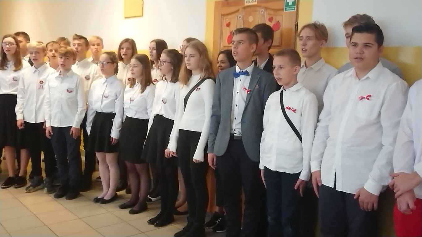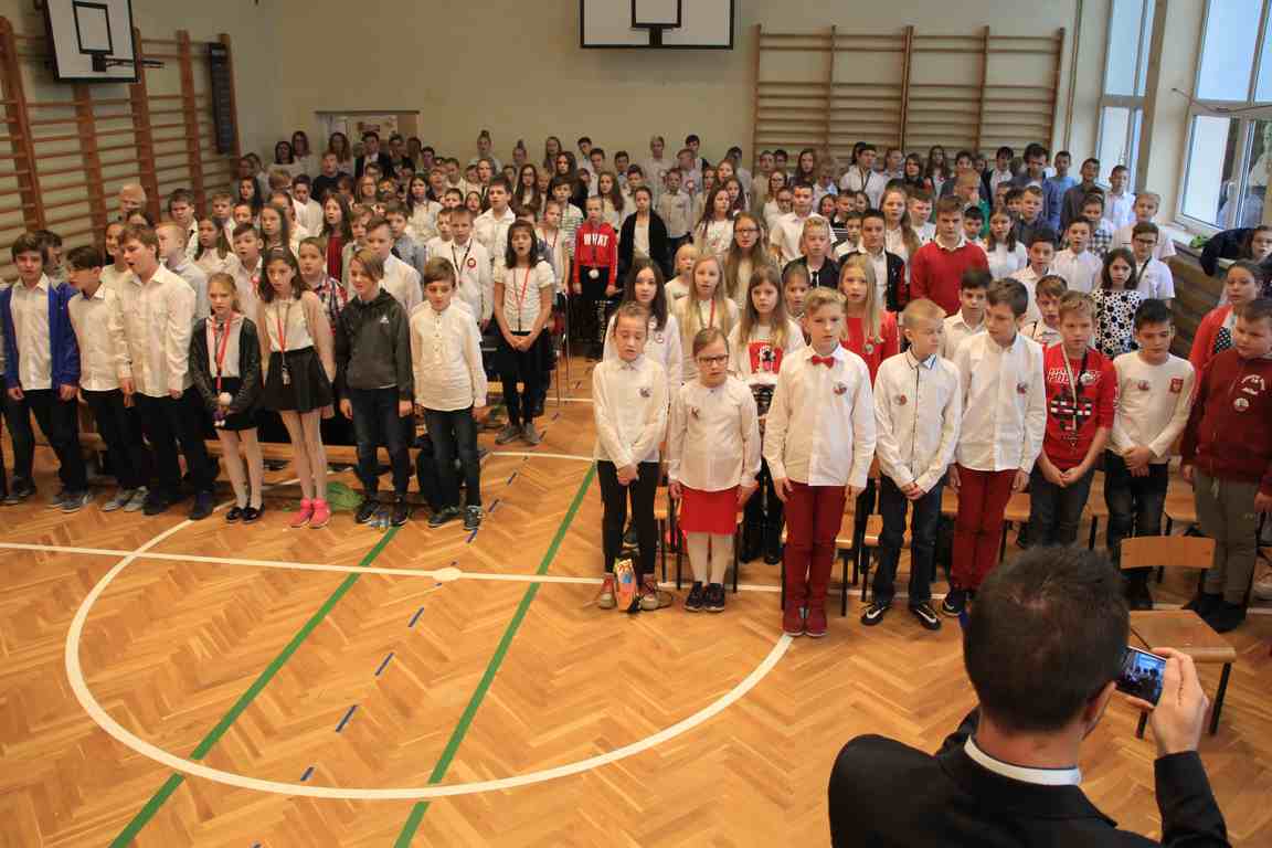 Kolejnym punktem szkolnych uroczystości było wspólne odśpiewanie hymnu. W ramach inicjatywy MEN uczniowie oraz wszyscy pracownicy szkoły zgromadzili się na szkolnych korytarzach, by punktualnie o 11.11 z dumą i powagą na twarzach oraz radością w sercach uczcić najważniejsze święto państwowe czterema zwrotkami „Mazurka Dąbrowskiego”.