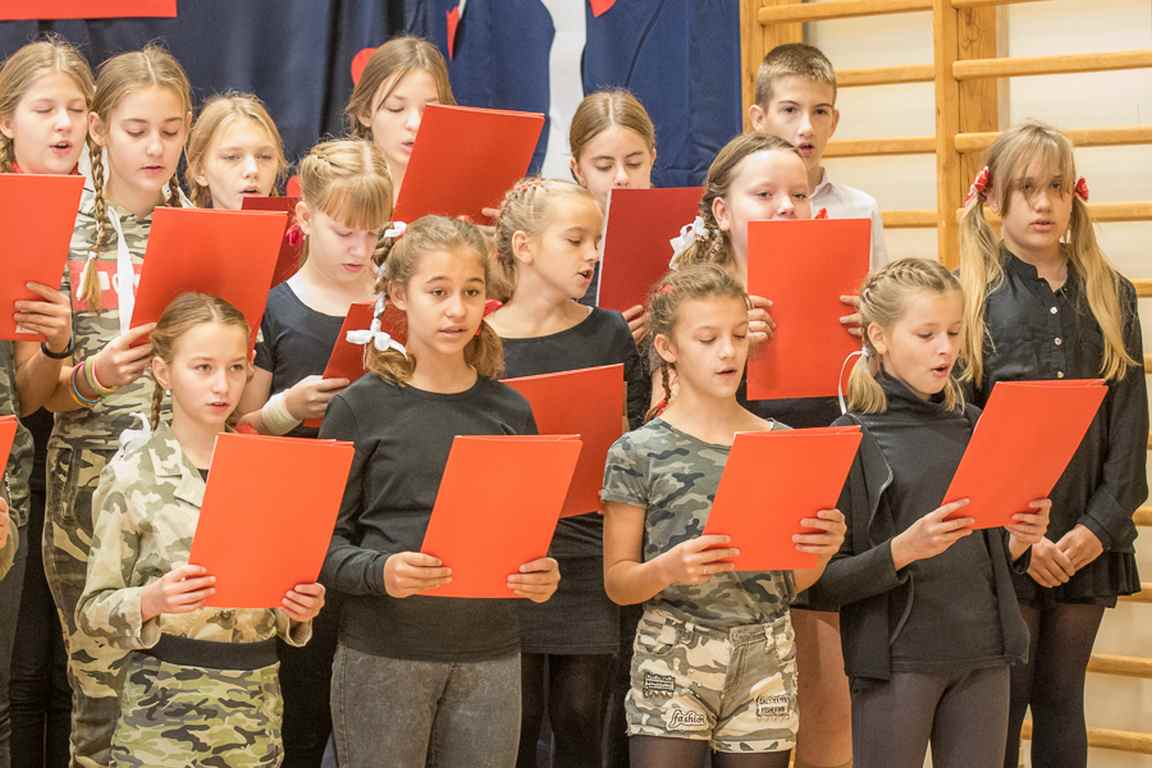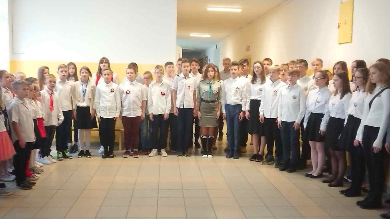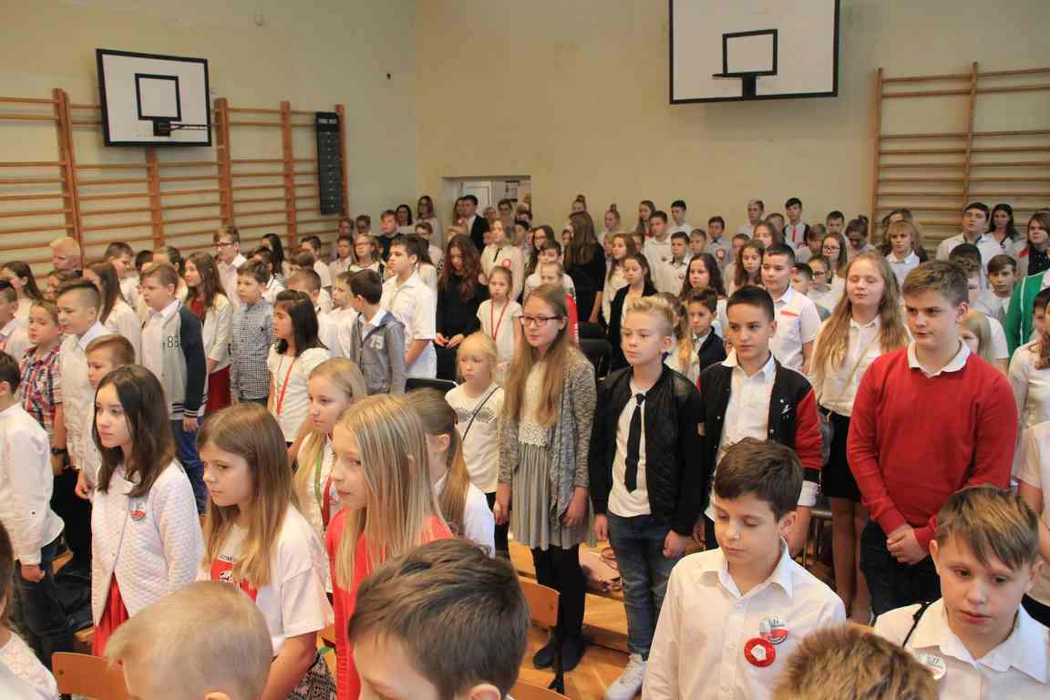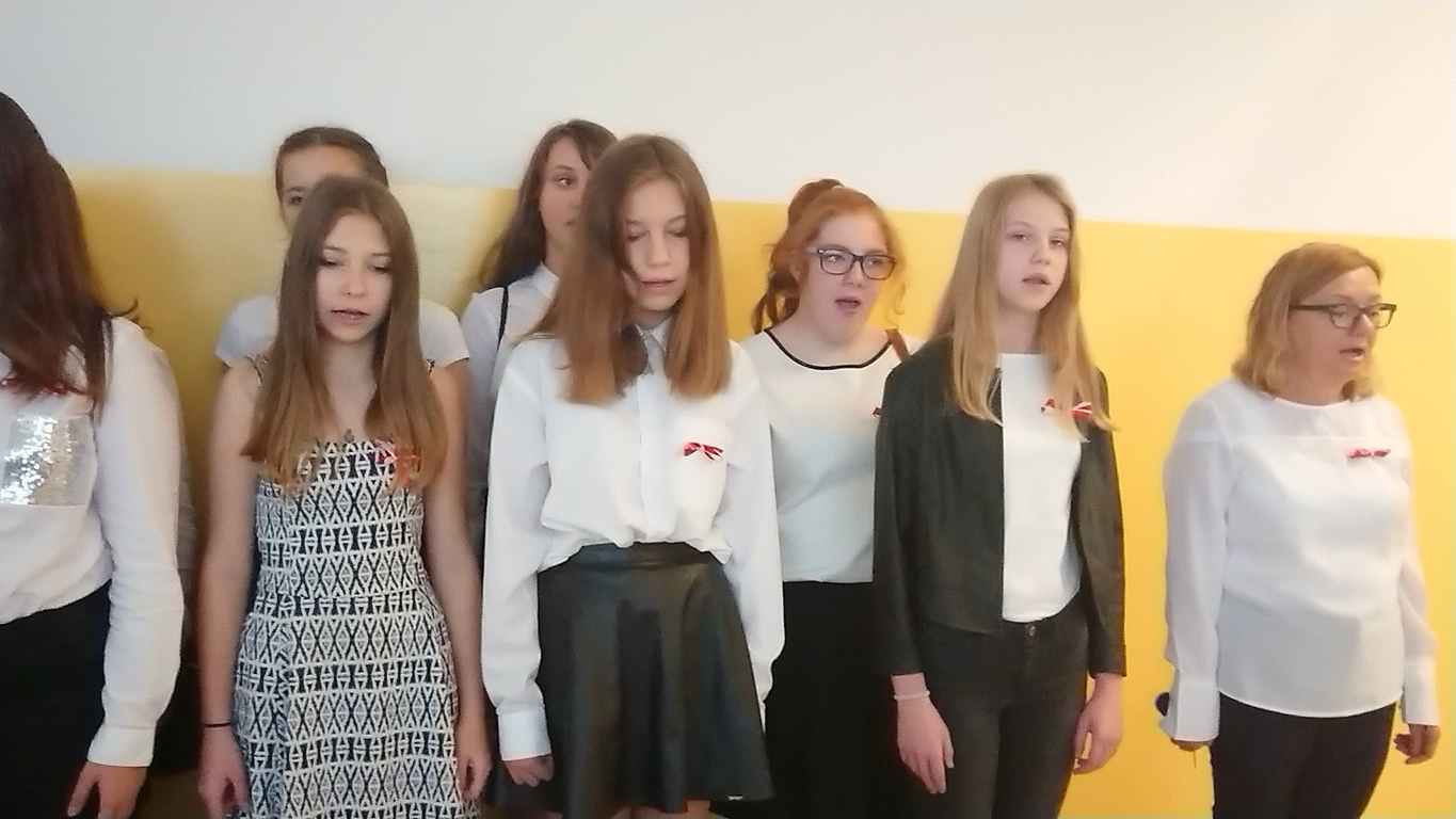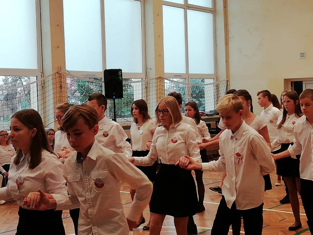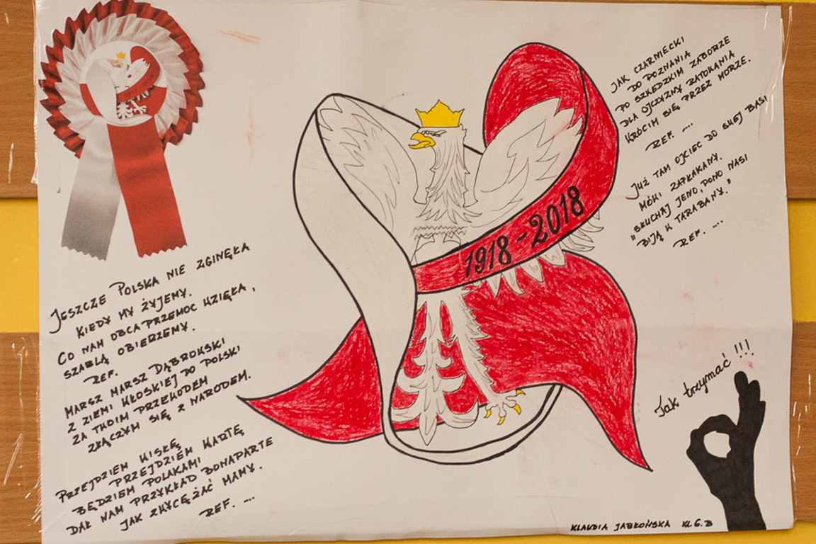 Kolejnym punktem szkolnych uroczystości było wspólne odśpiewanie hymnu. W ramach inicjatywy MEN uczniowie oraz wszyscy pracownicy szkoły zgromadzili się na szkolnych korytarzach, by punktualnie o 11.11 z dumą i powagą na twarzach oraz radością w sercach uczcić najważniejsze święto państwowe czterema zwrotkami „Mazurka Dąbrowskiego”.