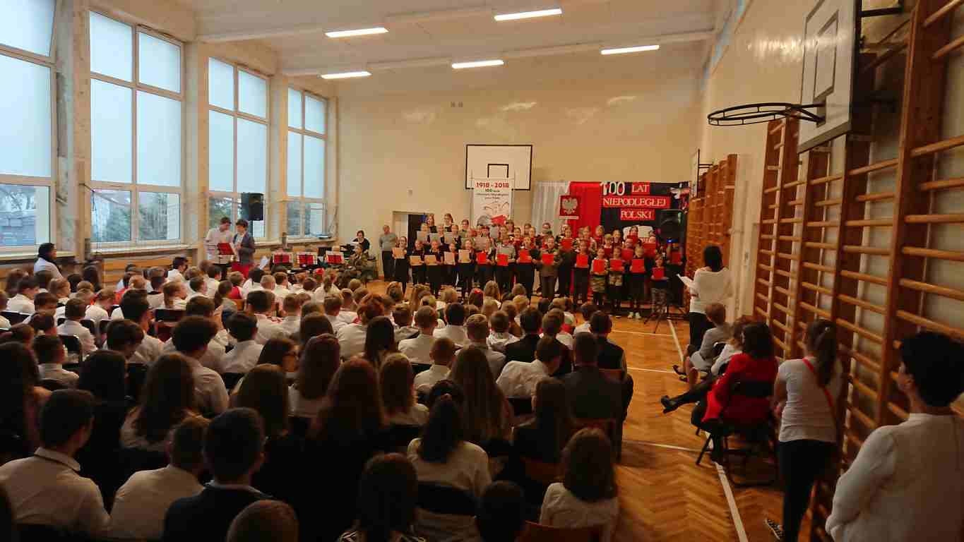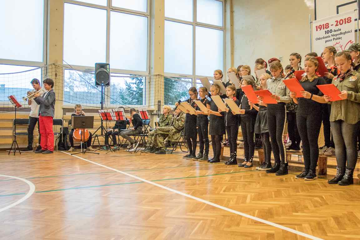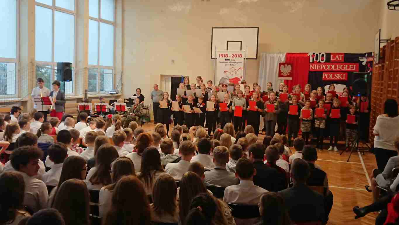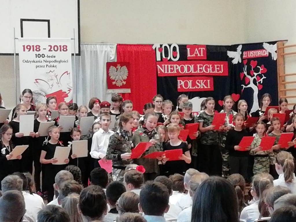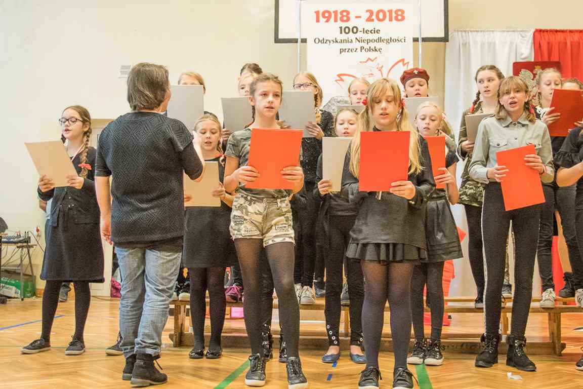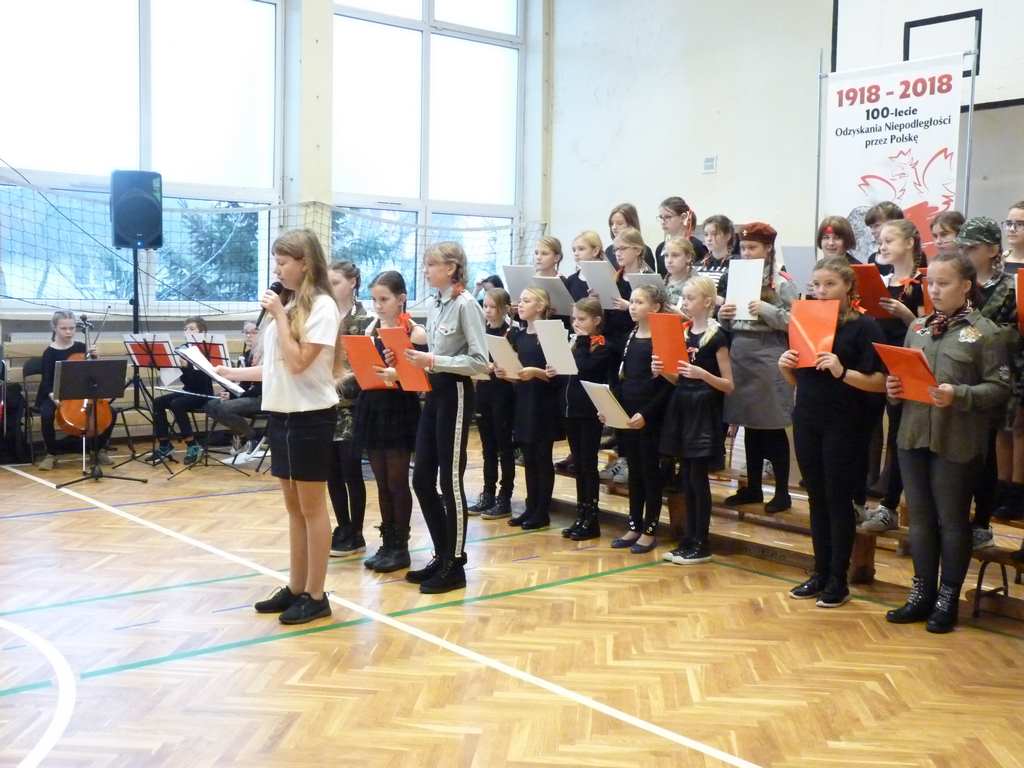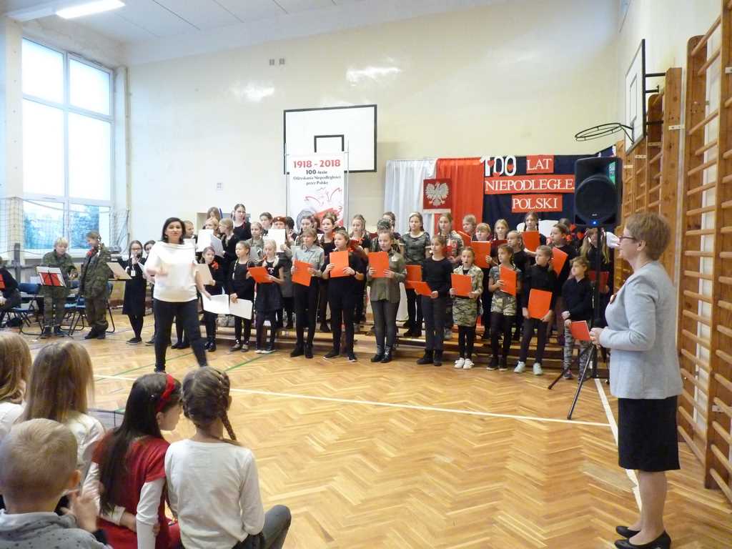 Uwieńczeniem obchodów był koncert „Dla Niepodległej”, podczas którego chór i zespół instrumentalny pod kierunkiem pani Marii Nawrott wykonał sztandarowe pieśni i piosenki patriotyczne, w tym średniowieczne hymny Polski: ”Gaude Mater Polonia” i „Bogurodzicę”. W podniosły nastrój zebranych wprowadzili konferansjerzy i recytatorzy z klasy VIIa. Publiczność zgromadzona na koncercie z wielkim wzruszeniem i zaangażowaniem wtórowała młodym śpiewakom.