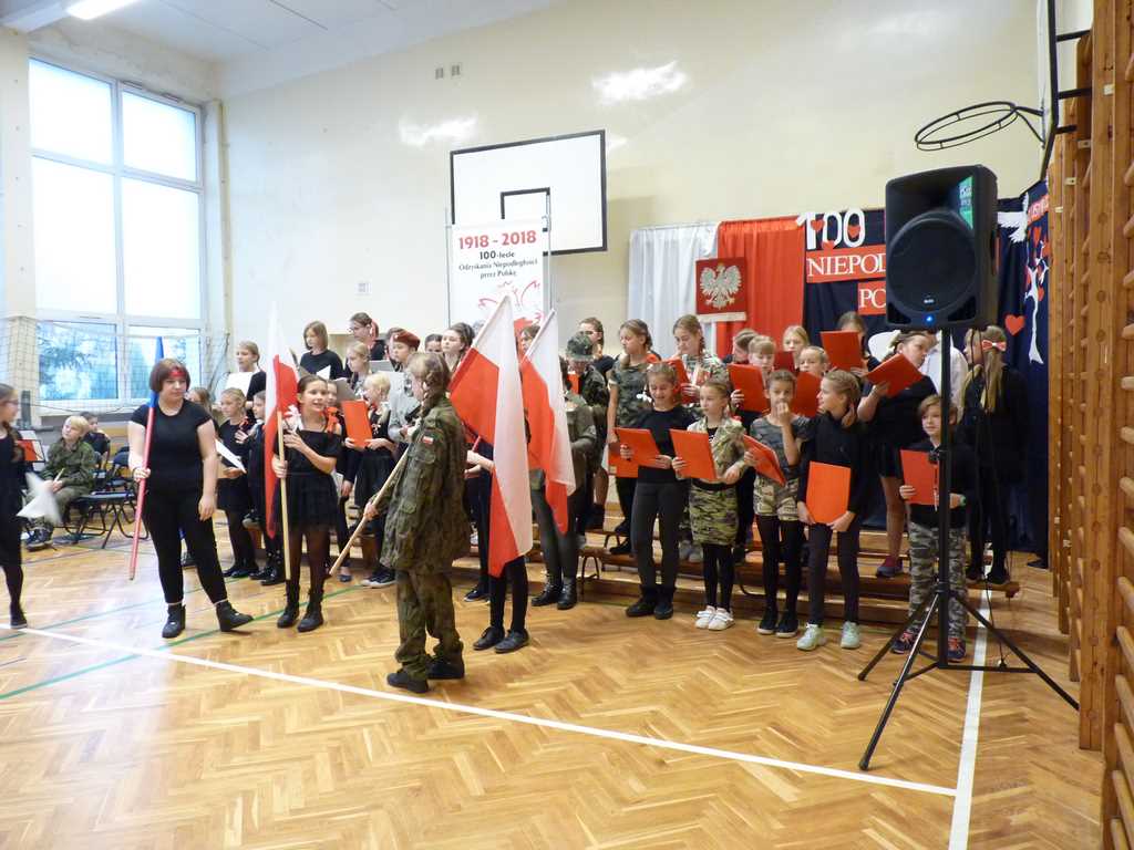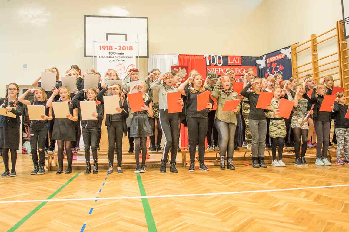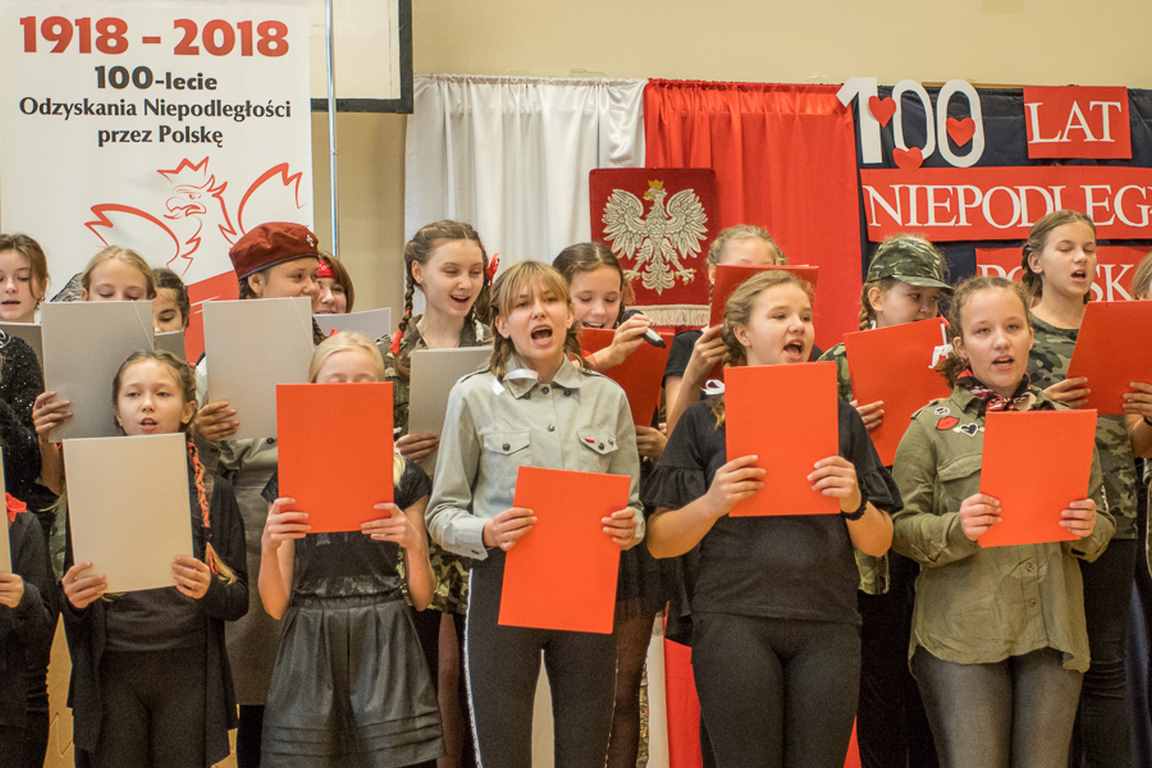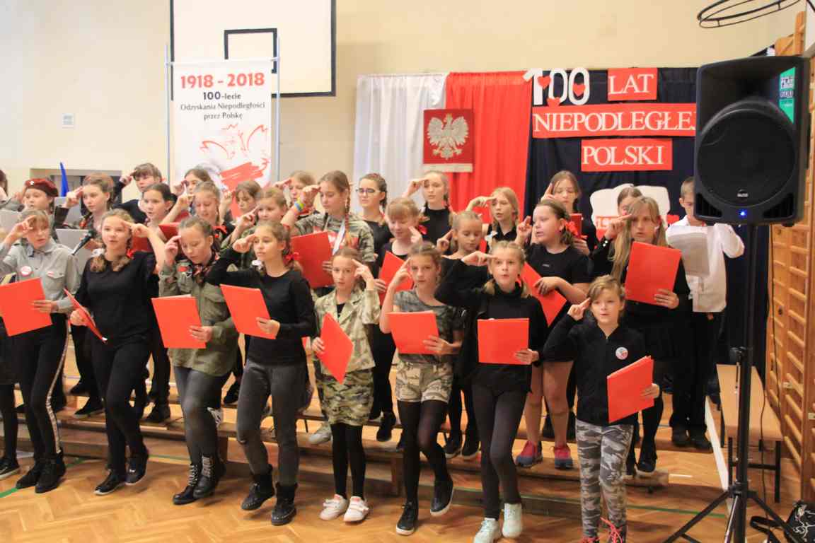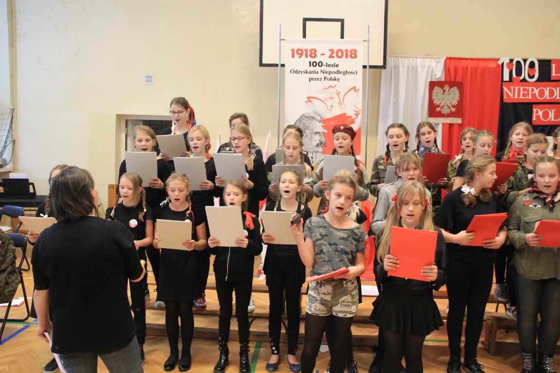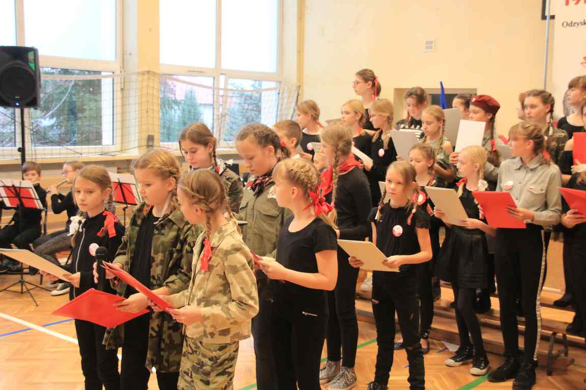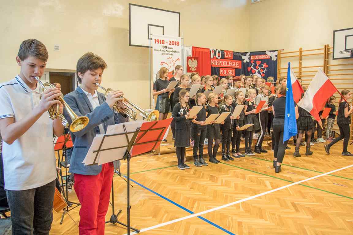 Uwieńczeniem obchodów był koncert „Dla Niepodległej”, podczas którego chór i zespół instrumentalny pod kierunkiem pani Marii Nawrott wykonał sztandarowe pieśni i piosenki patriotyczne, w tym średniowieczne hymny Polski: ”Gaude Mater Polonia” i „Bogurodzicę”. W podniosły nastrój zebranych wprowadzili konferansjerzy i recytatorzy z klasy VIIa. Publiczność zgromadzona na koncercie z wielkim wzruszeniem i zaangażowaniem wtórowała młodym śpiewakom.