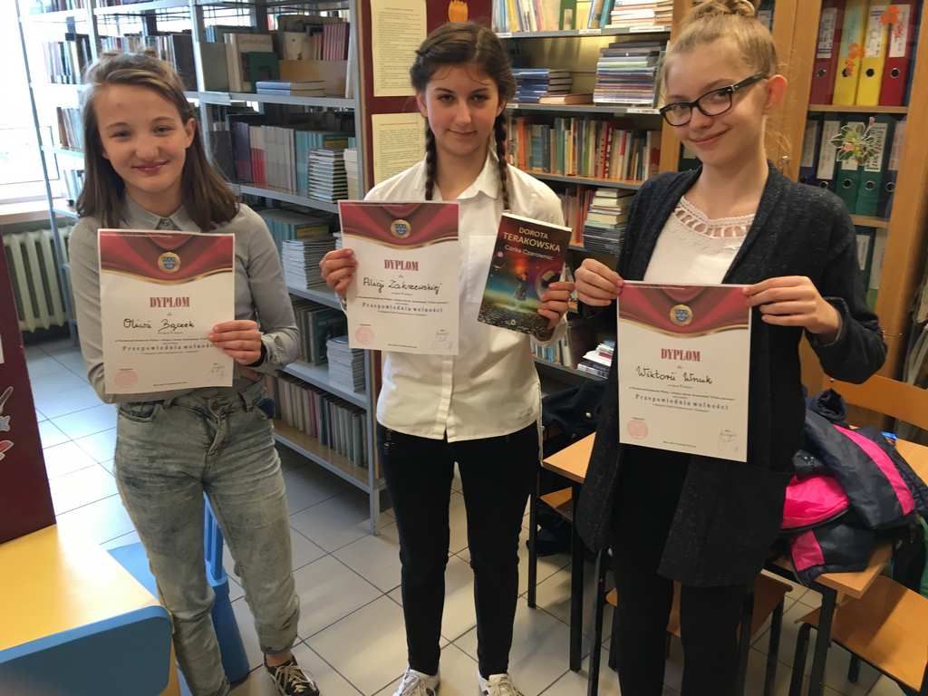 Dnia 27 kwietnia 2018 roku odbył się finał Powiatowego Konkursu Wiedzy o Książce Doroty Terakowskiej „Córka czarownic” – Przepowiednia wolności. Naszą szkołę reprezentowały uczennice: Alicja Zakrzewska z klasy VI a, Wiktoria Wnuk z klasy VI b, Oliwia Bączek z klasy VII a. Dziewczęta stanęły na wysokości zadania i nie zawiodły. Mimo ogromnej konkurencji, poradziły sobie wspaniale, czego dowodem było zajęcie I miejsca i otrzymanie głównej nagrody. Gratulujemy zwycięstwa.