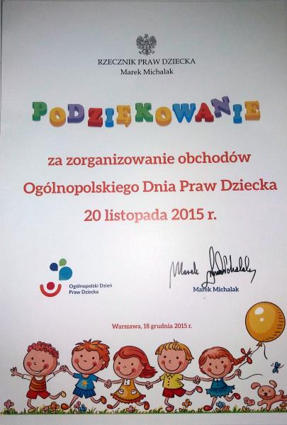 Za zorganizowanie obchodów w/w dnia otrzymaliśmy od Rzecznika Praw Dziecka p. Marka Michalak pamiątkowy dyplom oraz książkę "Mam prawo i nie zawaham się go użyć!" autorstwa Joanny Olech, Edgara Bąk.