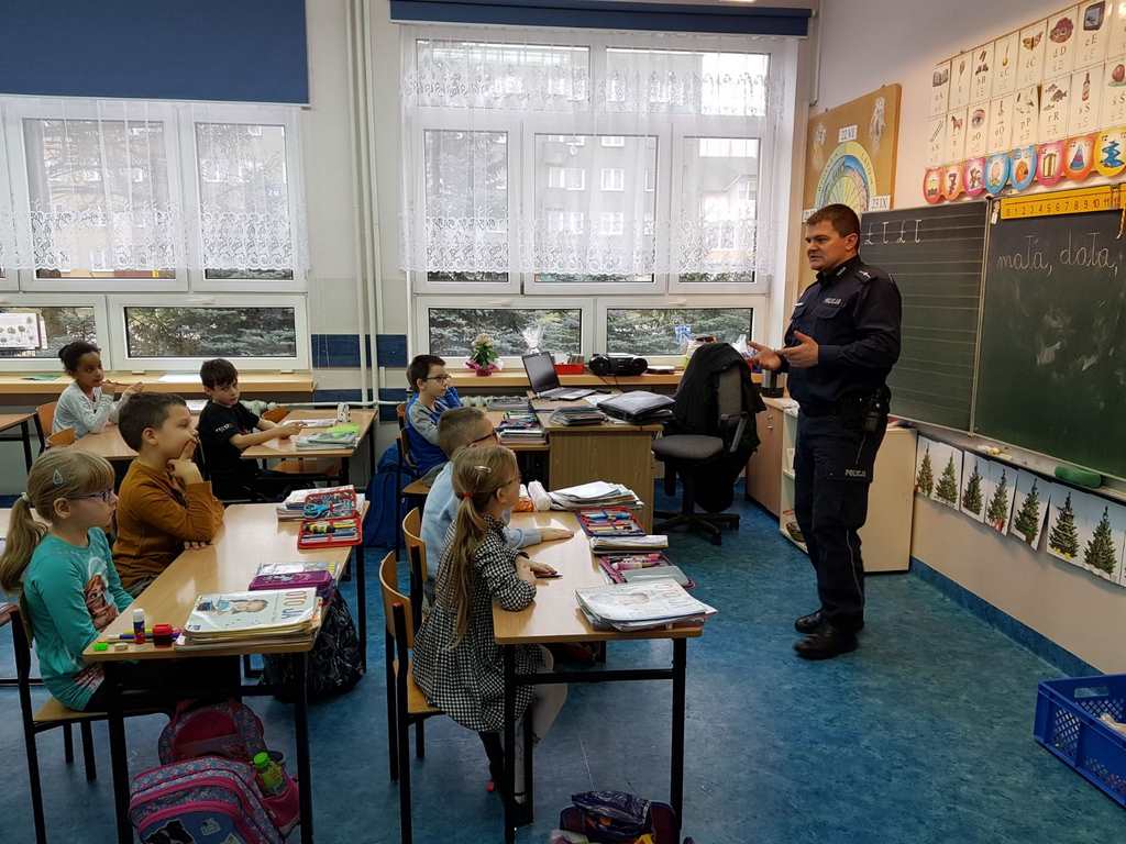 „Jak bezpiecznie spędzić ferie” – spotkanie z policjantem uczniów klas I-III