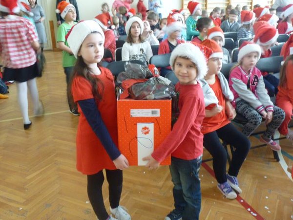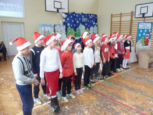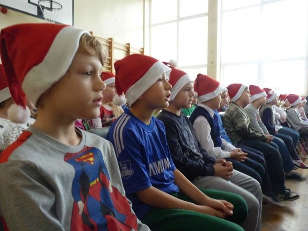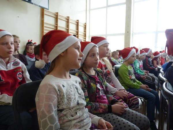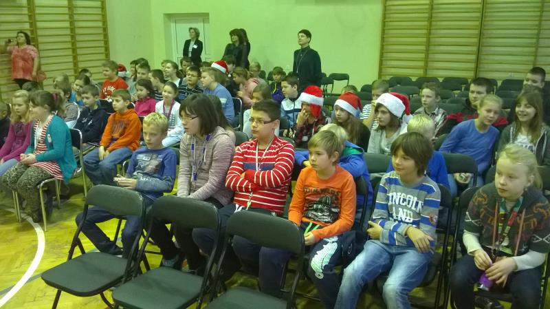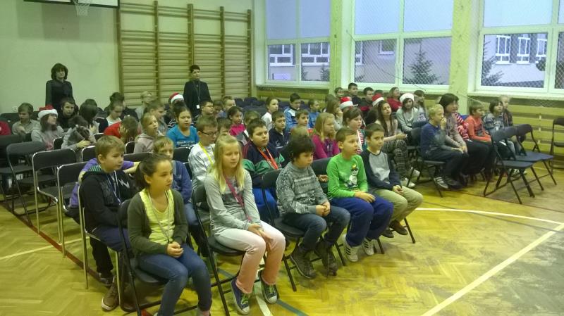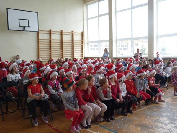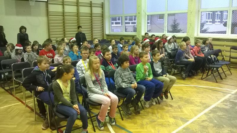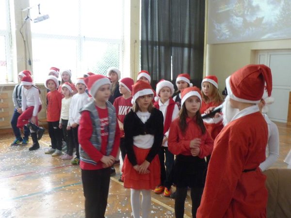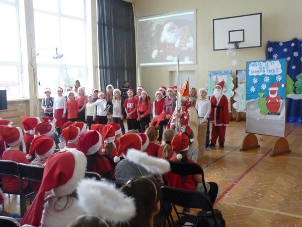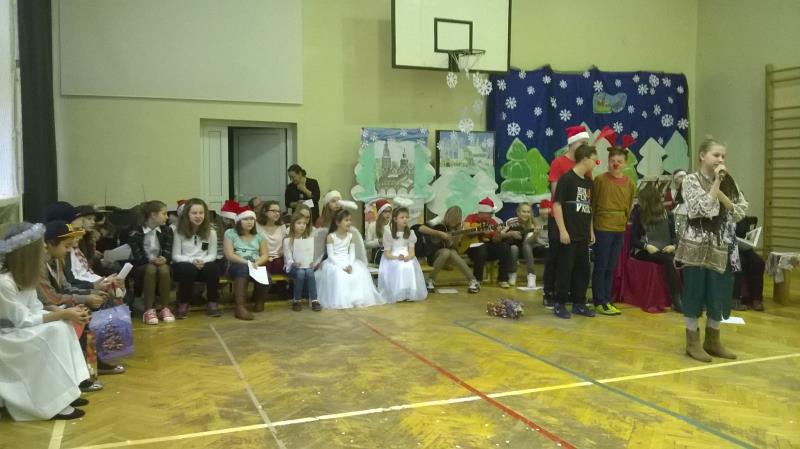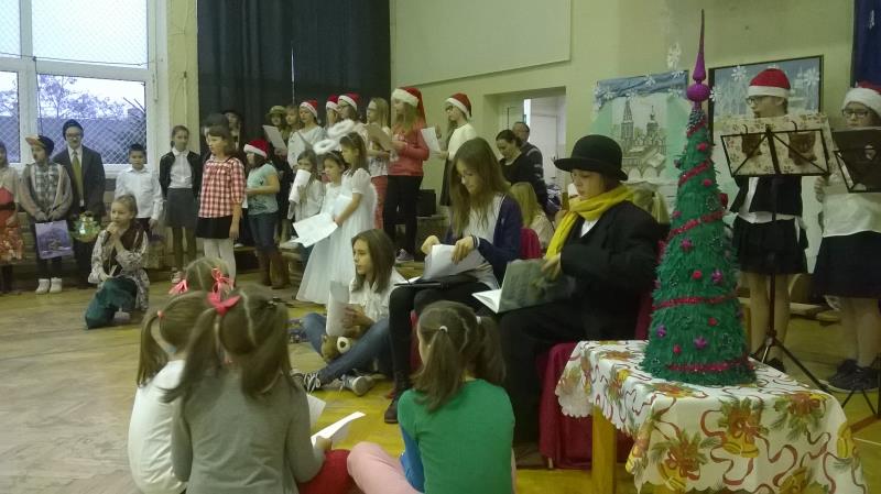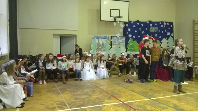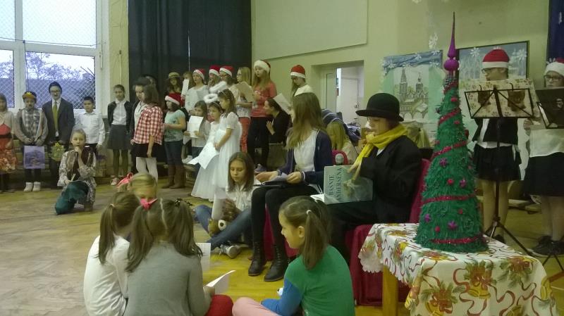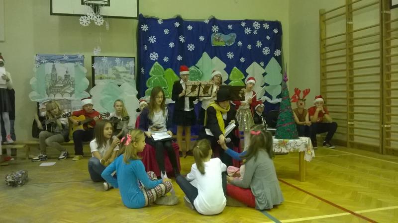 Dla klas IV-VI wystąpił chór szkolny wraz z zespołem wokalno-instrumentalnym pod opieką p. Marii Nawrott dostarczając widzom wielu radości i wzruszeń w krótkim przedstawieniu Dziewczynka z zapałkami. Zespól wykonał kilka piosenek zimowych w humorystycznej scenografii. Niespodziewanie przybył też do nas Święty Mikołaj w obecności kilku niebiańskich pomocników. Ku wielkiej radości wszystkich dzieci, Święty miał ze sobą prezenty! Każda klasa otrzymała wielką paczkę, aby móc w tym dniu dalej ze swym wychowawcą świętować.