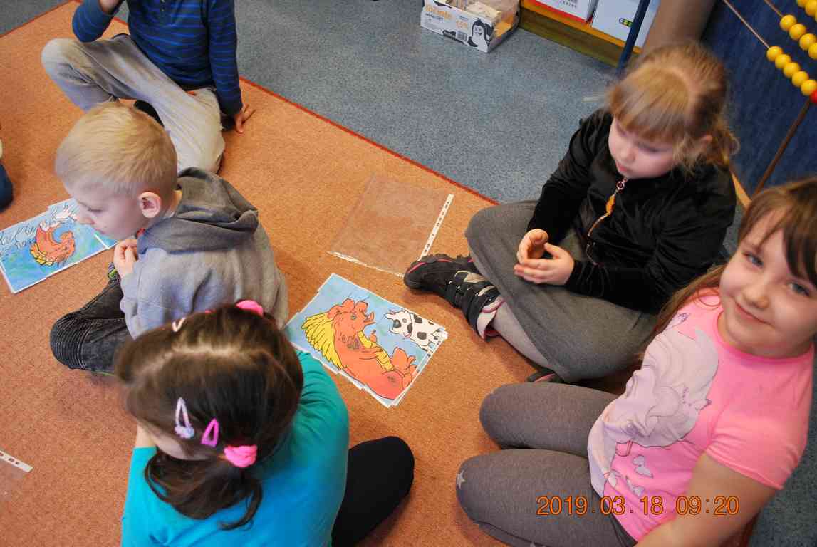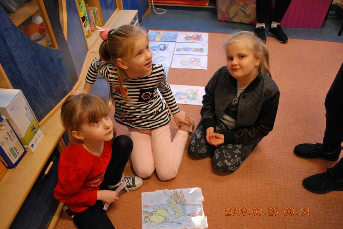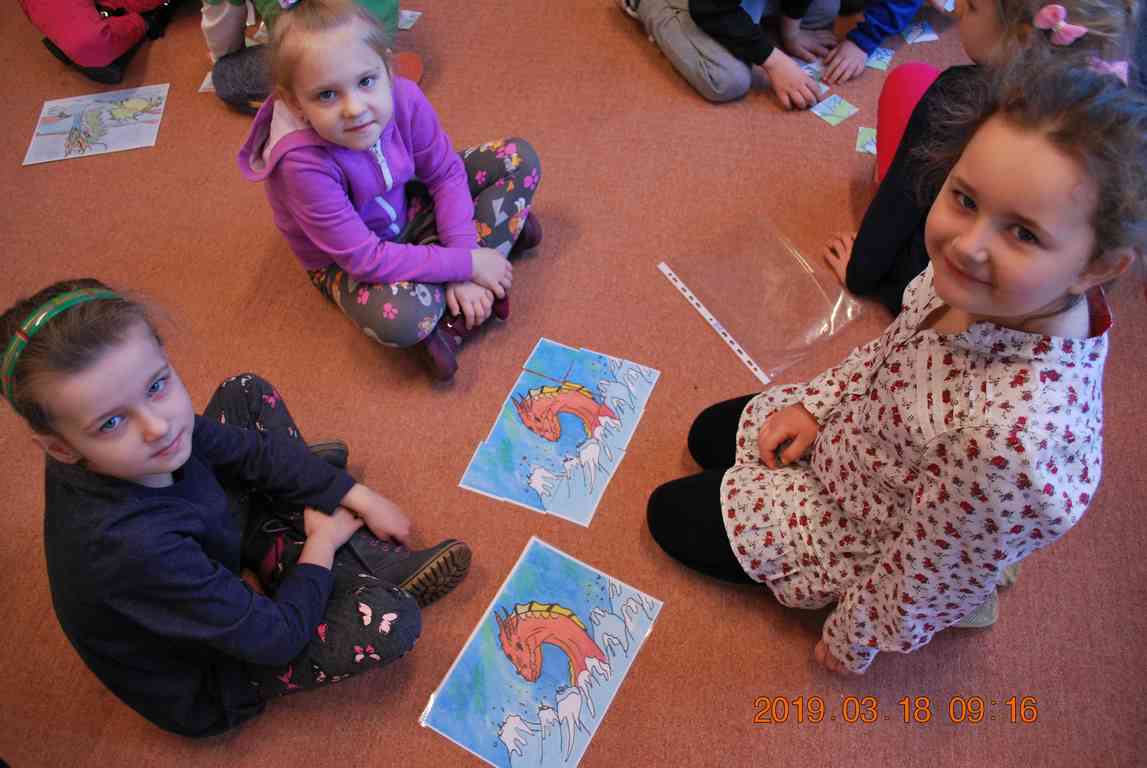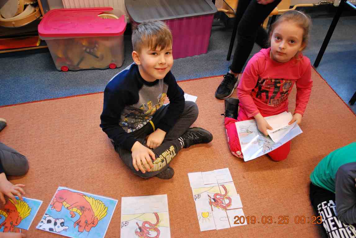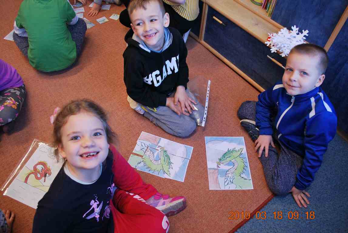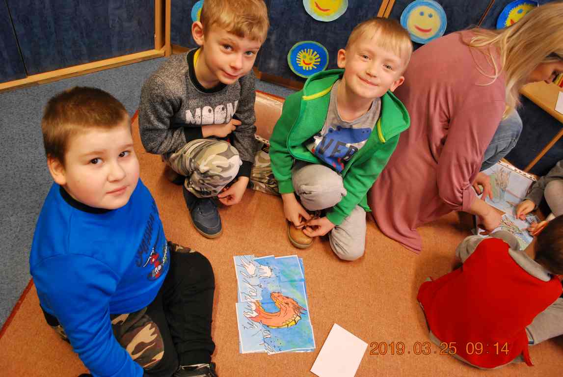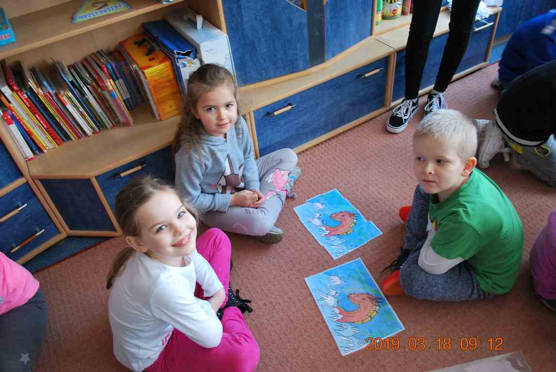 Na początku spotkania przedszkolaki wysłuchały z ogromną uwagą i zainteresowaniem „Legendy o Smokach Jeziorakowych” autorstwa Natalii Brzozowskiej - uczennicy klasy 7a. Zaciekawienie i zaangażowanie towarzyszyły małym gościom przy wykonywaniu kolejnych zadań, które związane były z wcześniej poznaną historią o potworach. Puzzle, kolorowanki, zgadywanki, a także zabawę muzyczną przygotowali uczniowie z klasy 7a, niezwykle zaangażowani w ten projekt.