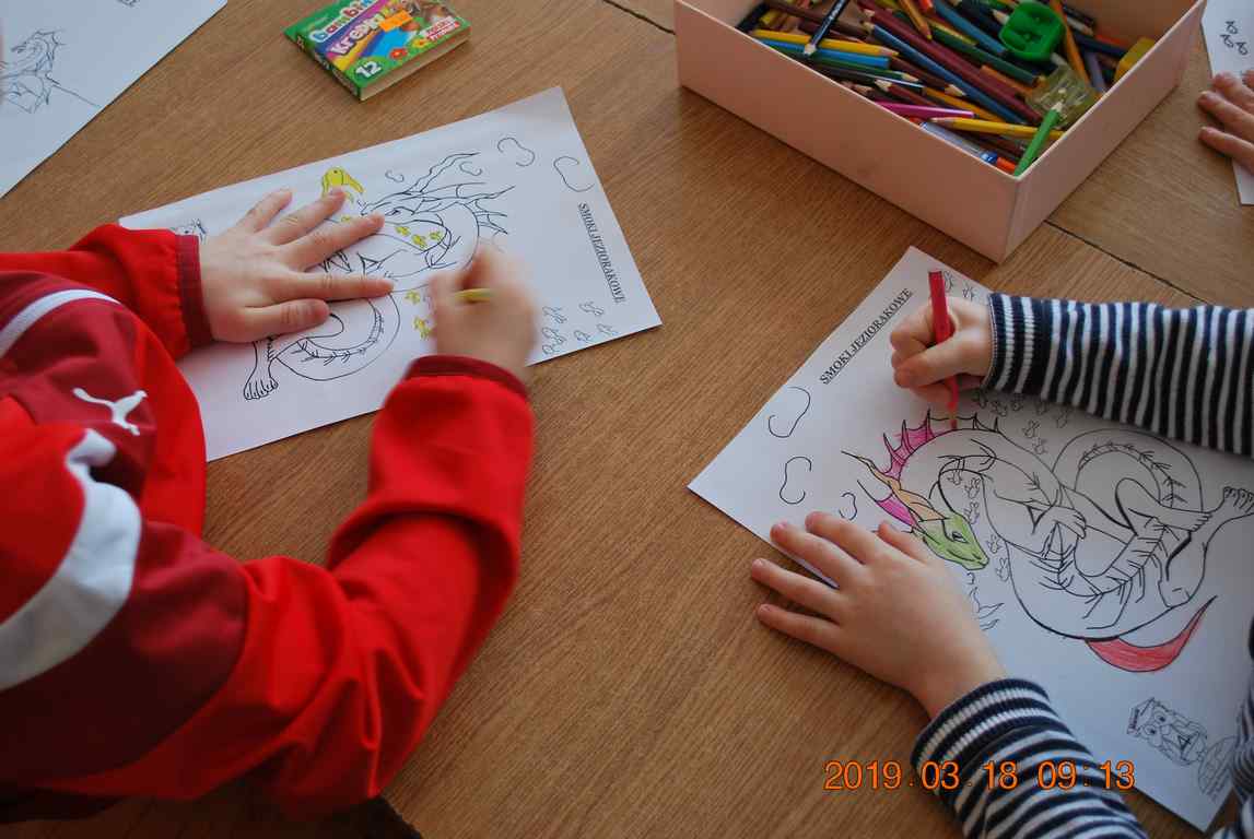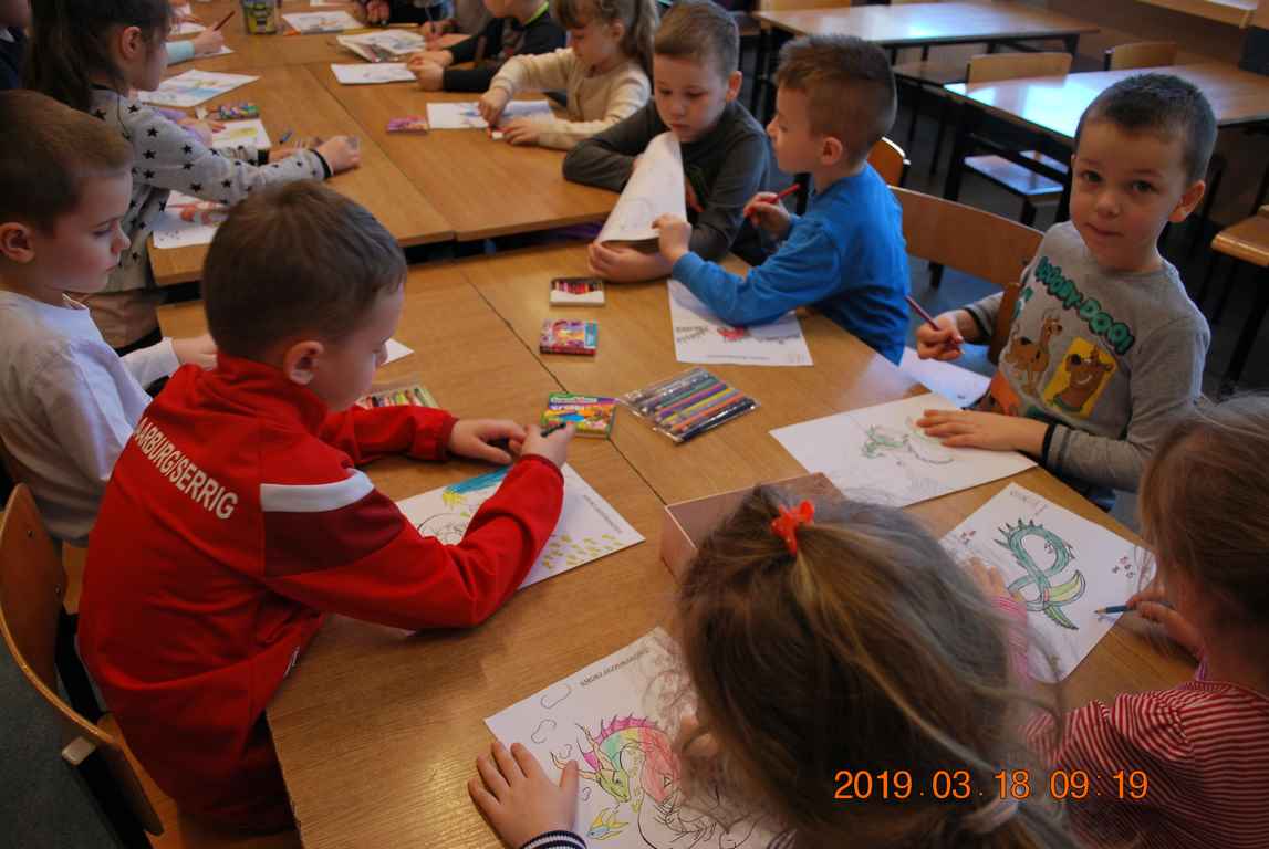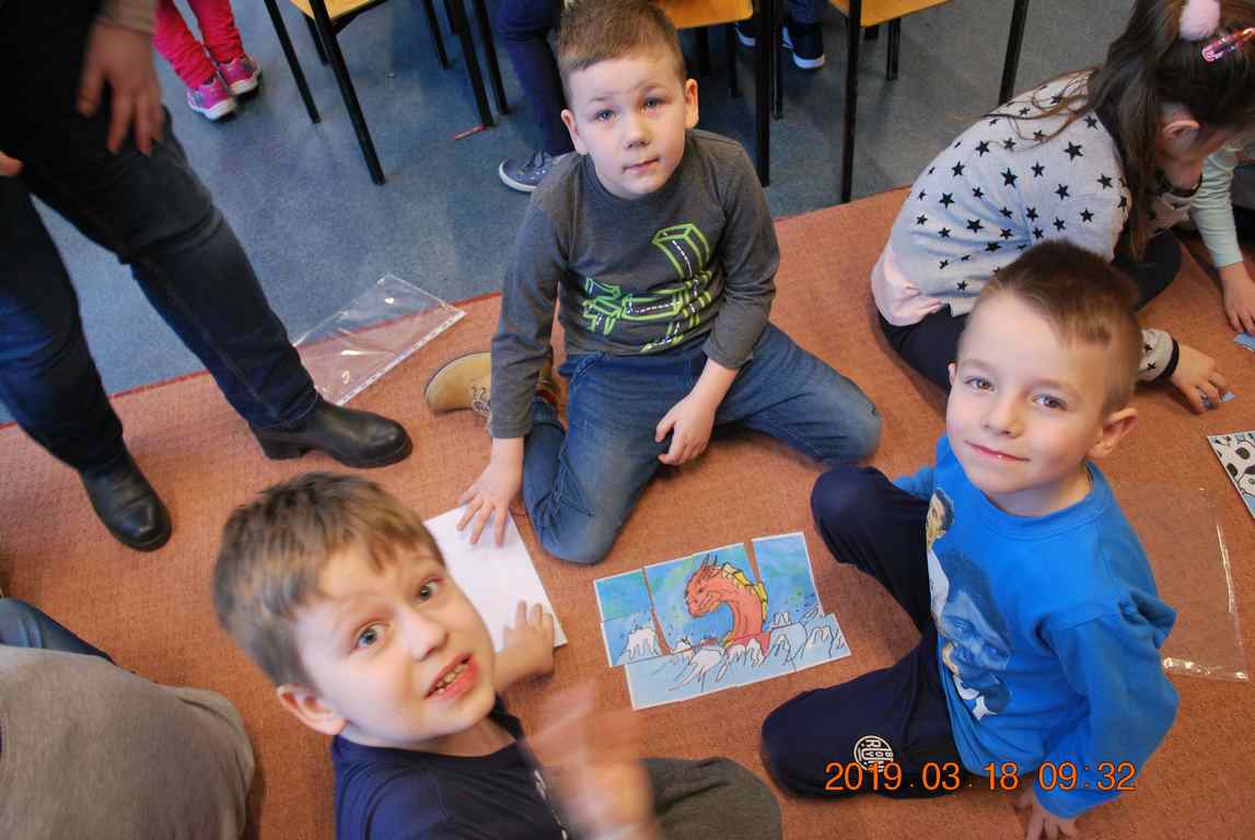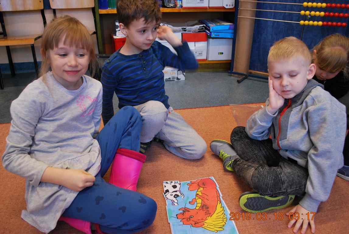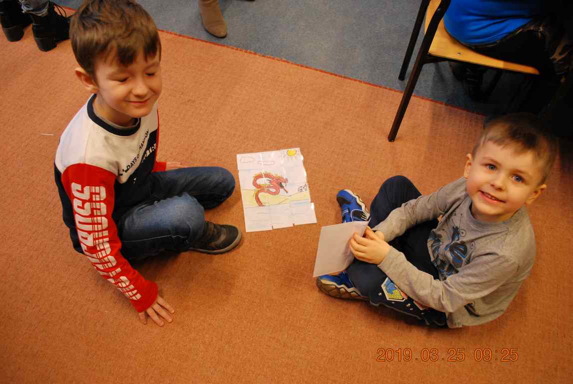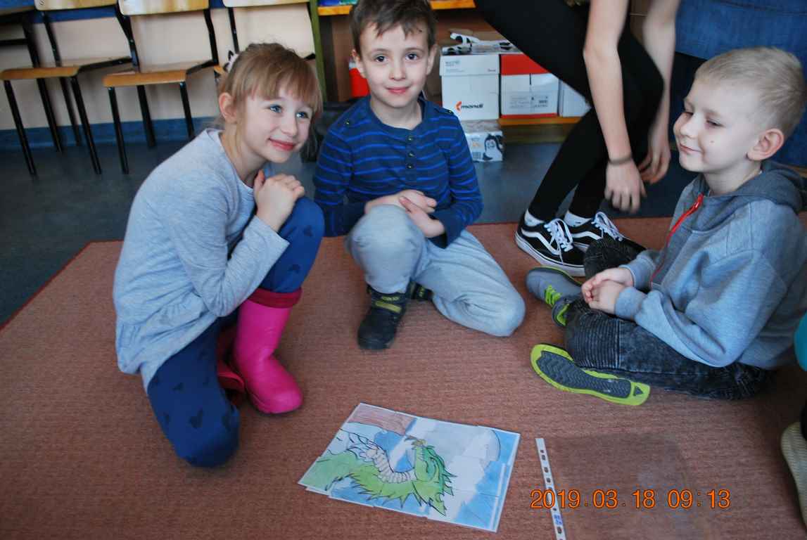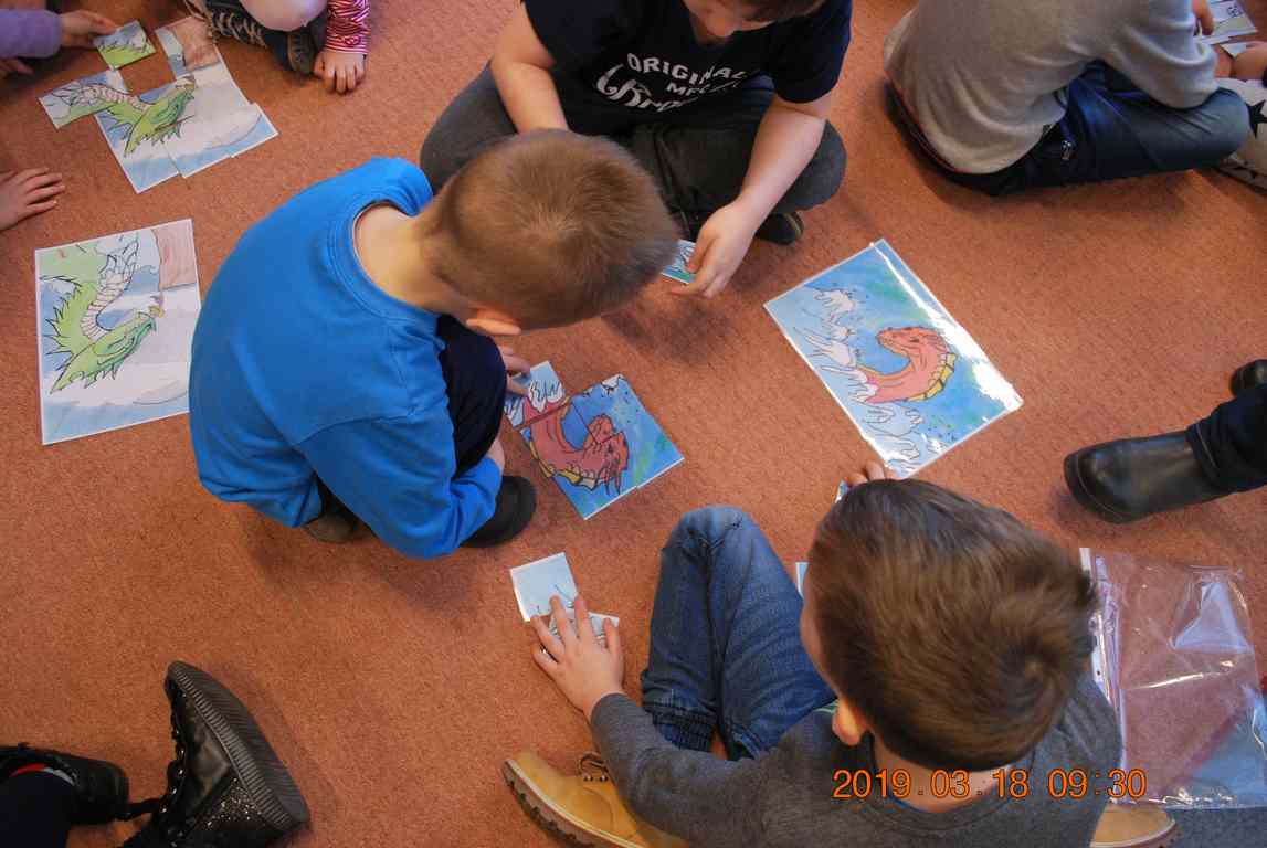 Na początku spotkania przedszkolaki wysłuchały z ogromną uwagą i zainteresowaniem „Legendy o Smokach Jeziorakowych” autorstwa Natalii Brzozowskiej - uczennicy klasy 7a. Zaciekawienie i zaangażowanie towarzyszyły małym gościom przy wykonywaniu kolejnych zadań, które związane były z wcześniej poznaną historią o potworach. Puzzle, kolorowanki, zgadywanki, a także zabawę muzyczną przygotowali uczniowie z klasy 7a, niezwykle zaangażowani w ten projekt.