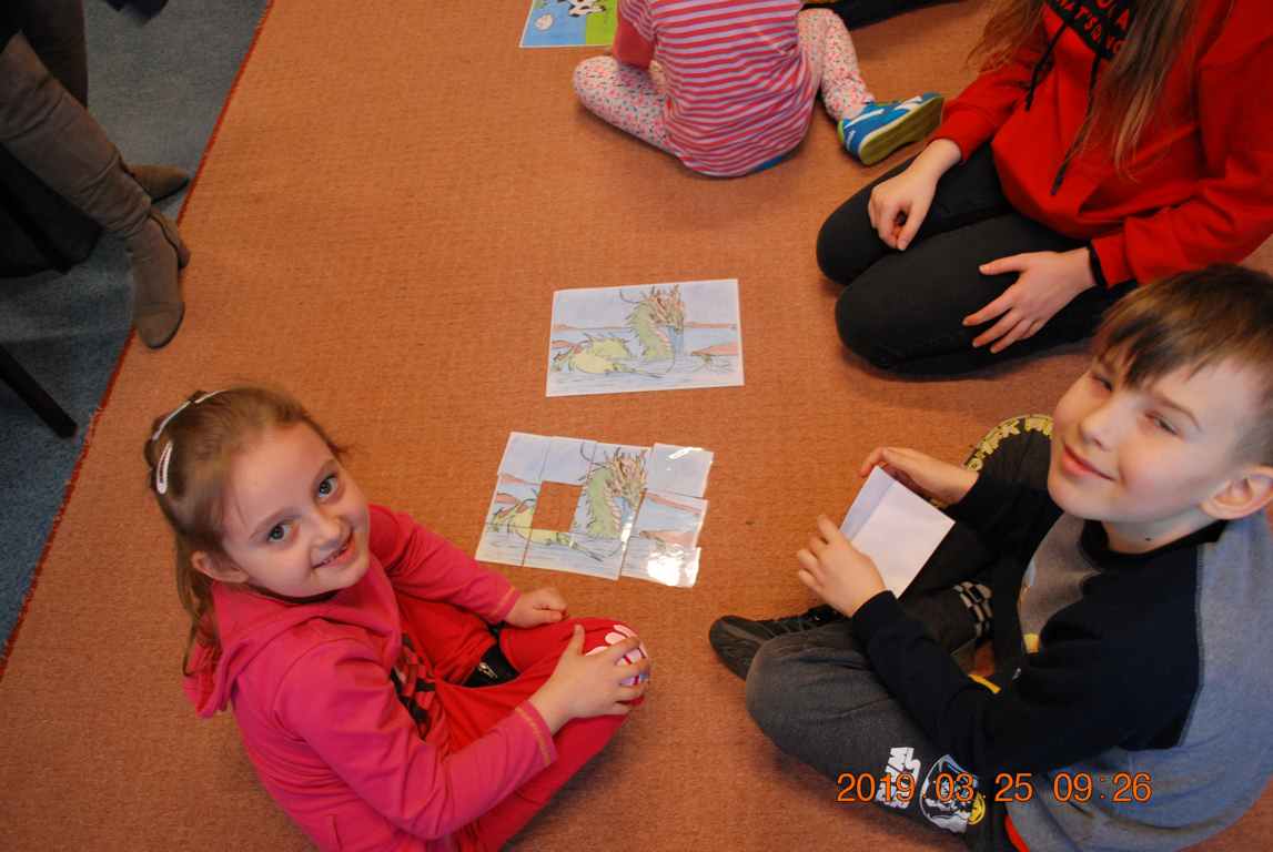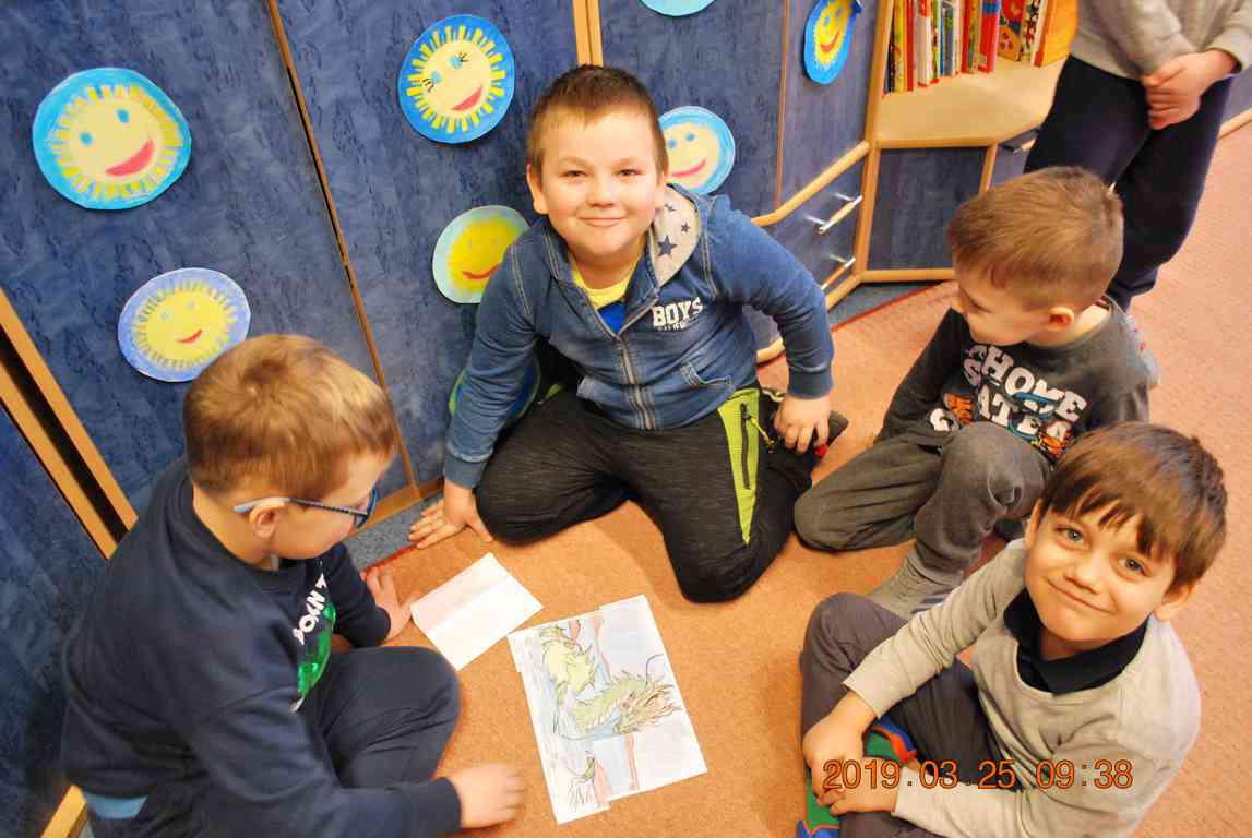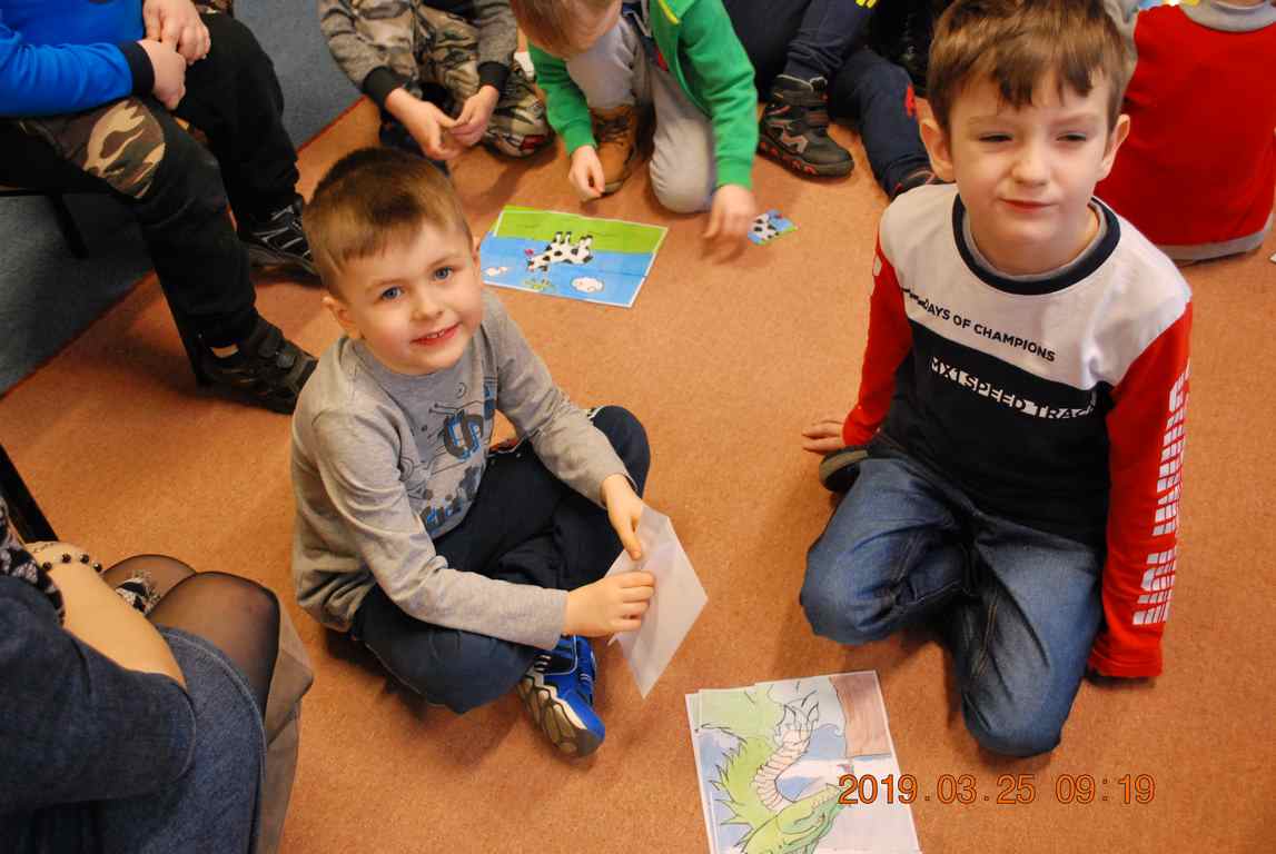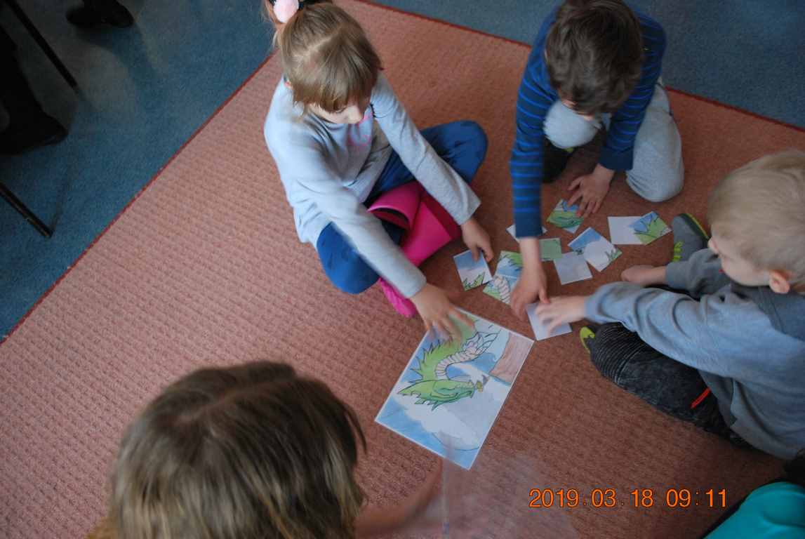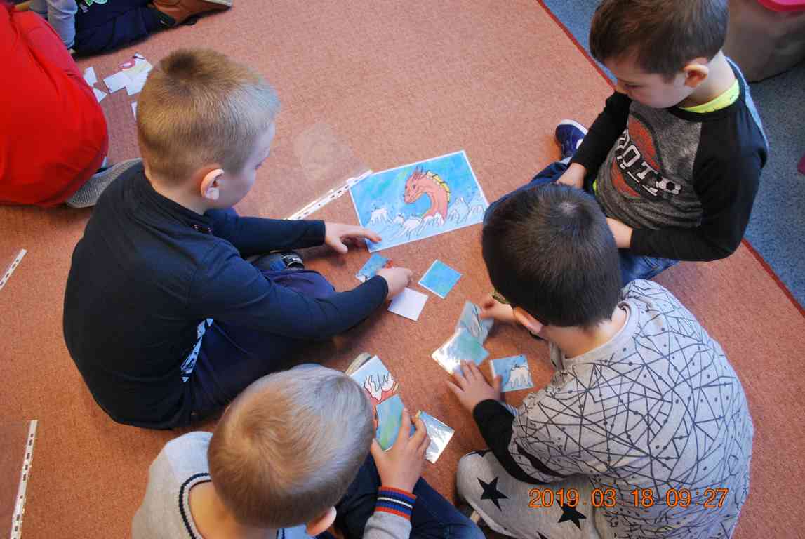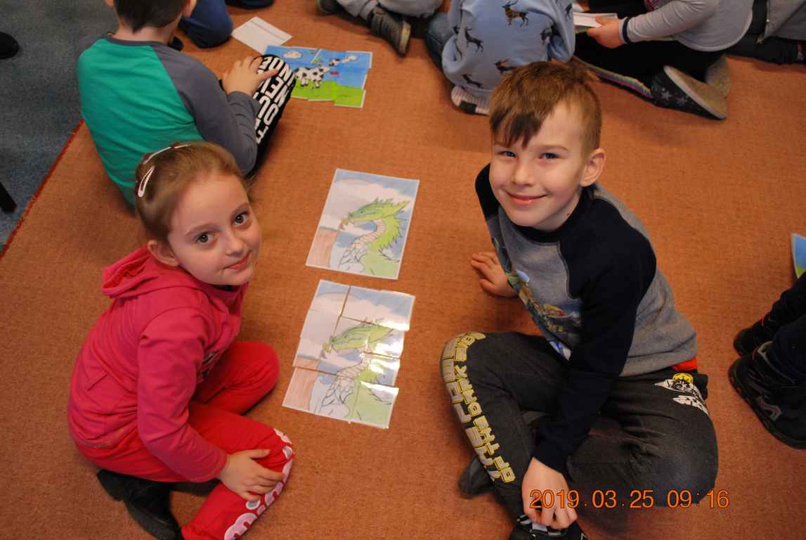 Na początku spotkania przedszkolaki wysłuchały z ogromną uwagą i zainteresowaniem „Legendy o Smokach Jeziorakowych” autorstwa Natalii Brzozowskiej - uczennicy klasy 7a. Zaciekawienie i zaangażowanie towarzyszyły małym gościom przy wykonywaniu kolejnych zadań, które związane były z wcześniej poznaną historią o potworach. Puzzle, kolorowanki, zgadywanki, a także zabawę muzyczną przygotowali uczniowie z klasy 7a, niezwykle zaangażowani w ten projekt.