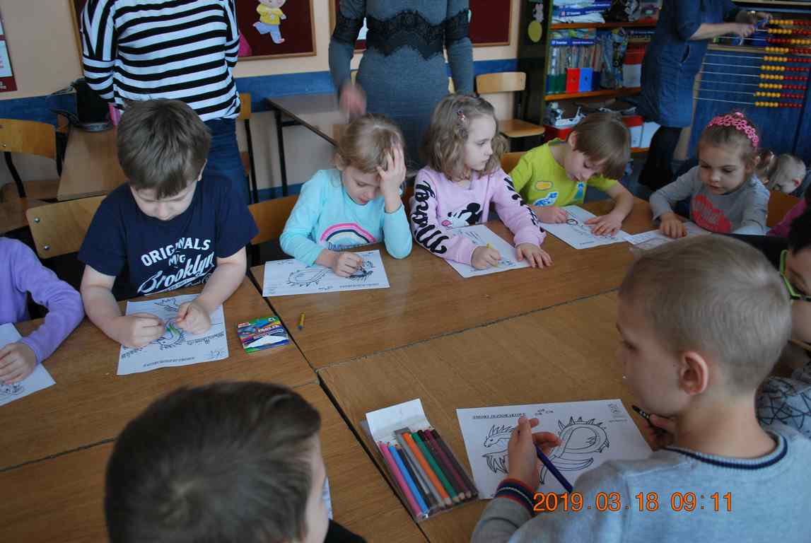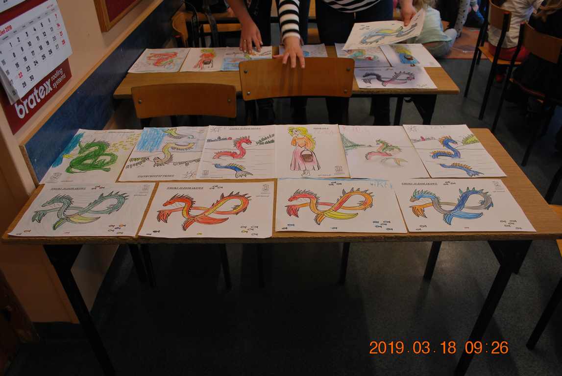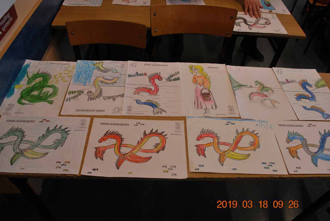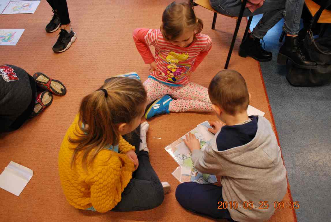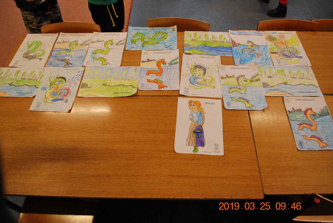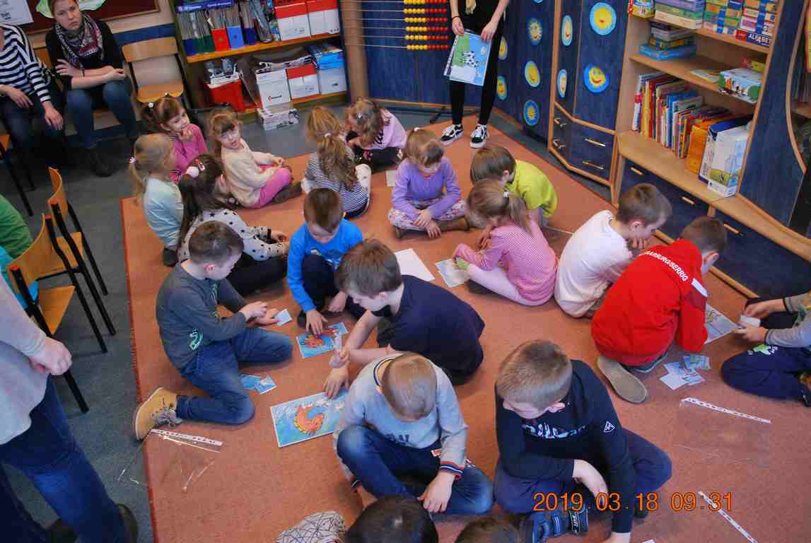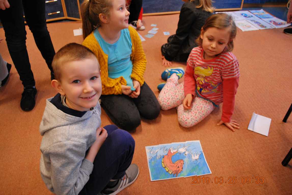 Na początku spotkania przedszkolaki wysłuchały z ogromną uwagą i zainteresowaniem „Legendy o Smokach Jeziorakowych” autorstwa Natalii Brzozowskiej - uczennicy klasy 7a. Zaciekawienie i zaangażowanie towarzyszyły małym gościom przy wykonywaniu kolejnych zadań, które związane były z wcześniej poznaną historią o potworach. Puzzle, kolorowanki, zgadywanki, a także zabawę muzyczną przygotowali uczniowie z klasy 7a, niezwykle zaangażowani w ten projekt.
