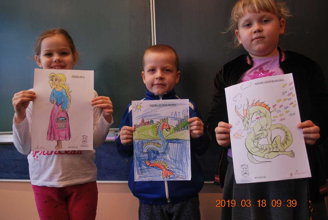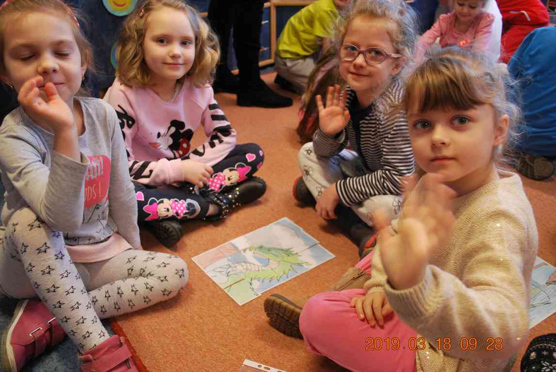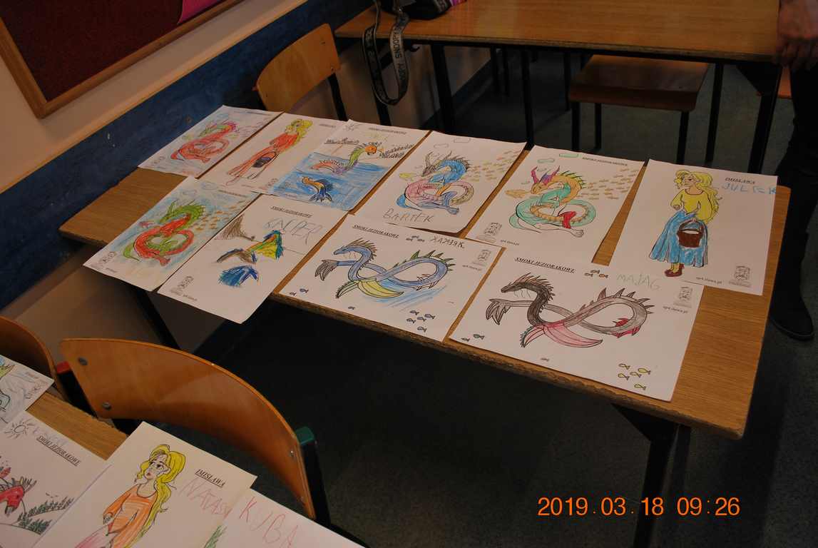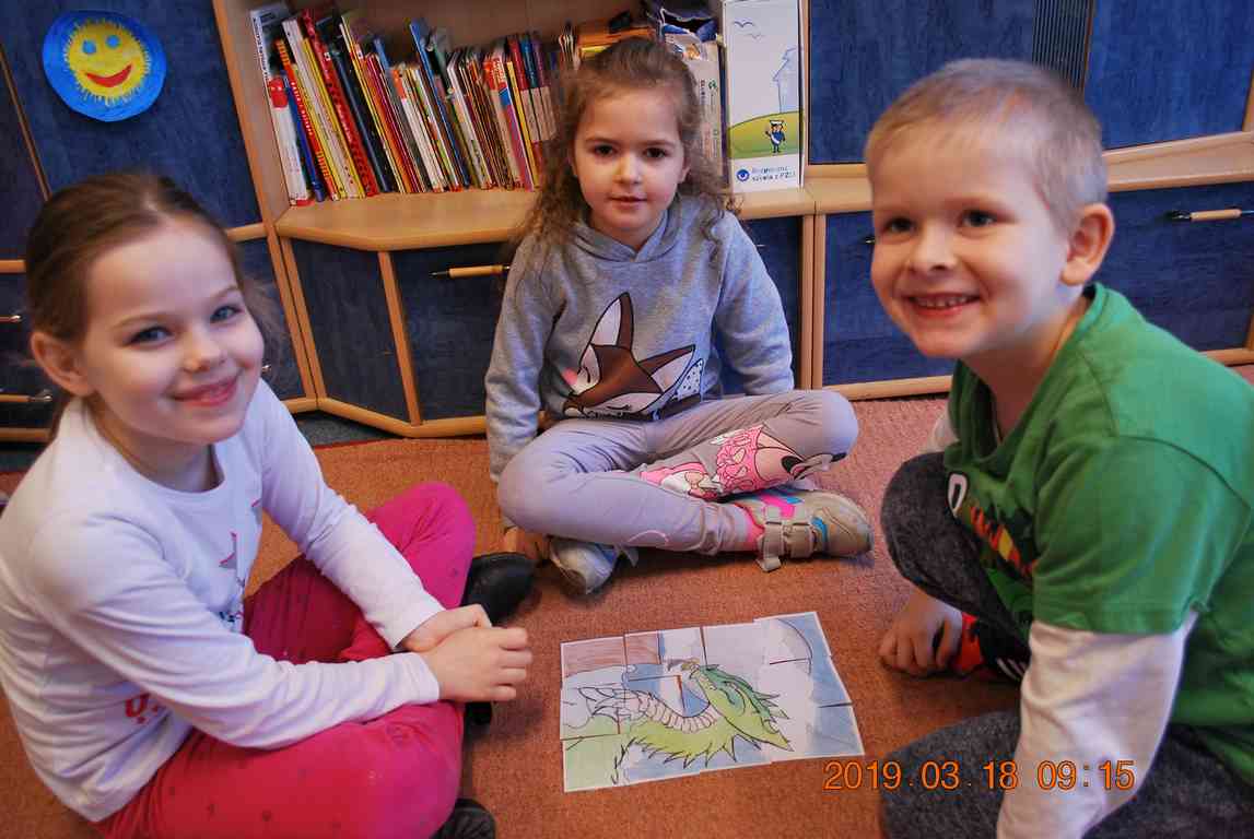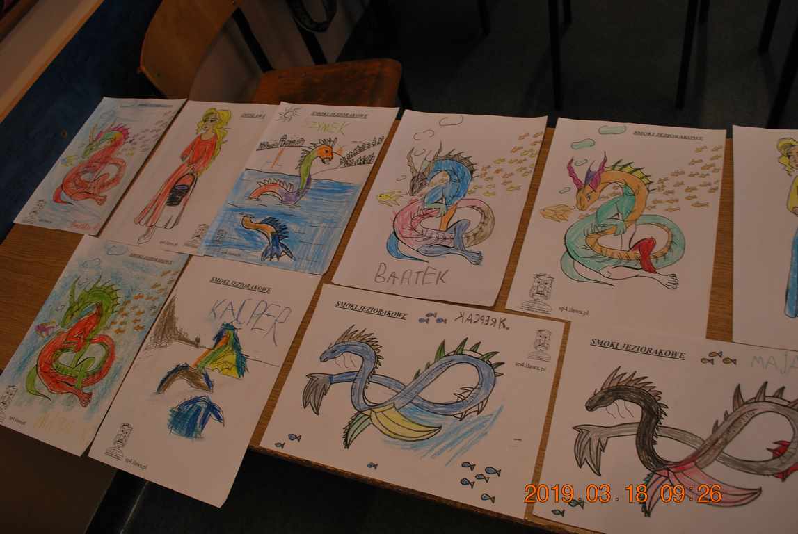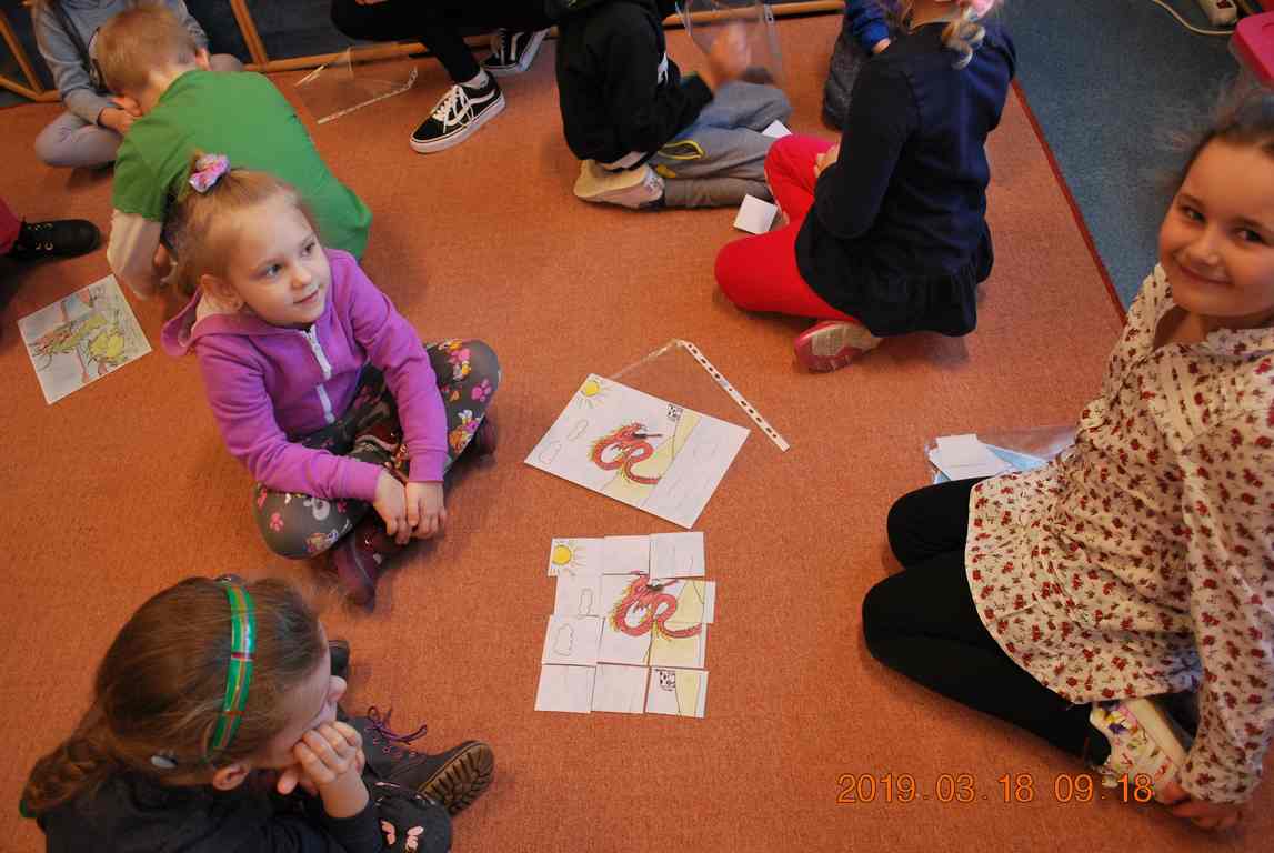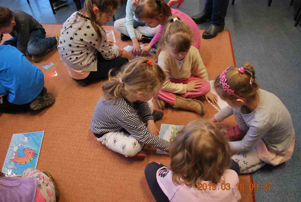 Na początku spotkania przedszkolaki wysłuchały z ogromną uwagą i zainteresowaniem „Legendy o Smokach Jeziorakowych” autorstwa Natalii Brzozowskiej - uczennicy klasy 7a. Zaciekawienie i zaangażowanie towarzyszyły małym gościom przy wykonywaniu kolejnych zadań, które związane były z wcześniej poznaną historią o potworach. Puzzle, kolorowanki, zgadywanki, a także zabawę muzyczną przygotowali uczniowie z klasy 7a, niezwykle zaangażowani w ten projekt.