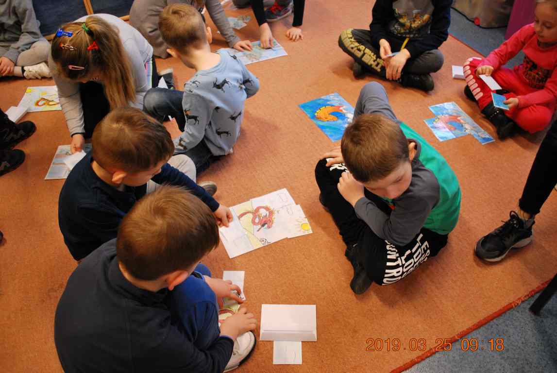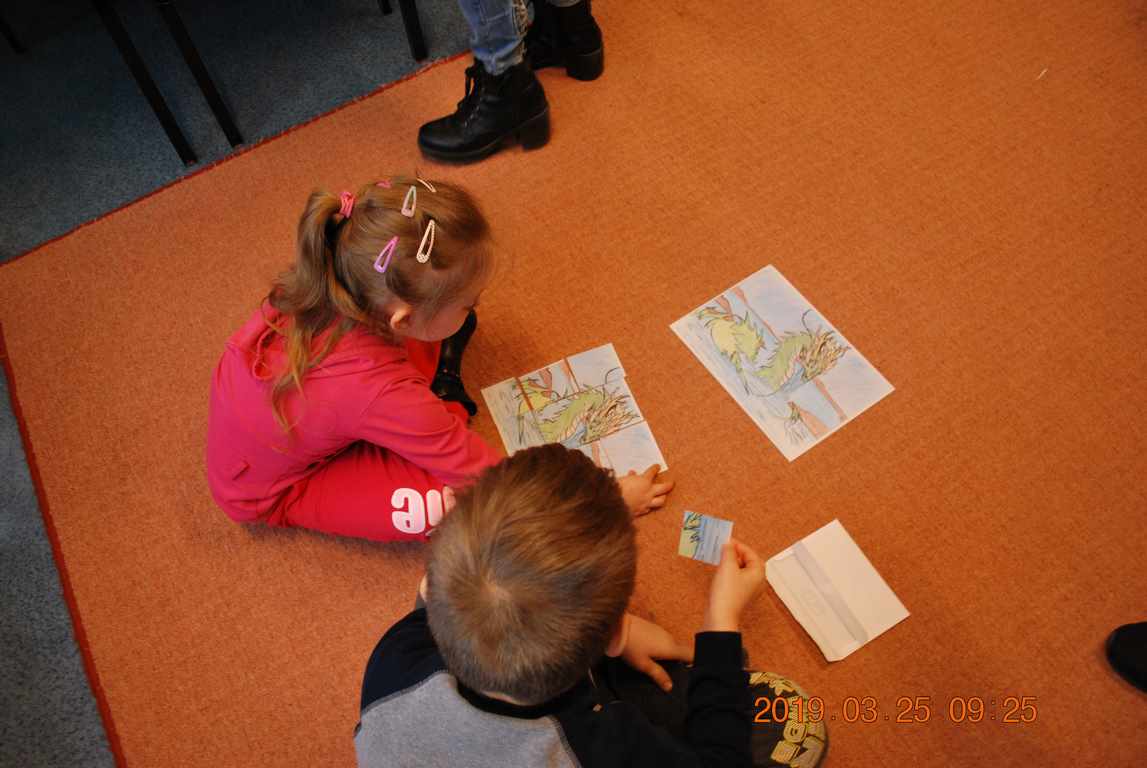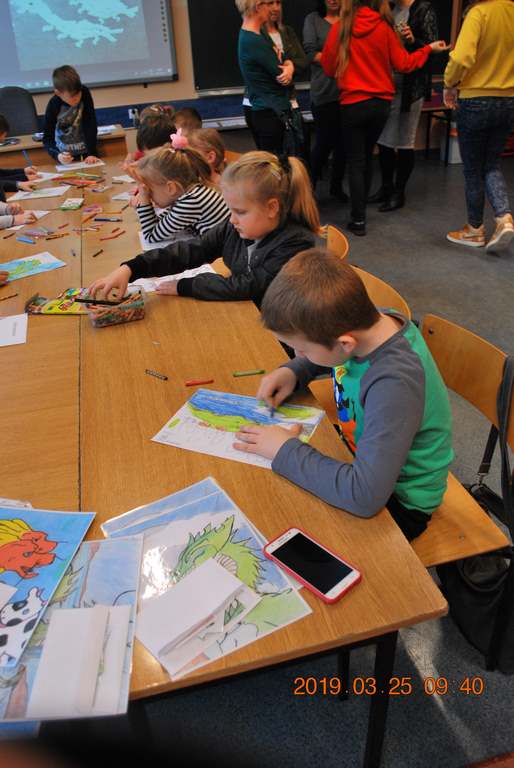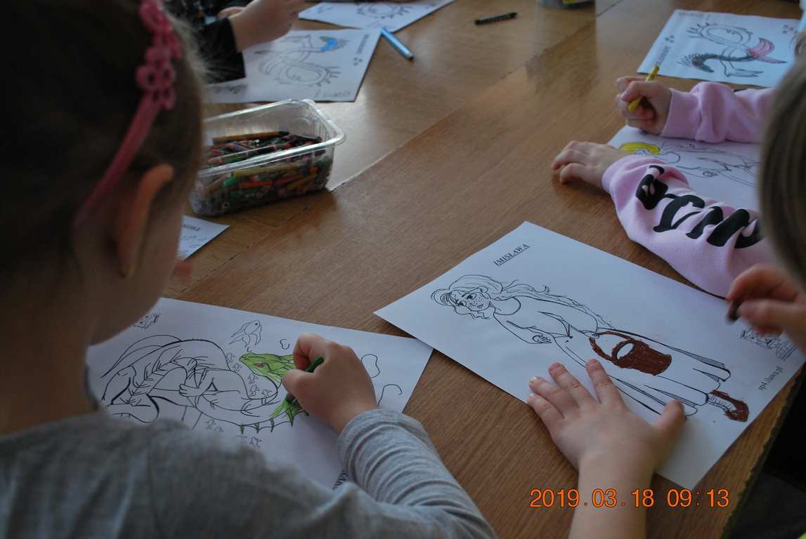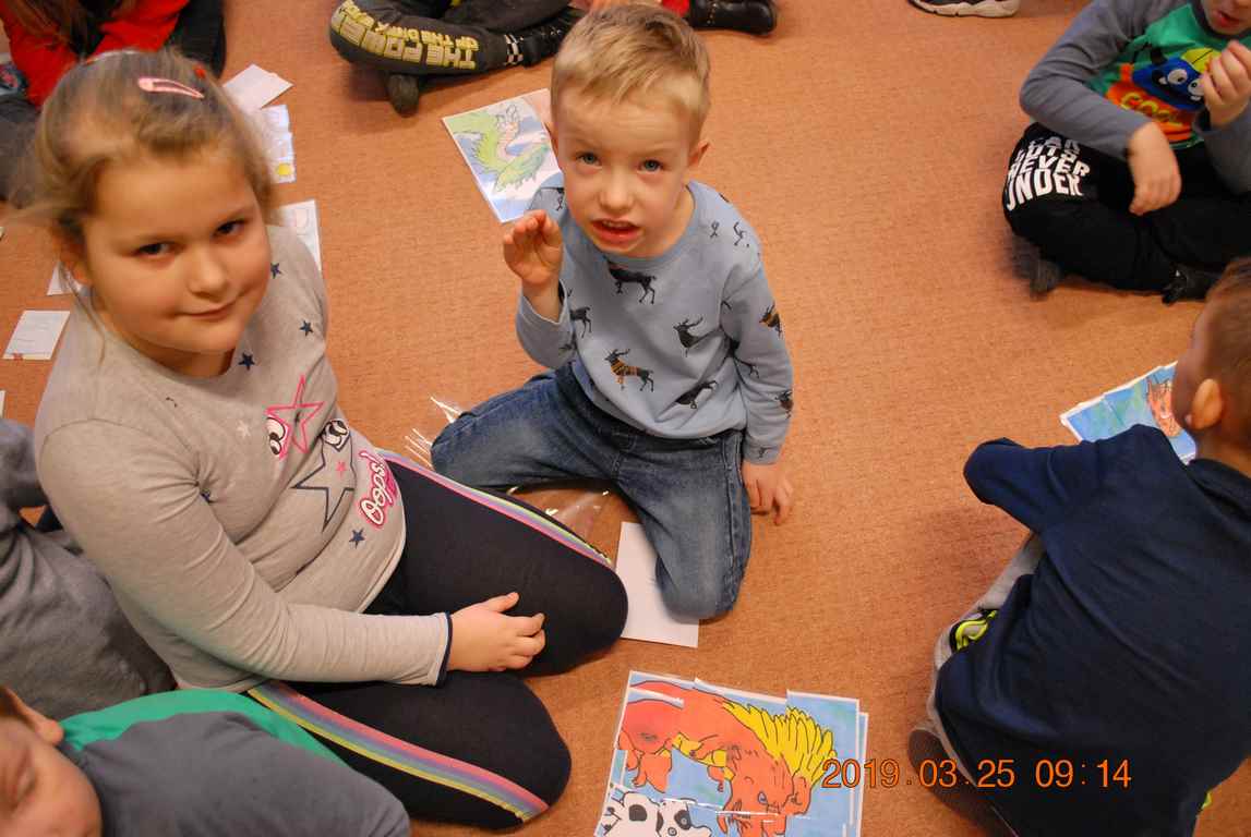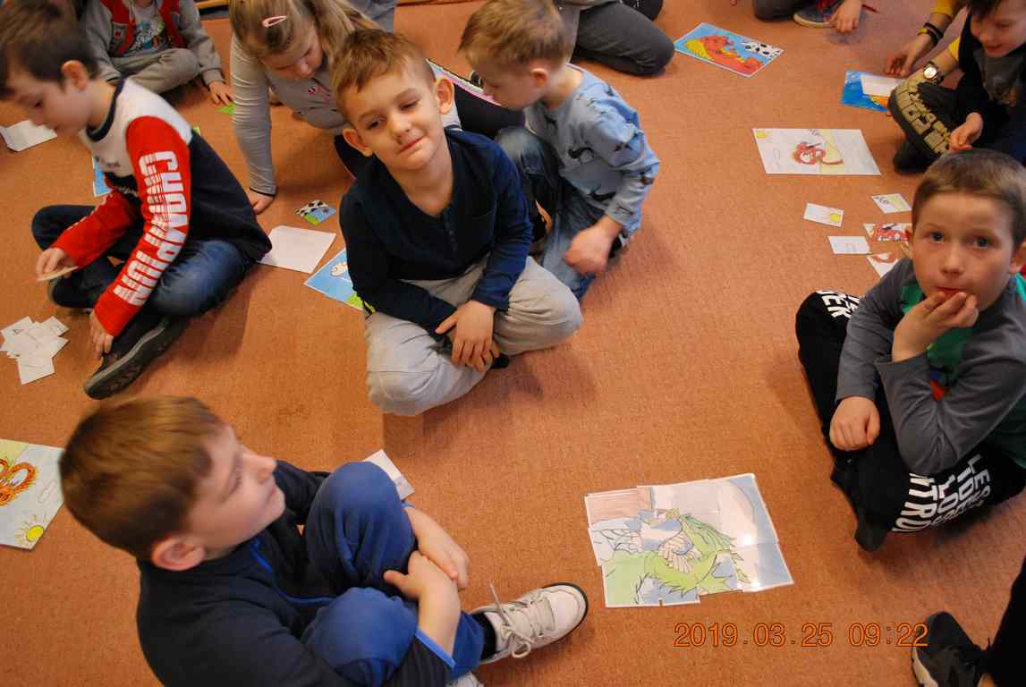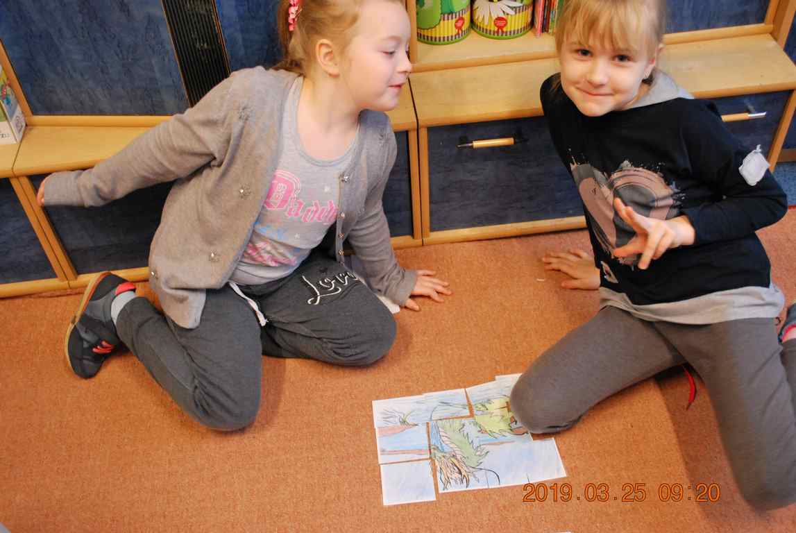 Na początku spotkania przedszkolaki wysłuchały z ogromną uwagą i zainteresowaniem „Legendy o Smokach Jeziorakowych” autorstwa Natalii Brzozowskiej - uczennicy klasy 7a. Zaciekawienie i zaangażowanie towarzyszyły małym gościom przy wykonywaniu kolejnych zadań, które związane były z wcześniej poznaną historią o potworach. Puzzle, kolorowanki, zgadywanki, a także zabawę muzyczną przygotowali uczniowie z klasy 7a, niezwykle zaangażowani w ten projekt.