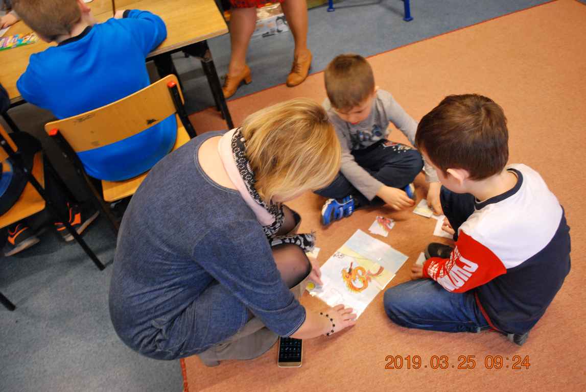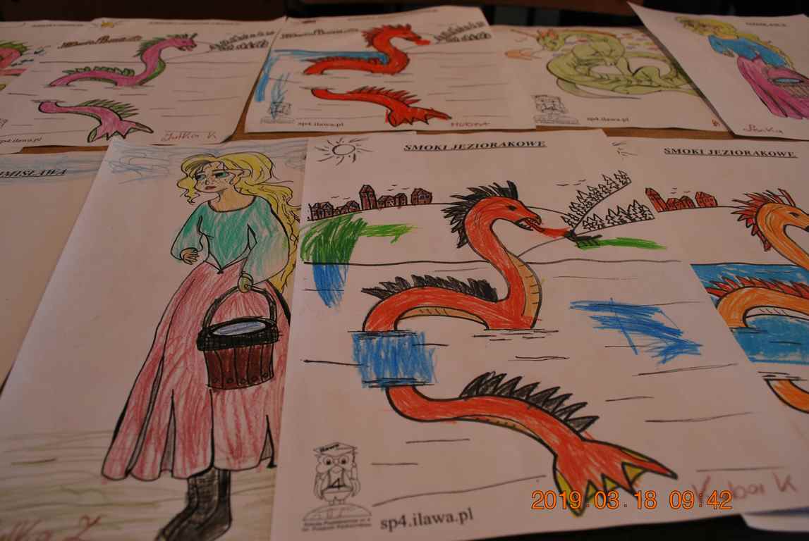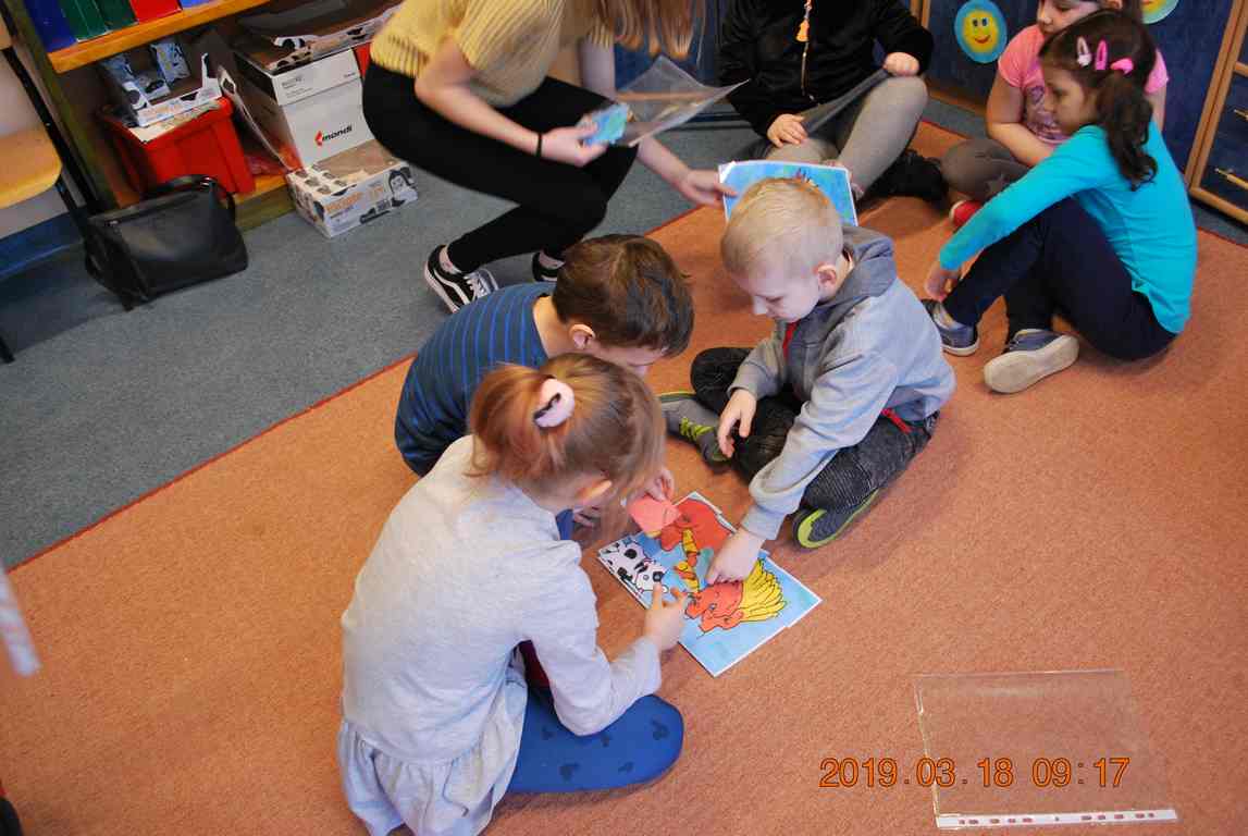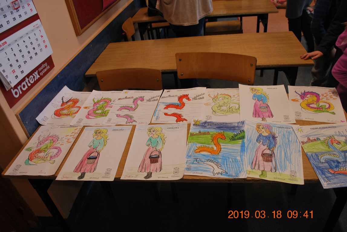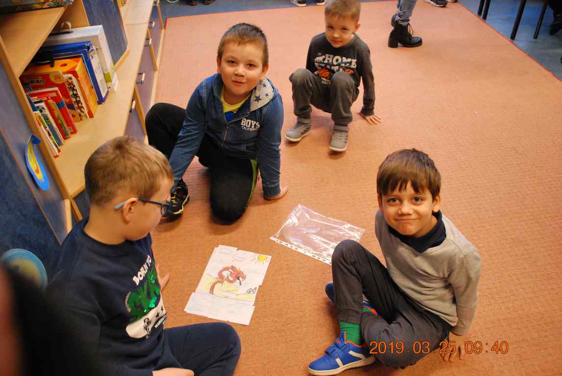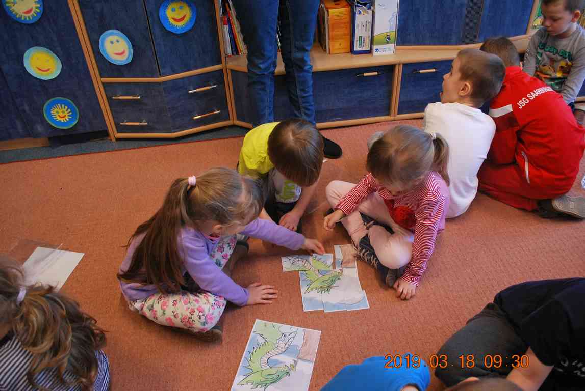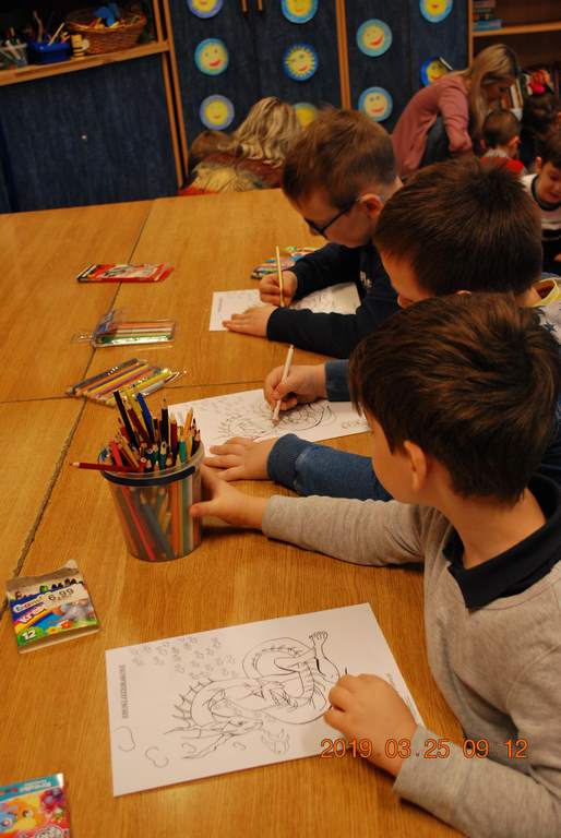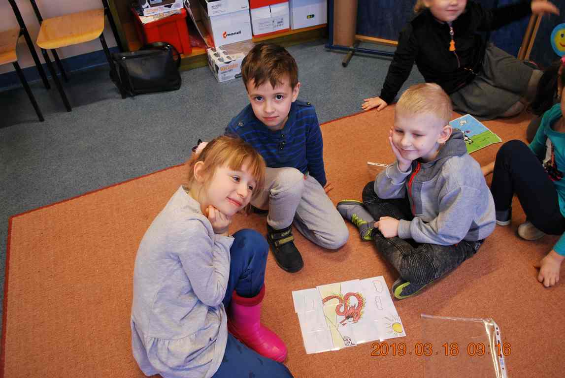Na początku spotkania przedszkolaki wysłuchały z ogromną uwagą i zainteresowaniem „Legendy o Smokach Jeziorakowych” autorstwa Natalii Brzozowskiej - uczennicy klasy 7a. Zaciekawienie i zaangażowanie towarzyszyły małym gościom przy wykonywaniu kolejnych zadań, które związane były z wcześniej poznaną historią o potworach. Puzzle, kolorowanki, zgadywanki, a także zabawę muzyczną przygotowali uczniowie z klasy 7a, niezwykle zaangażowani w ten projekt.