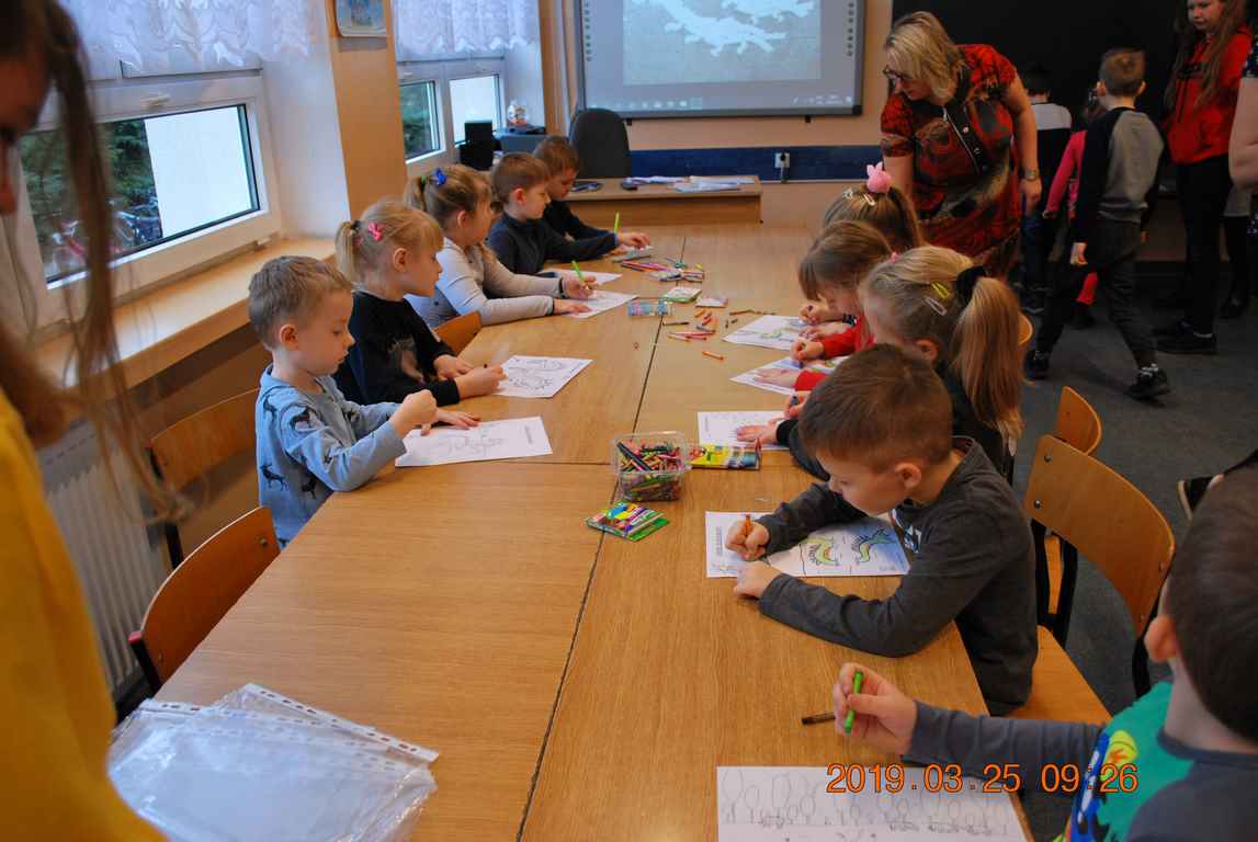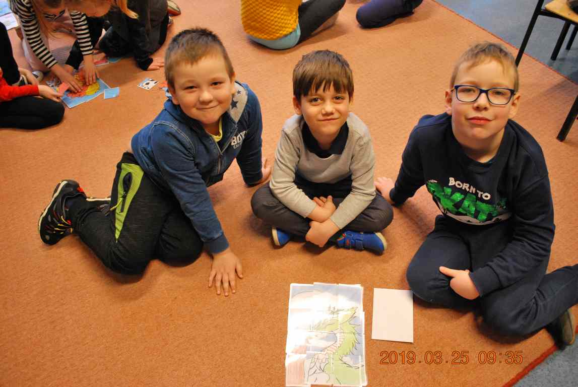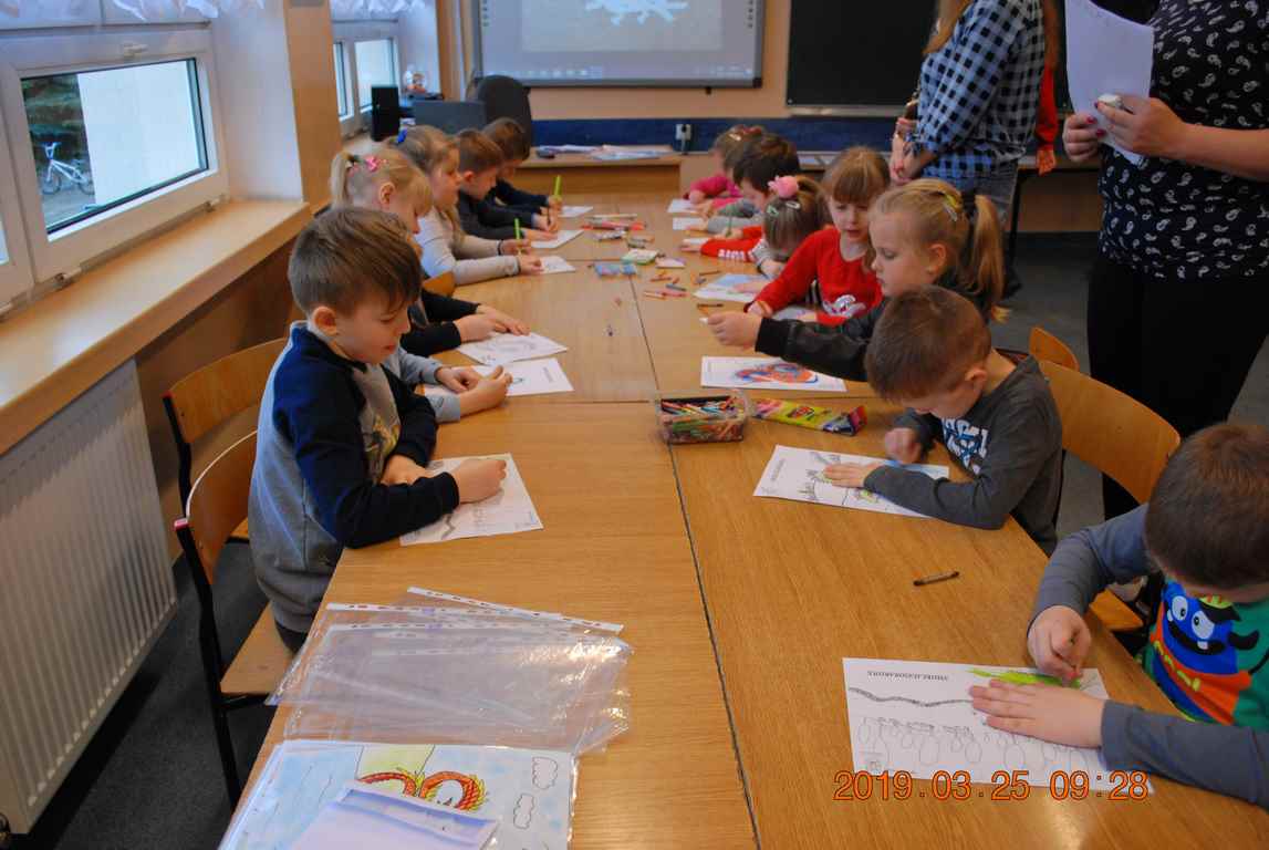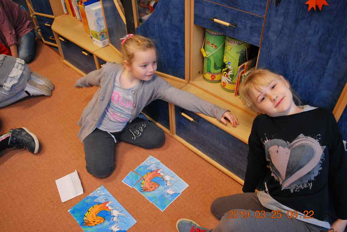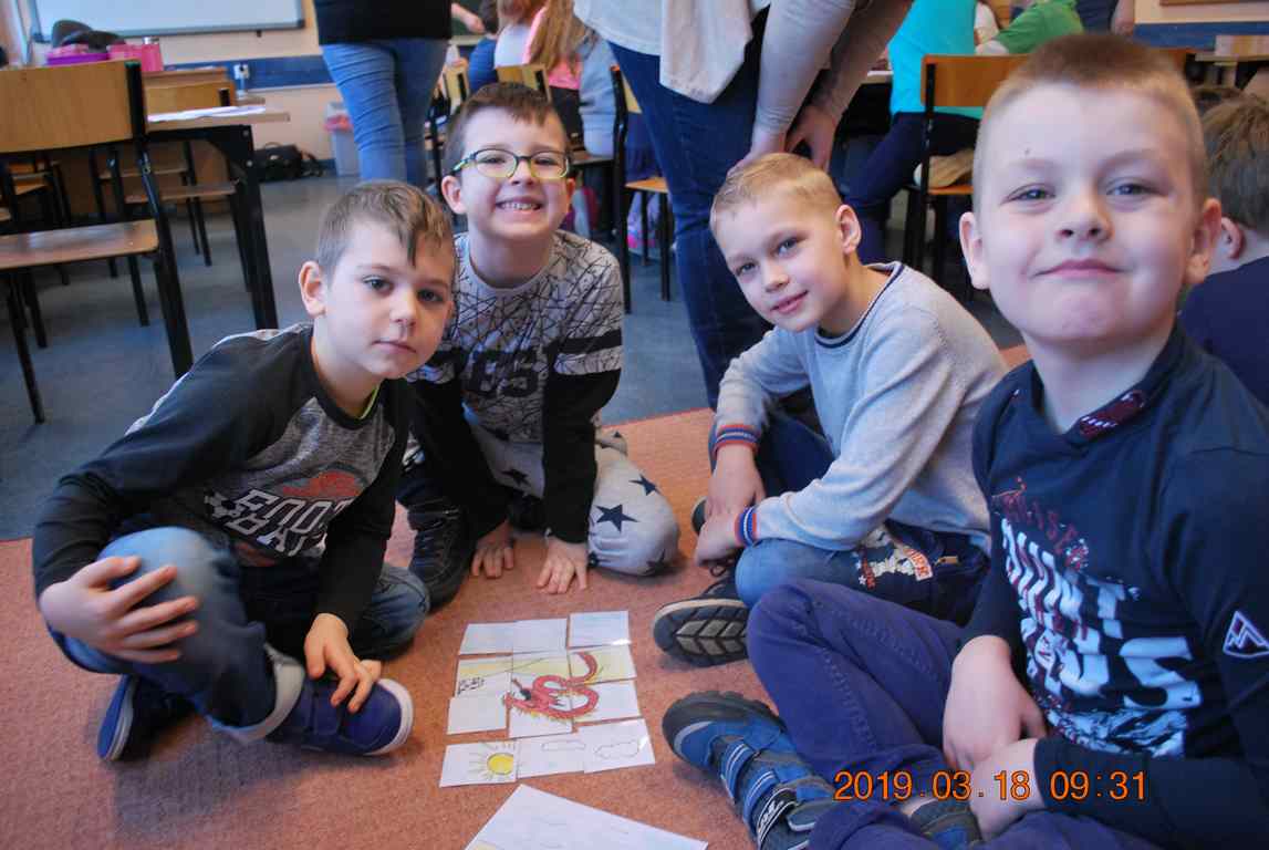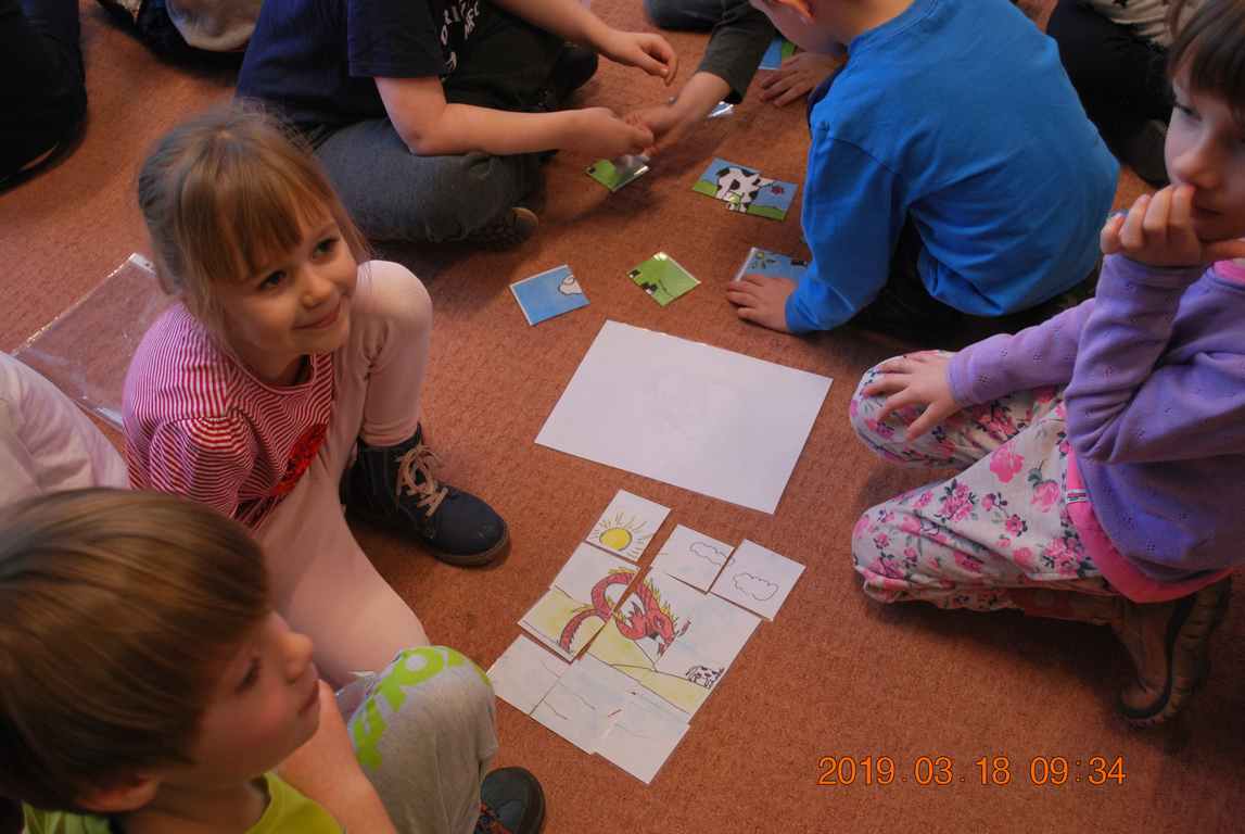 Na początku spotkania przedszkolaki wysłuchały z ogromną uwagą i zainteresowaniem „Legendy o Smokach Jeziorakowych” autorstwa Natalii Brzozowskiej - uczennicy klasy 7a. Zaciekawienie i zaangażowanie towarzyszyły małym gościom przy wykonywaniu kolejnych zadań, które związane były z wcześniej poznaną historią o potworach. Puzzle, kolorowanki, zgadywanki, a także zabawę muzyczną przygotowali uczniowie z klasy 7a, niezwykle zaangażowani w ten projekt.