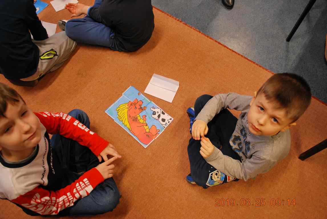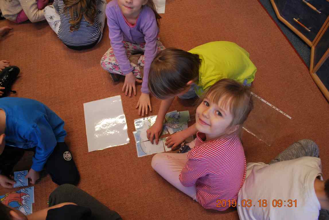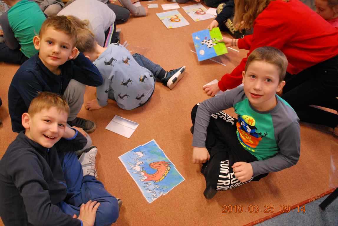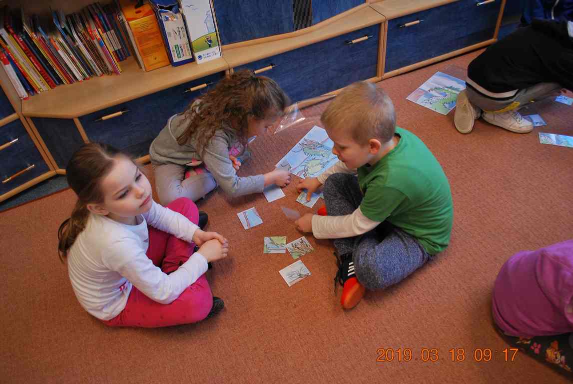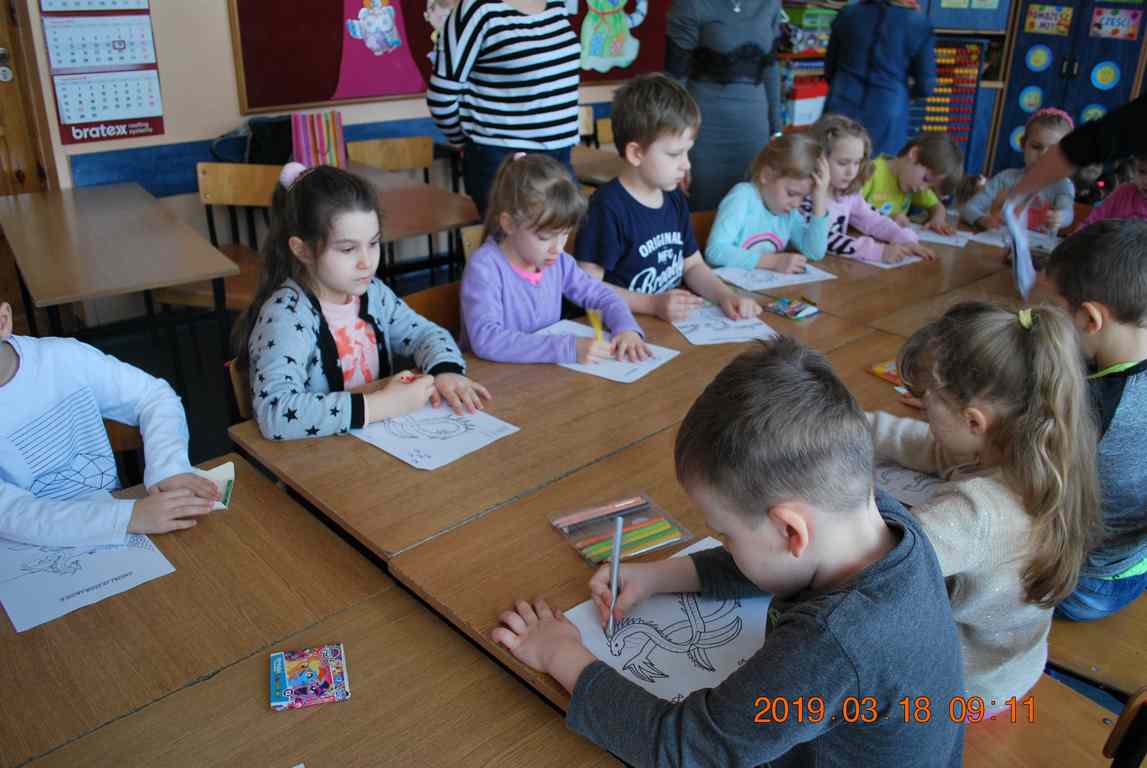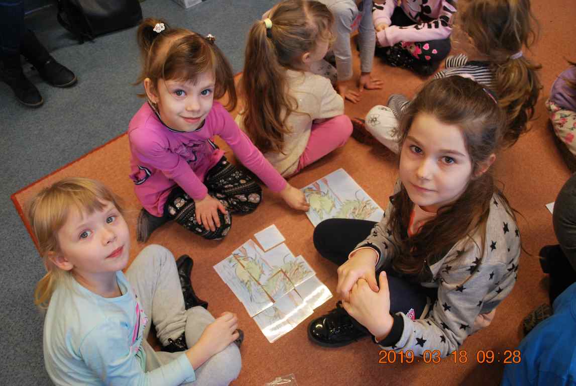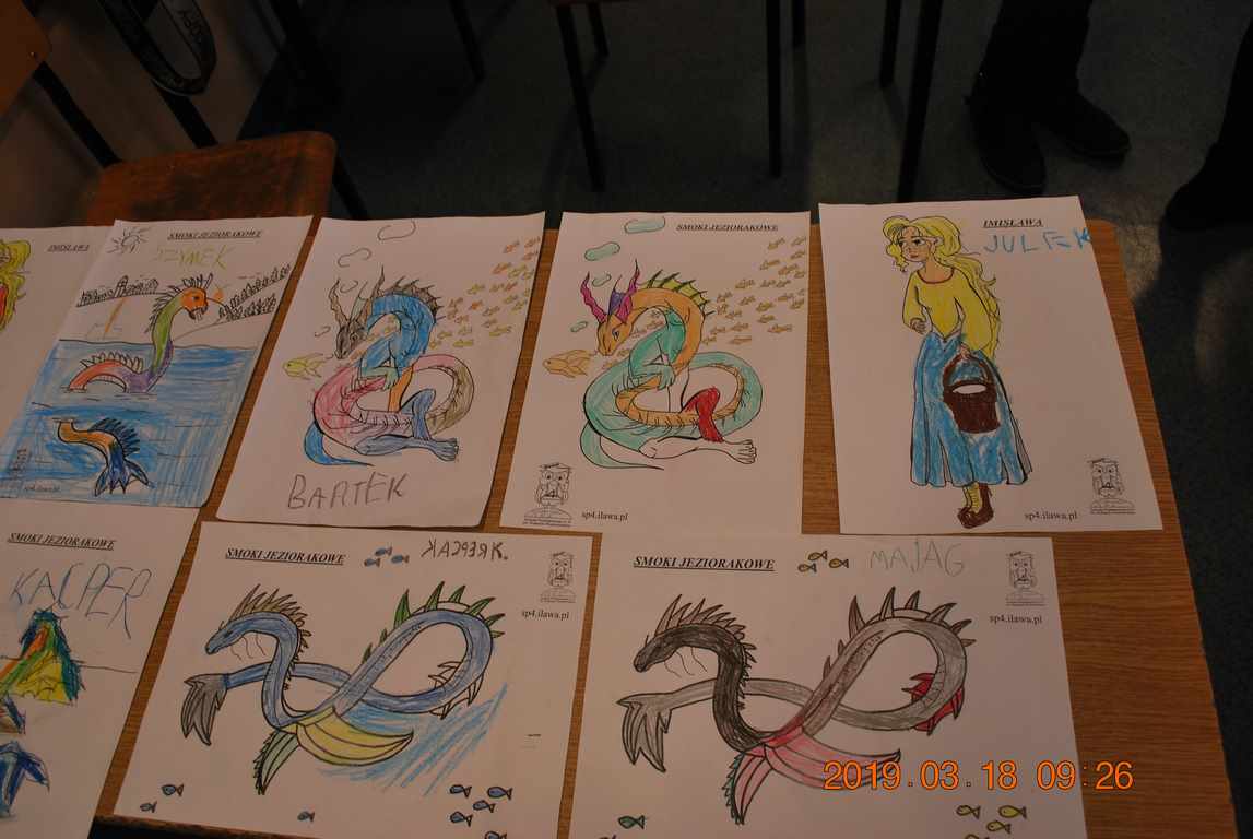 Na początku spotkania przedszkolaki wysłuchały z ogromną uwagą i zainteresowaniem „Legendy o Smokach Jeziorakowych” autorstwa Natalii Brzozowskiej - uczennicy klasy 7a. Zaciekawienie i zaangażowanie towarzyszyły małym gościom przy wykonywaniu kolejnych zadań, które związane były z wcześniej poznaną historią o potworach. Puzzle, kolorowanki, zgadywanki, a także zabawę muzyczną przygotowali uczniowie z klasy 7a, niezwykle zaangażowani w ten projekt.