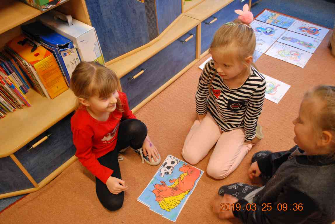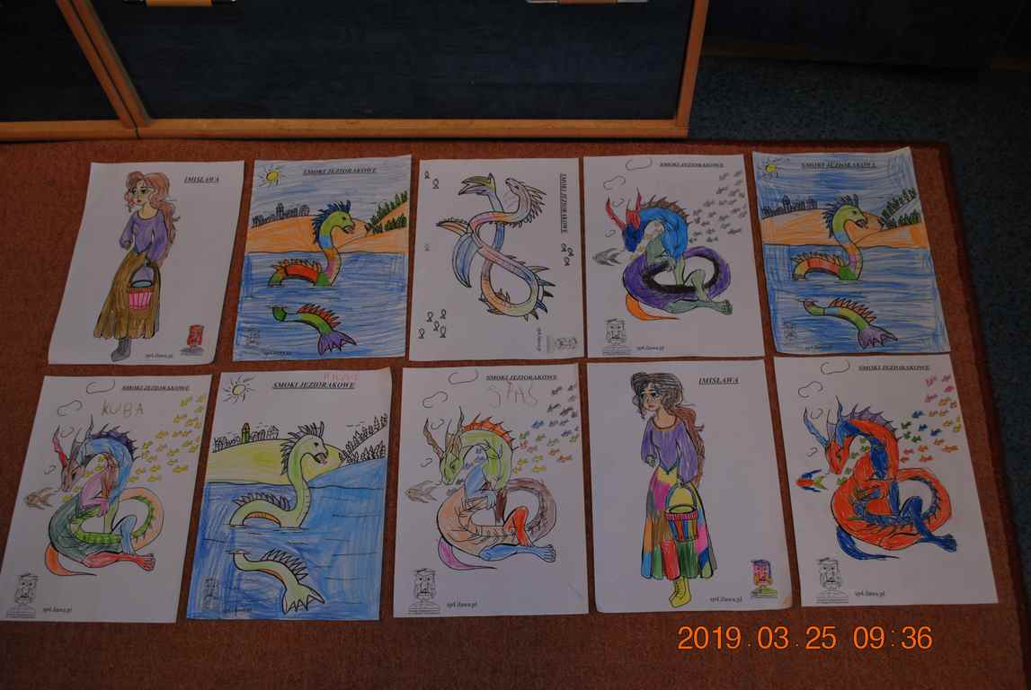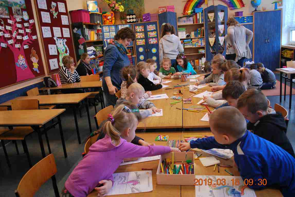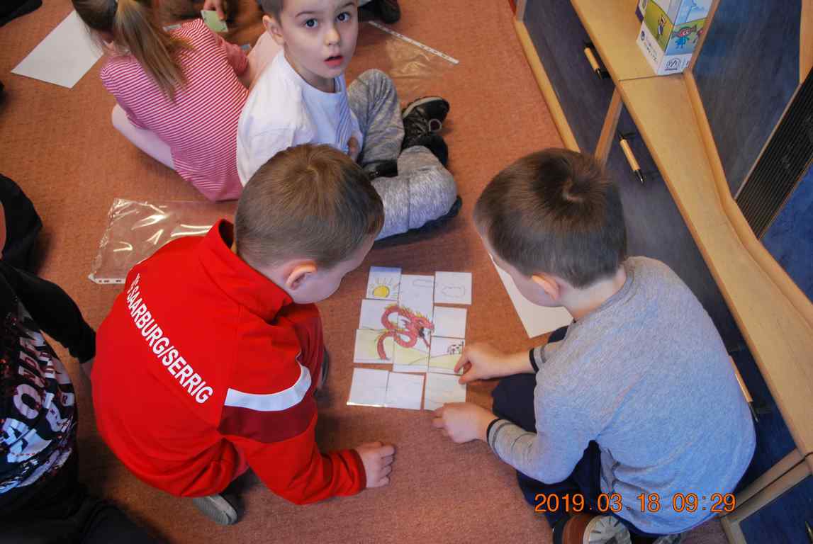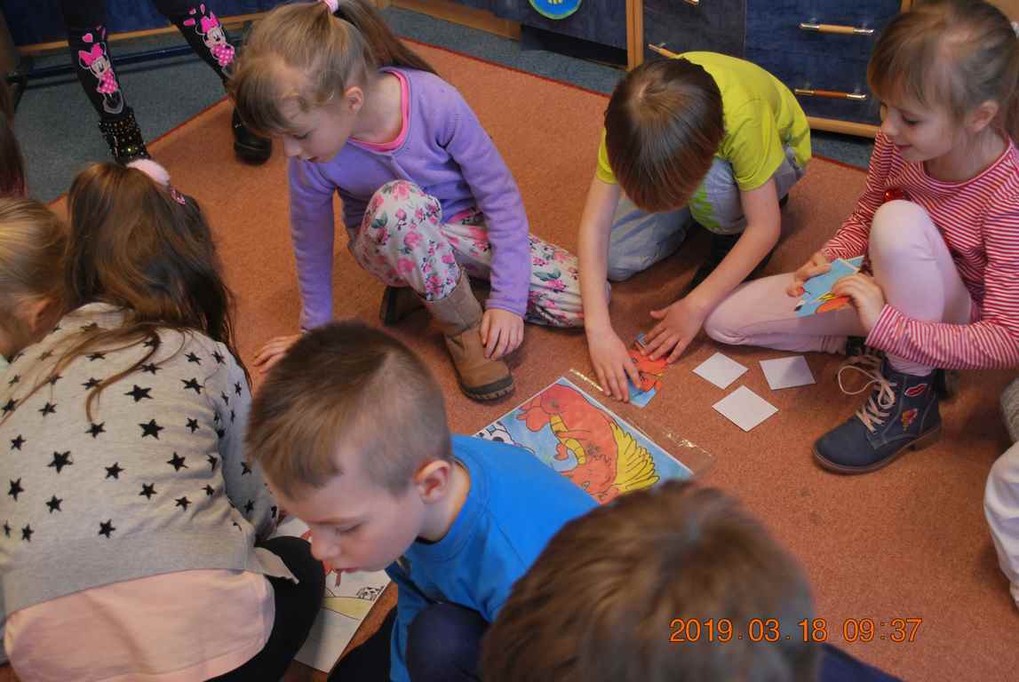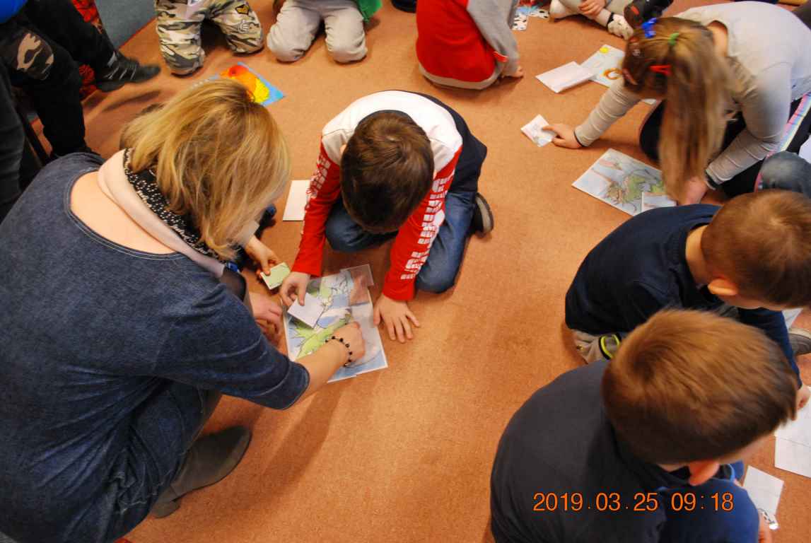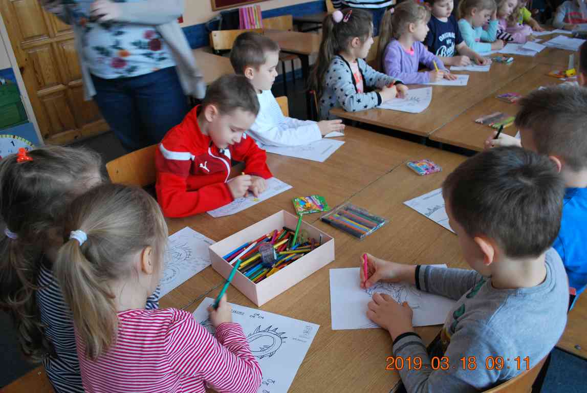 Na początku spotkania przedszkolaki wysłuchały z ogromną uwagą i zainteresowaniem „Legendy o Smokach Jeziorakowych” autorstwa Natalii Brzozowskiej - uczennicy klasy 7a. Zaciekawienie i zaangażowanie towarzyszyły małym gościom przy wykonywaniu kolejnych zadań, które związane były z wcześniej poznaną historią o potworach. Puzzle, kolorowanki, zgadywanki, a także zabawę muzyczną przygotowali uczniowie z klasy 7a, niezwykle zaangażowani w ten projekt.