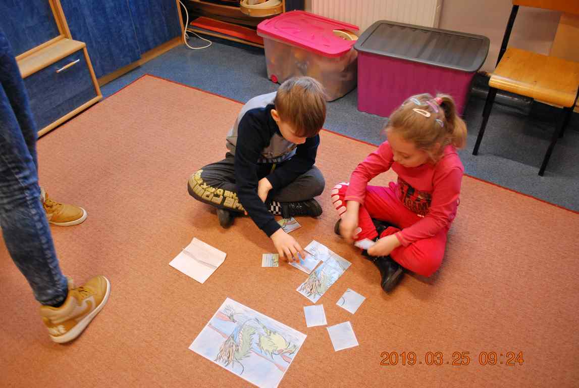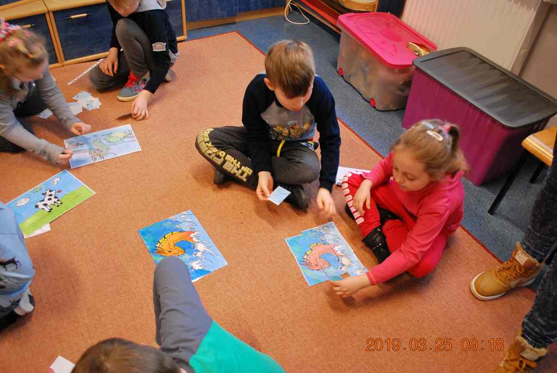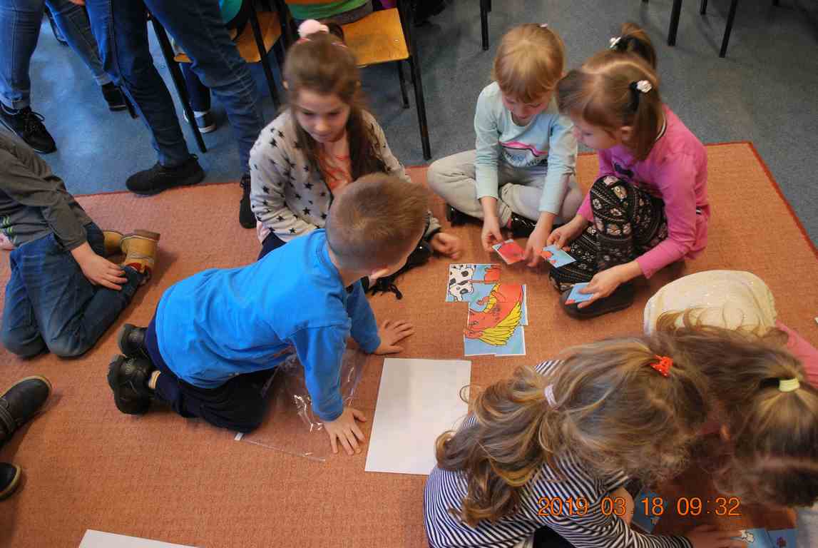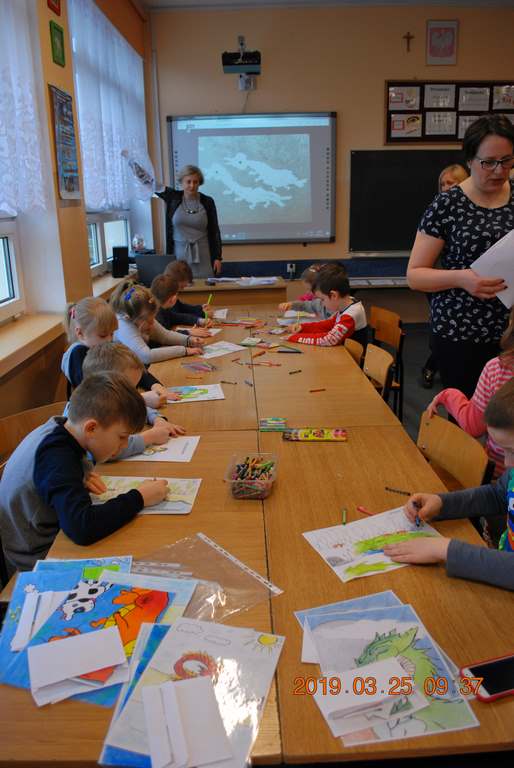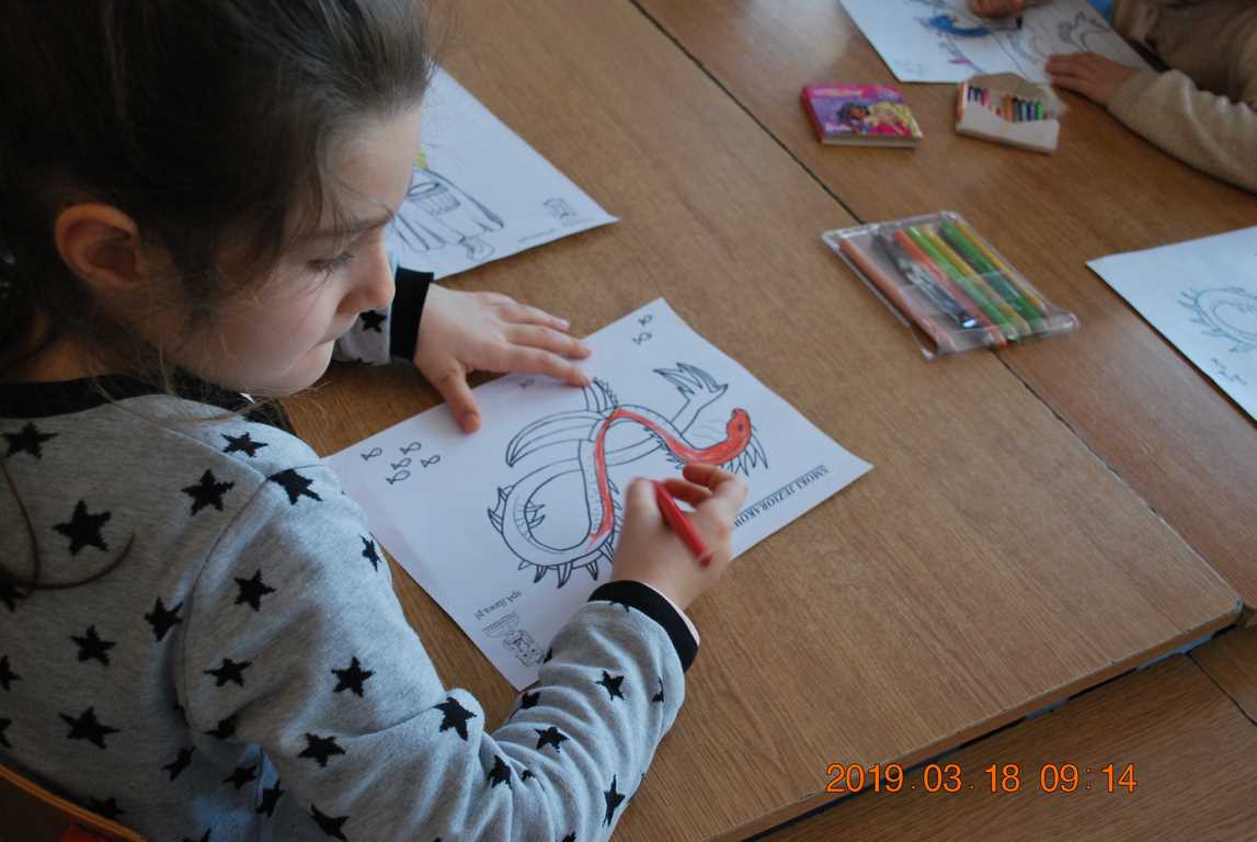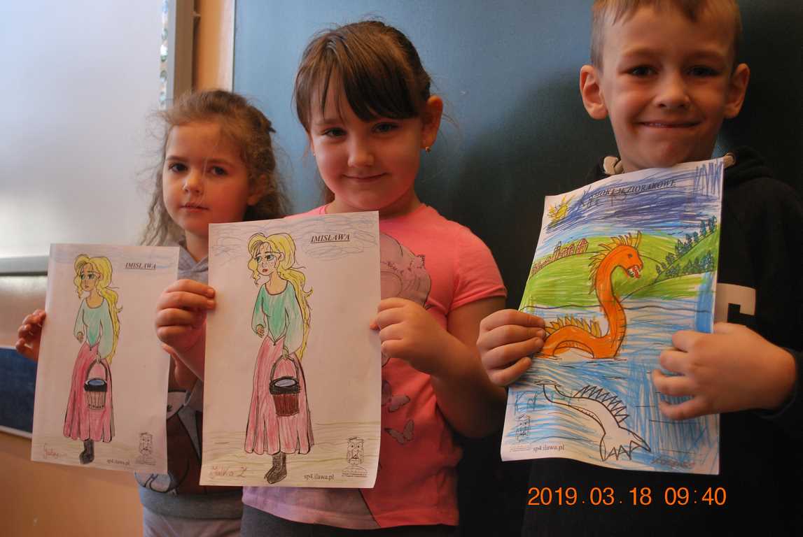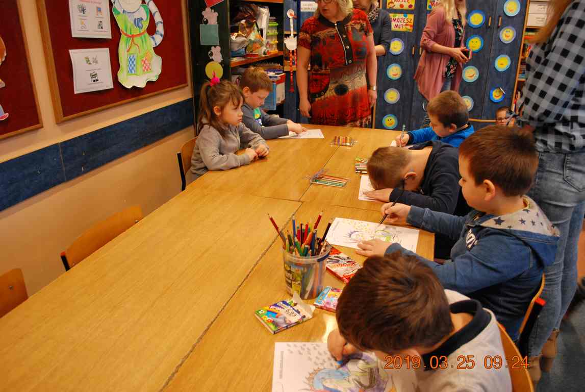 Na początku spotkania przedszkolaki wysłuchały z ogromną uwagą i zainteresowaniem „Legendy o Smokach Jeziorakowych” autorstwa Natalii Brzozowskiej - uczennicy klasy 7a. Zaciekawienie i zaangażowanie towarzyszyły małym gościom przy wykonywaniu kolejnych zadań, które związane były z wcześniej poznaną historią o potworach. Puzzle, kolorowanki, zgadywanki, a także zabawę muzyczną przygotowali uczniowie z klasy 7a, niezwykle zaangażowani w ten projekt.