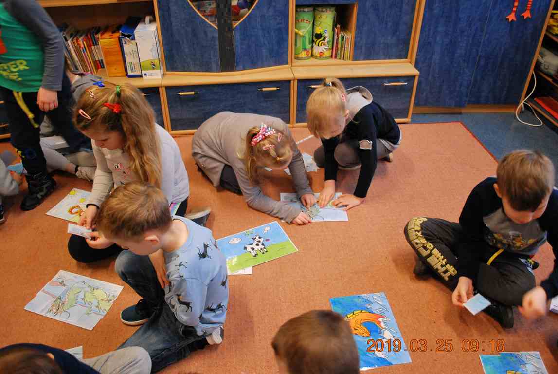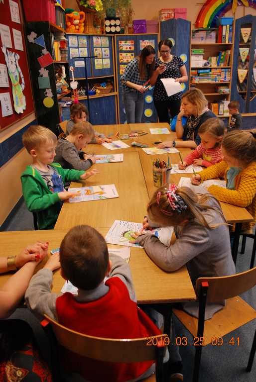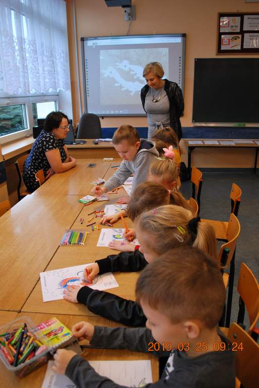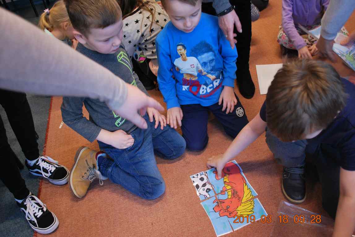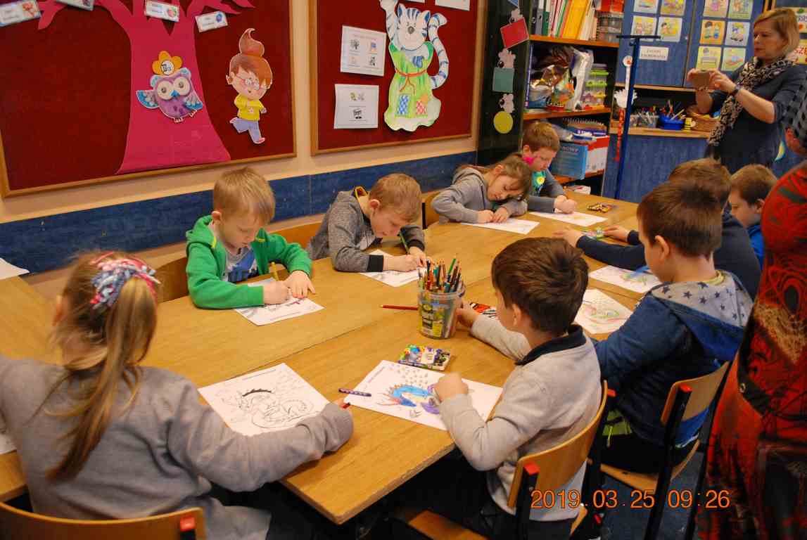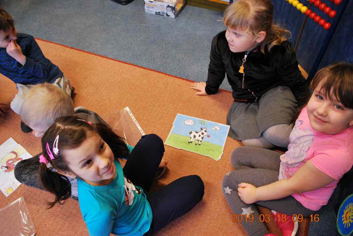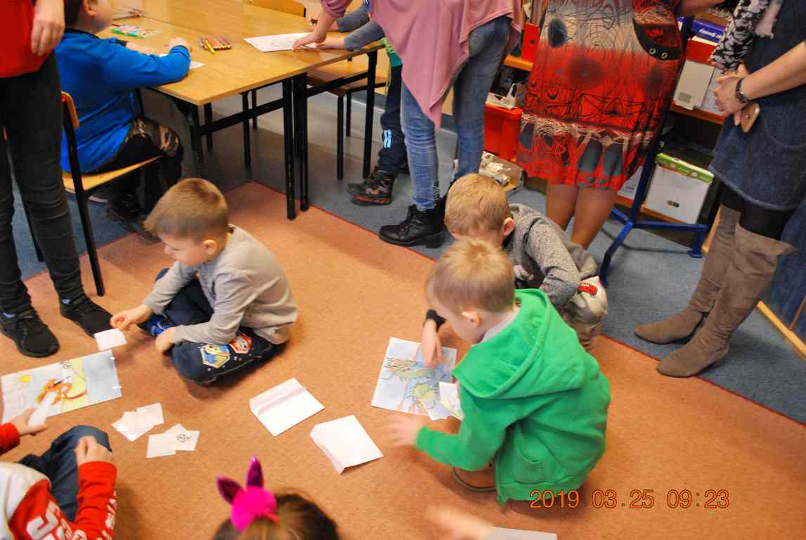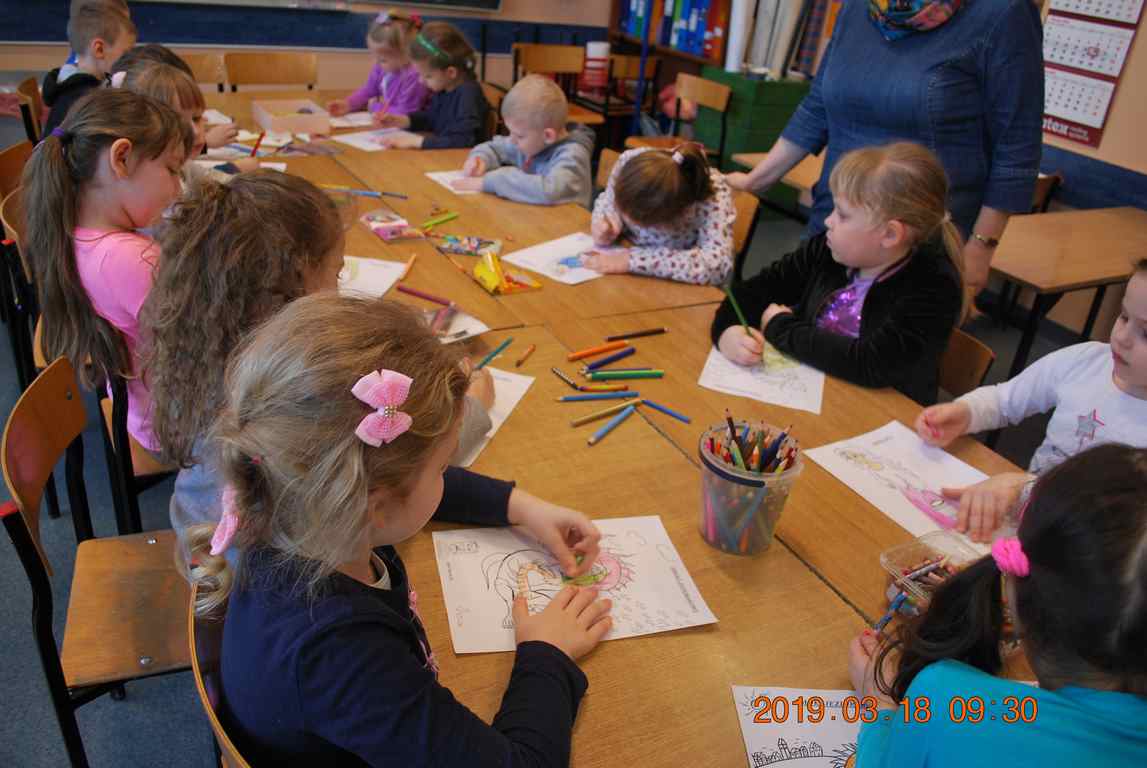 Na początku spotkania przedszkolaki wysłuchały z ogromną uwagą i zainteresowaniem „Legendy o Smokach Jeziorakowych” autorstwa Natalii Brzozowskiej - uczennicy klasy 7a. Zaciekawienie i zaangażowanie towarzyszyły małym gościom przy wykonywaniu kolejnych zadań, które związane były z wcześniej poznaną historią o potworach. Puzzle, kolorowanki, zgadywanki, a także zabawę muzyczną przygotowali uczniowie z klasy 7a, niezwykle zaangażowani w ten projekt.