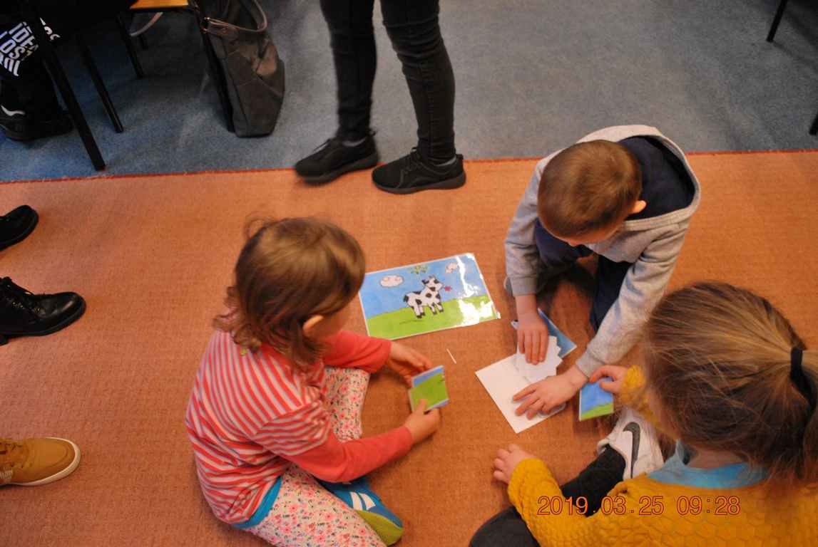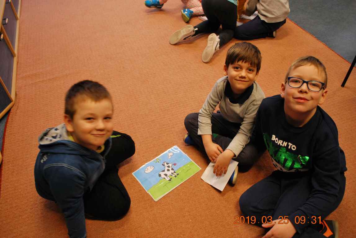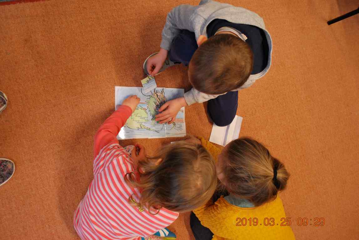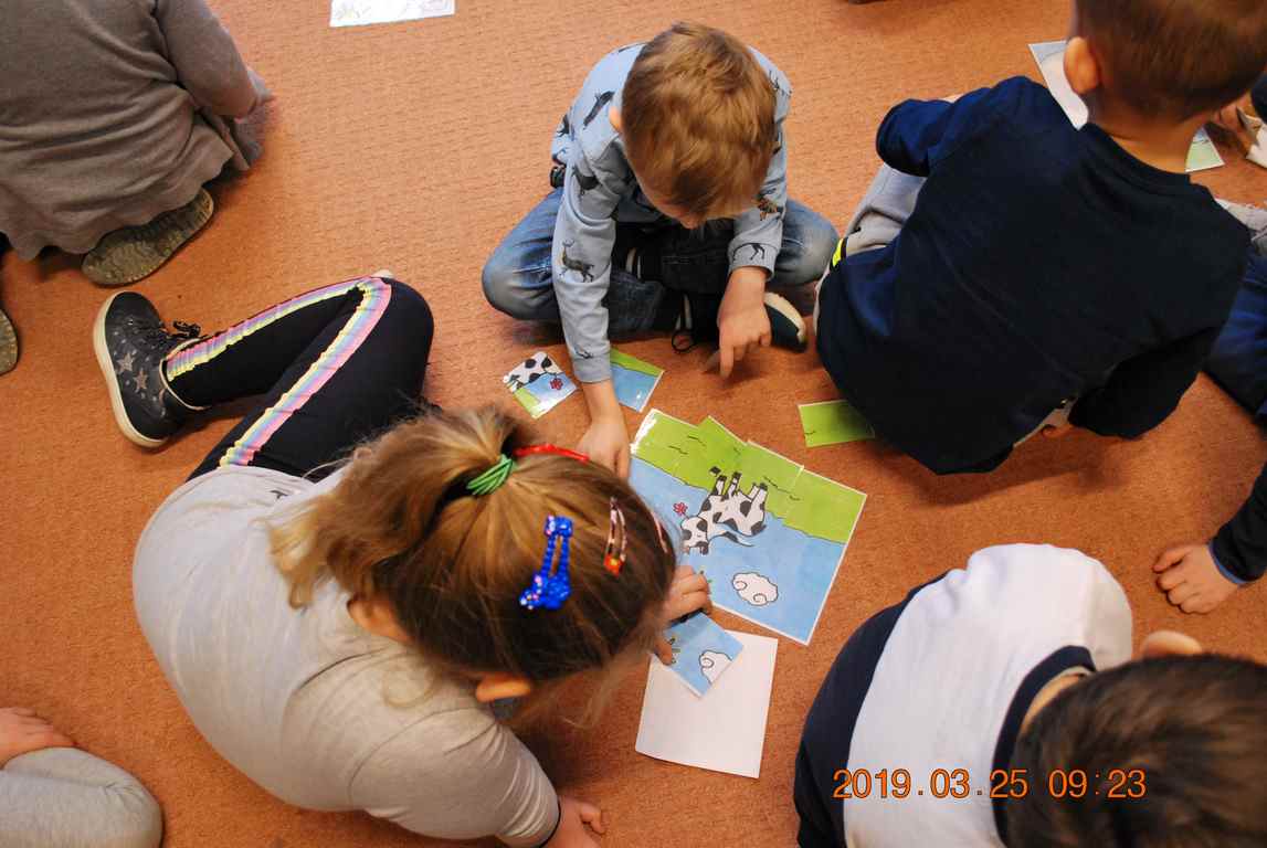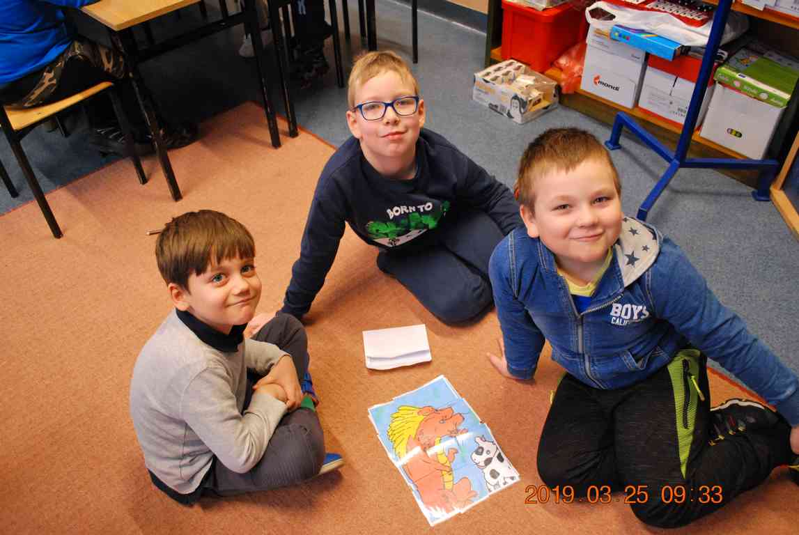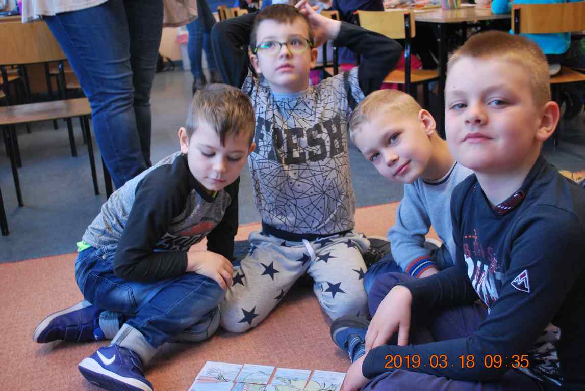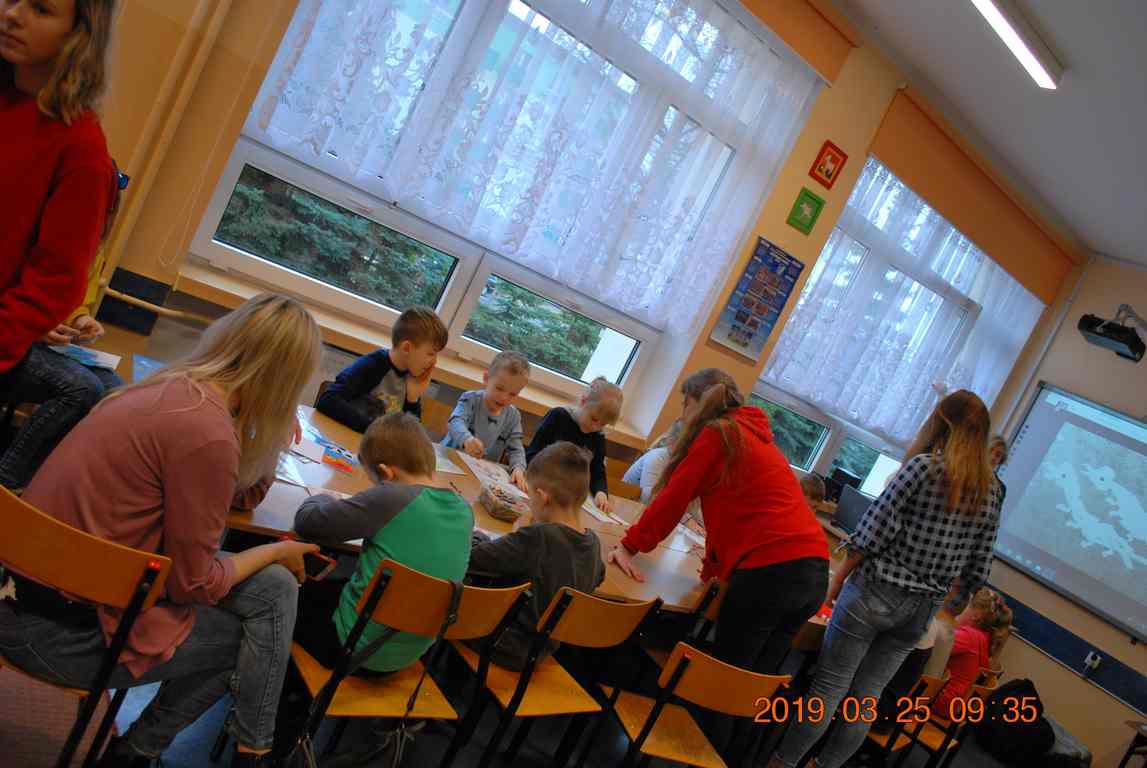 Na początku spotkania przedszkolaki wysłuchały z ogromną uwagą i zainteresowaniem „Legendy o Smokach Jeziorakowych” autorstwa Natalii Brzozowskiej - uczennicy klasy 7a. Zaciekawienie i zaangażowanie towarzyszyły małym gościom przy wykonywaniu kolejnych zadań, które związane były z wcześniej poznaną historią o potworach. Puzzle, kolorowanki, zgadywanki, a także zabawę muzyczną przygotowali uczniowie z klasy 7a, niezwykle zaangażowani w ten projekt.