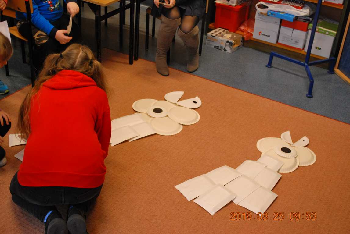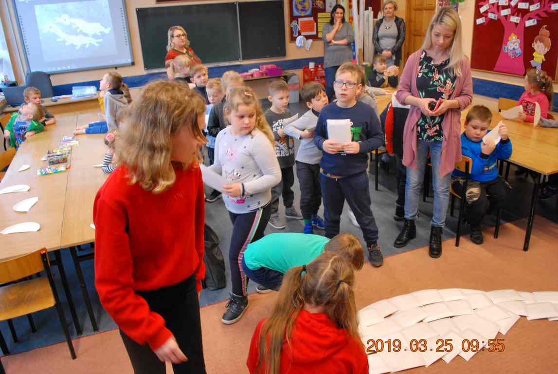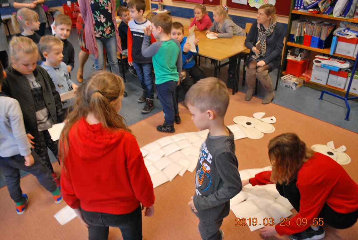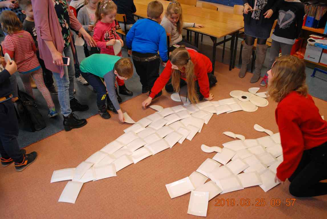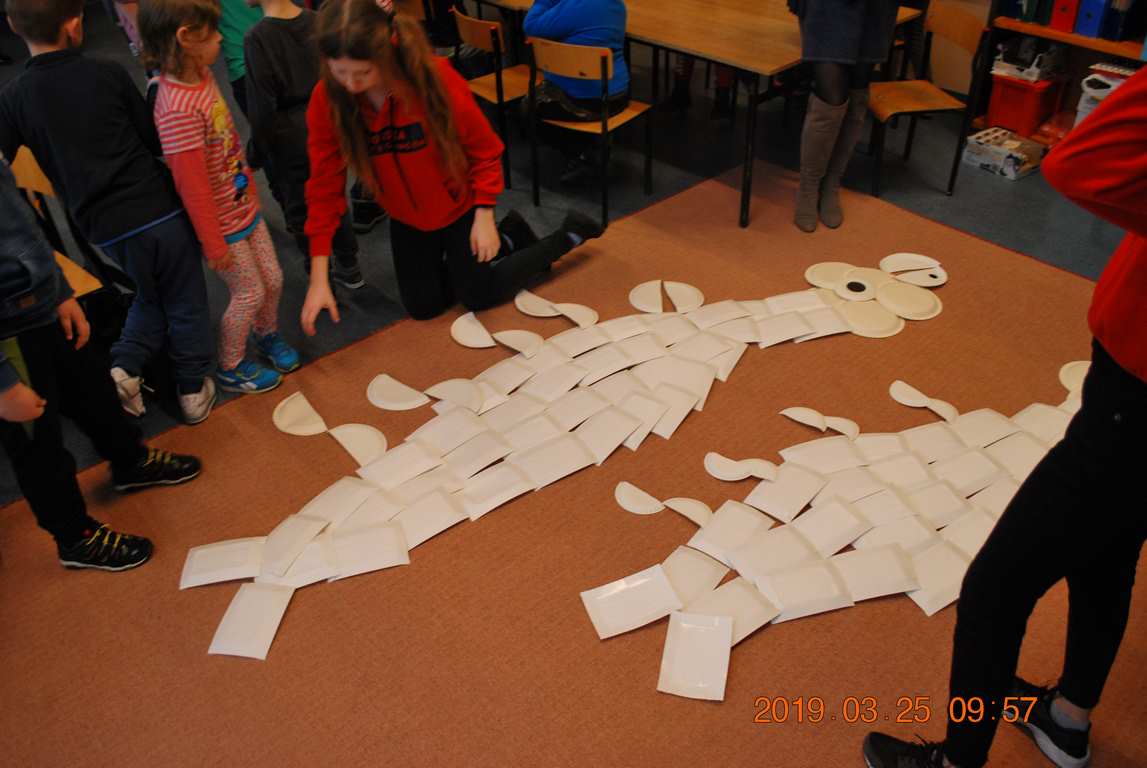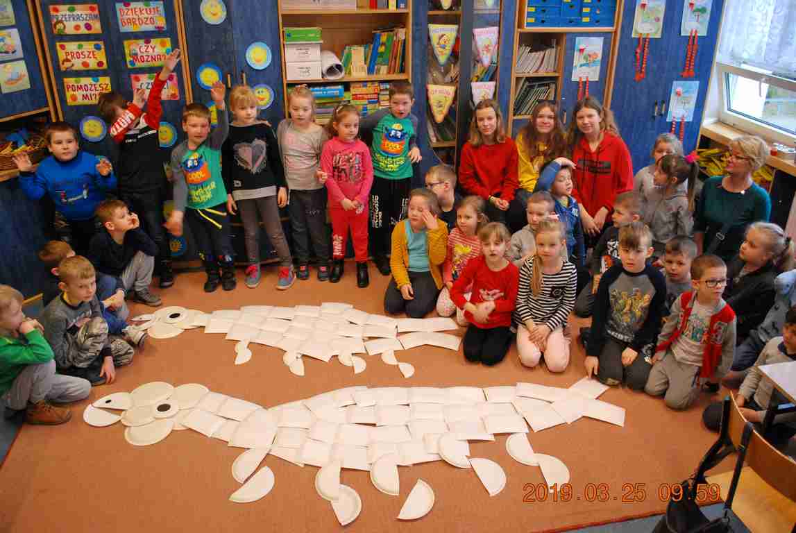 Na koniec dzieci ułożyły z papierowych talerzyków dwa Smoki Jeziorakowe, a spotkania zostały utrwalone na pamiątkowych zdjęciach.
