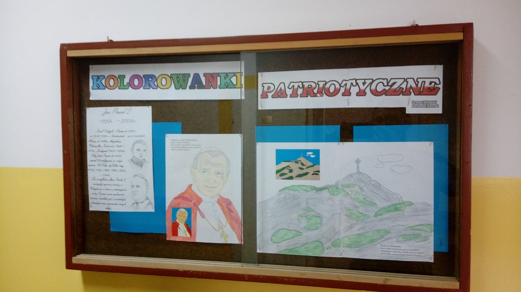 Od września 2017r. uczniowie klas IV-VII pod kierunkiem nauczyciela historii projektują i wykonują szatę graficzną gabloty pt. „Kolorowanki Patriotyczne” Głównym celem wystawki jest rozbudzenie zainteresowania uczniów przeszłością Polski oraz kształtowanie postawy patriotycznej: szacunku do ojczyzny i dumy z dziedzictwa narodowego.