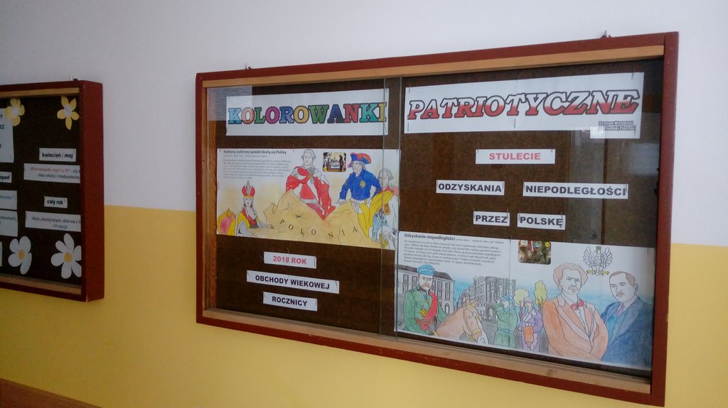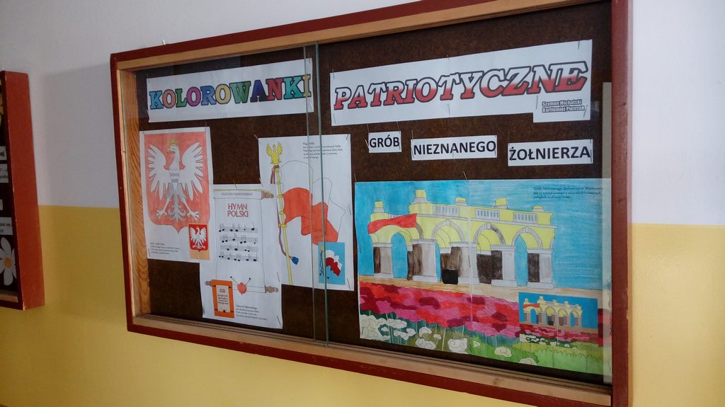 Od września 2017r. uczniowie klas IV-VII pod kierunkiem nauczyciela historii projektują i wykonują szatę graficzną gabloty pt. „Kolorowanki Patriotyczne” Głównym celem wystawki jest rozbudzenie zainteresowania uczniów przeszłością Polski oraz kształtowanie postawy patriotycznej: szacunku do ojczyzny i dumy z dziedzictwa narodowego.