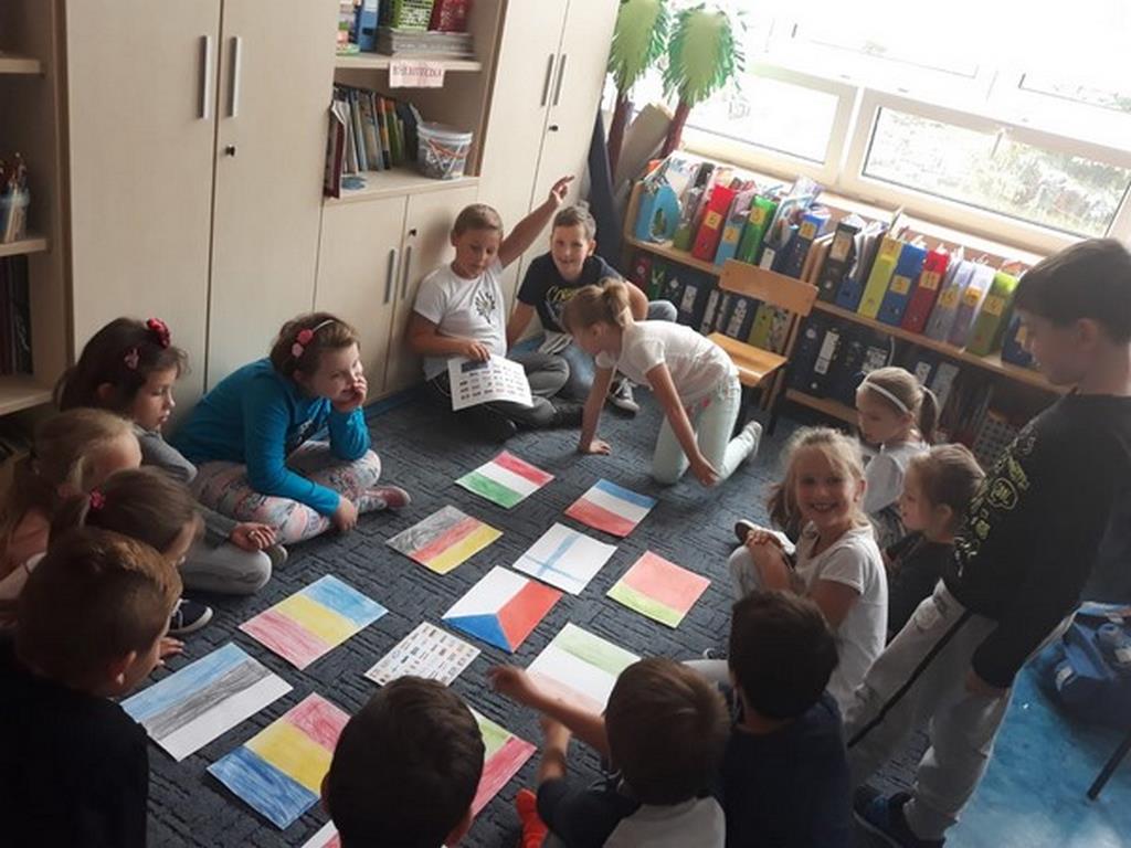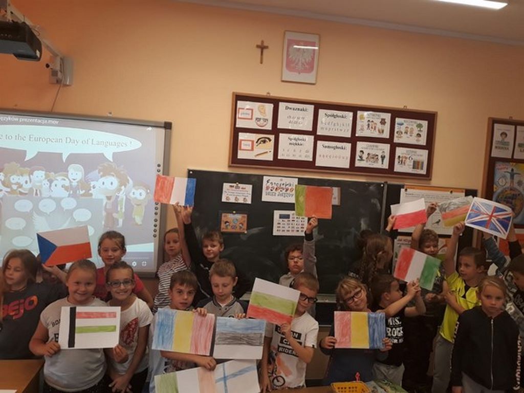 Dzieci w klasach młodszych oglądały prezentacje multimedialne o różnych krajach, słuchały hymnów narodowych, wykonywały flagi i rozmawiały o tym jak ważna jest nauka języków obcych.