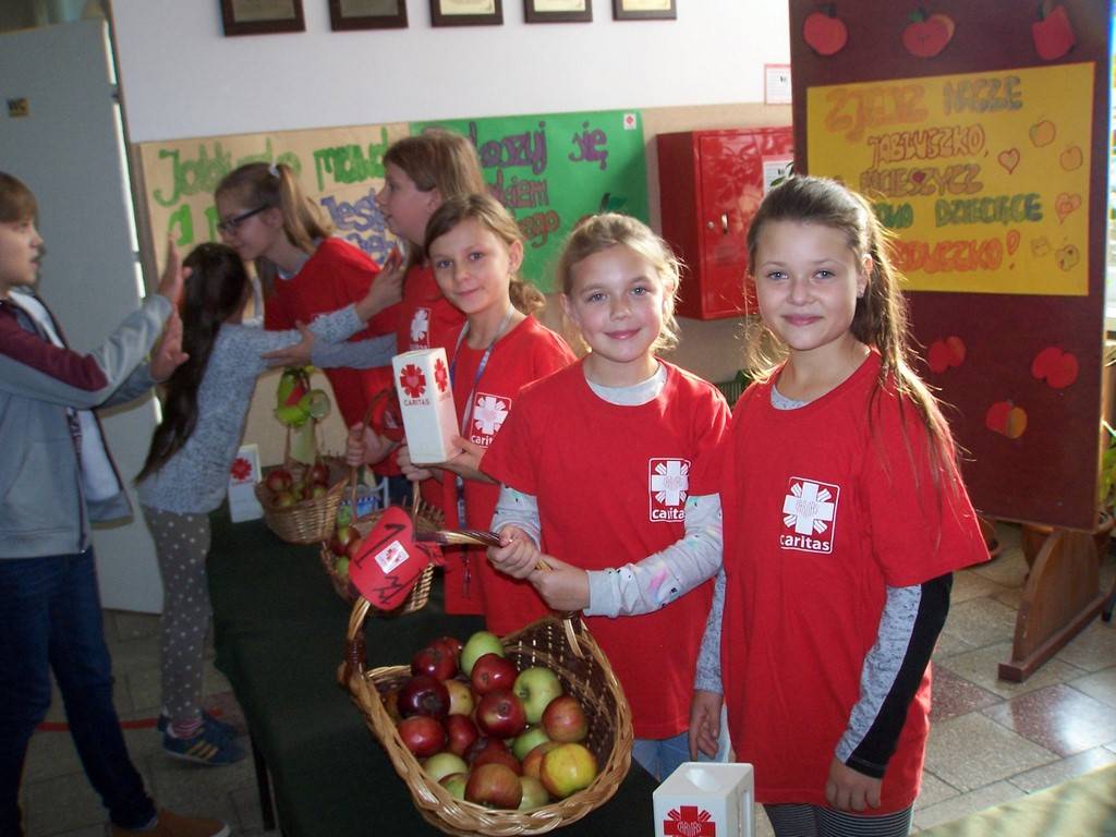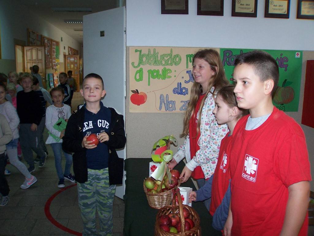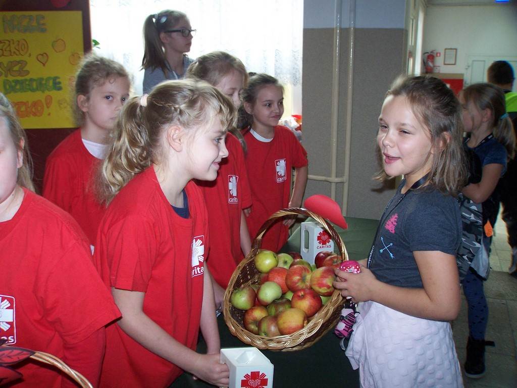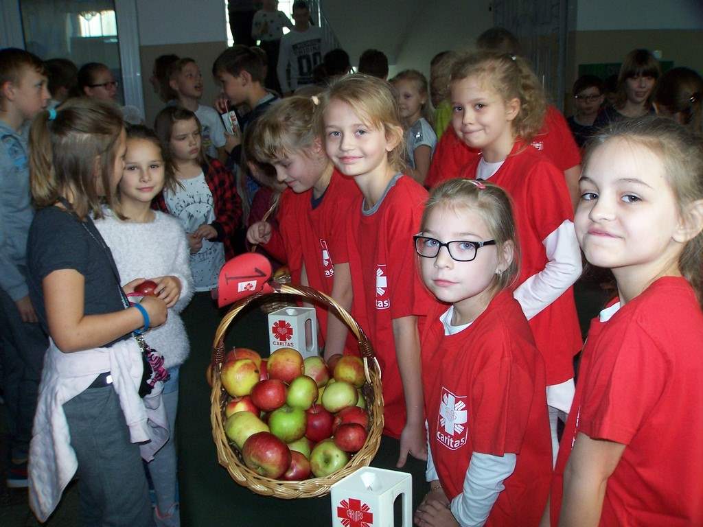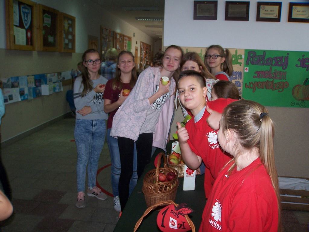 18 i 19 października 2017 r. wolontariusze ze Szkolnego Koła Caritas rozprowadzali w czasie przerw jabłka za symboliczną złotówkę w ramach akcji charytatywnej pt.: „Okaż serduszko – kup jabłuszko!” Nad całością przedsięwzięcia czuwały panie katechetki: Iwona Grubalska i Beata Jastrzębska.