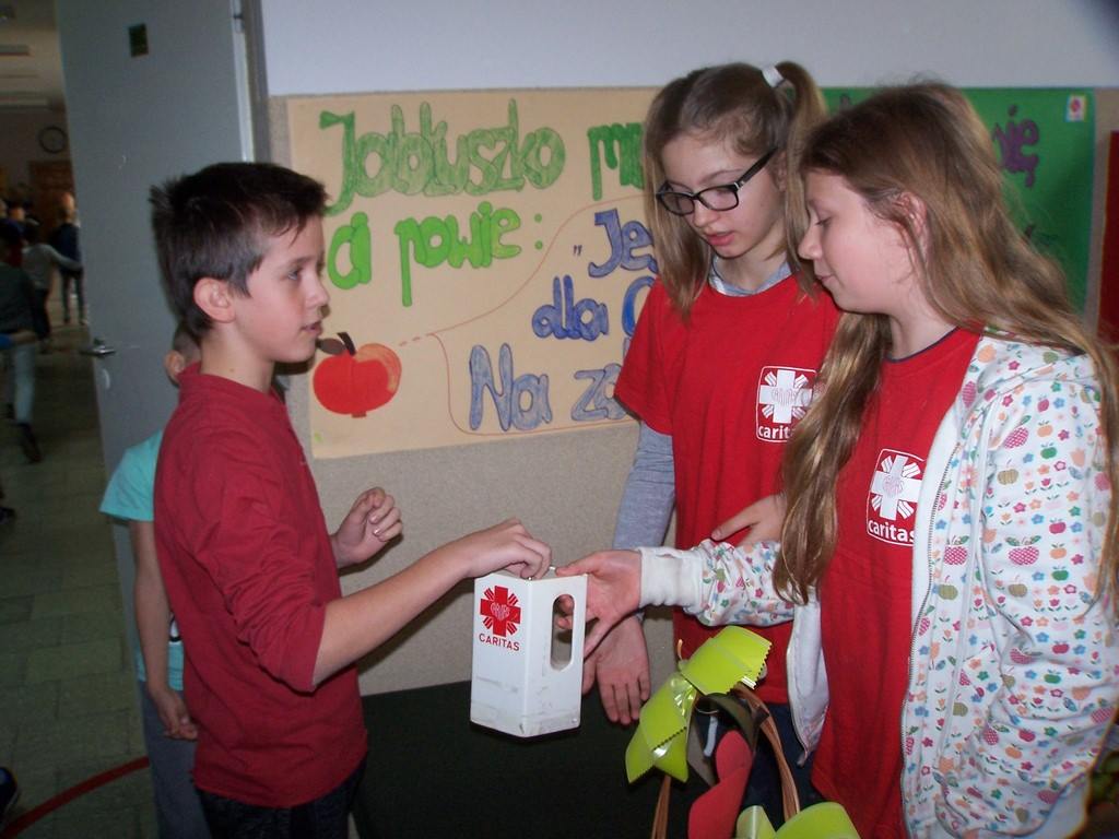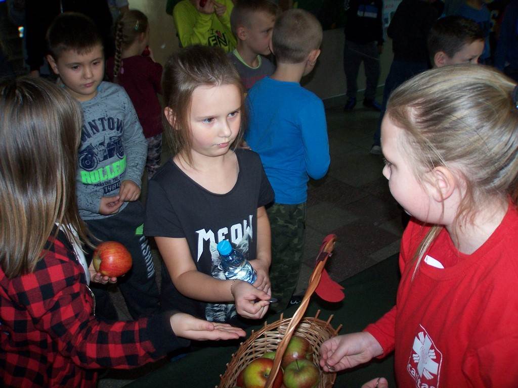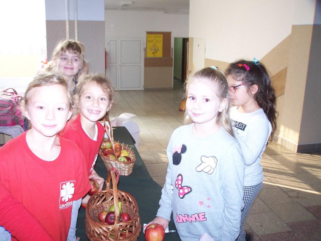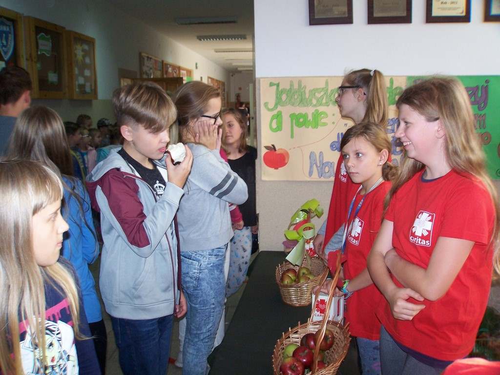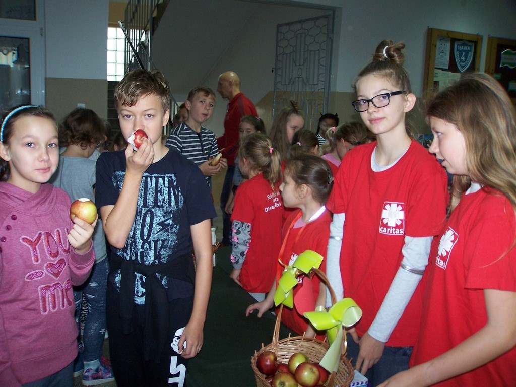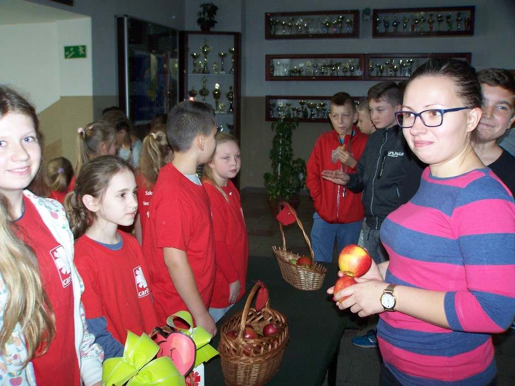 18 i 19 października 2017 r. wolontariusze ze Szkolnego Koła Caritas rozprowadzali w czasie przerw jabłka za symboliczną złotówkę w ramach akcji charytatywnej pt.: „Okaż serduszko – kup jabłuszko!” Nad całością przedsięwzięcia czuwały panie katechetki: Iwona Grubalska i Beata Jastrzębska.