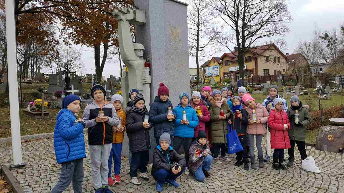 W związku ze zbliżającym się Narodowym Świętem Niepodległości uczniowie klas II a, III b i III c udali się na cmentarz, oddać hołd poległym żołnierzom. Dzieci w ciszy i skupieniu zapaliły znicze i ustawiły je na grobach żołnierzy. W jesiennej zadumie uczniowie wrócili do szkoły analizując wcześniej odczytany wpis na pomniku „Poległym w roku 1939 w obronie Ojczyzny”.