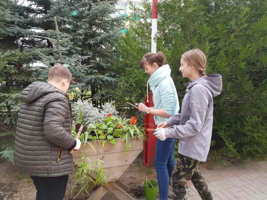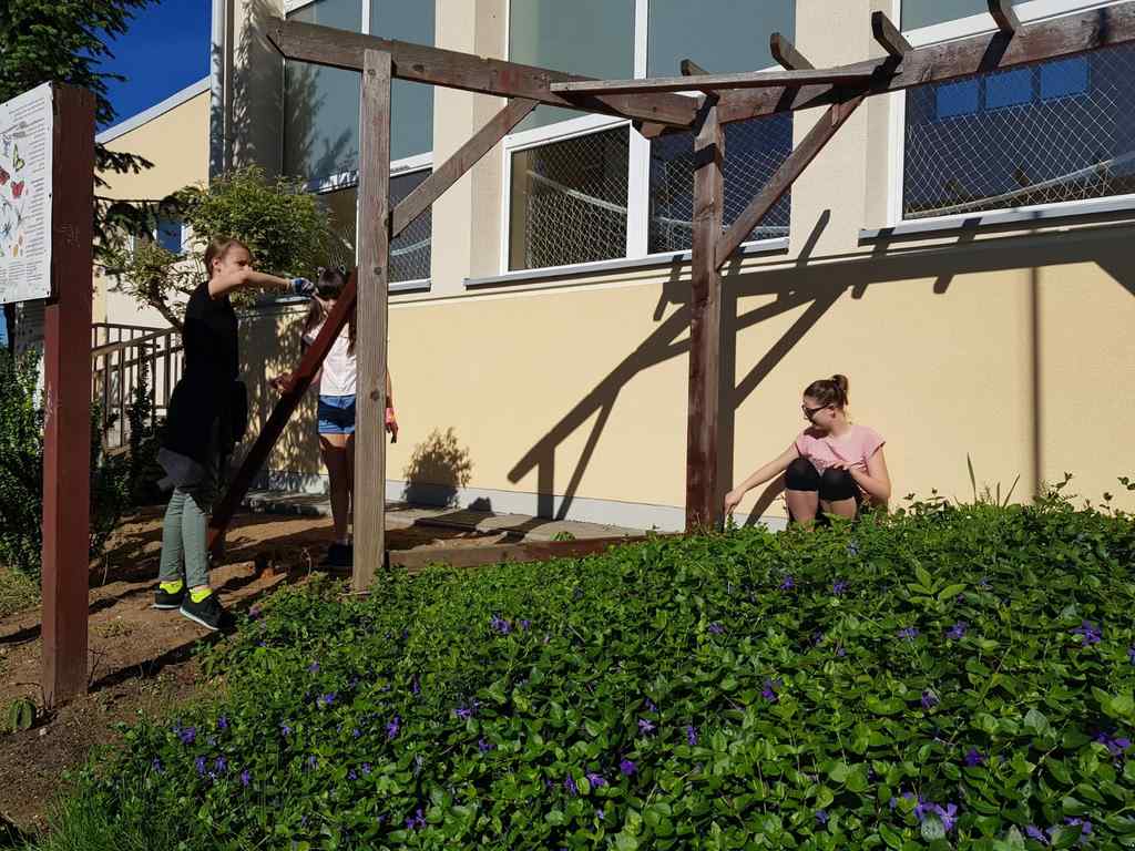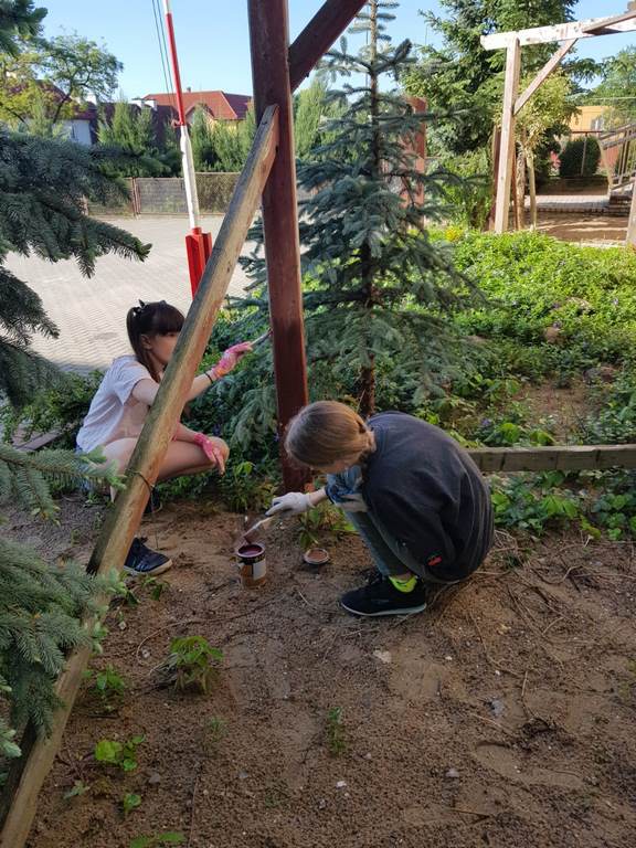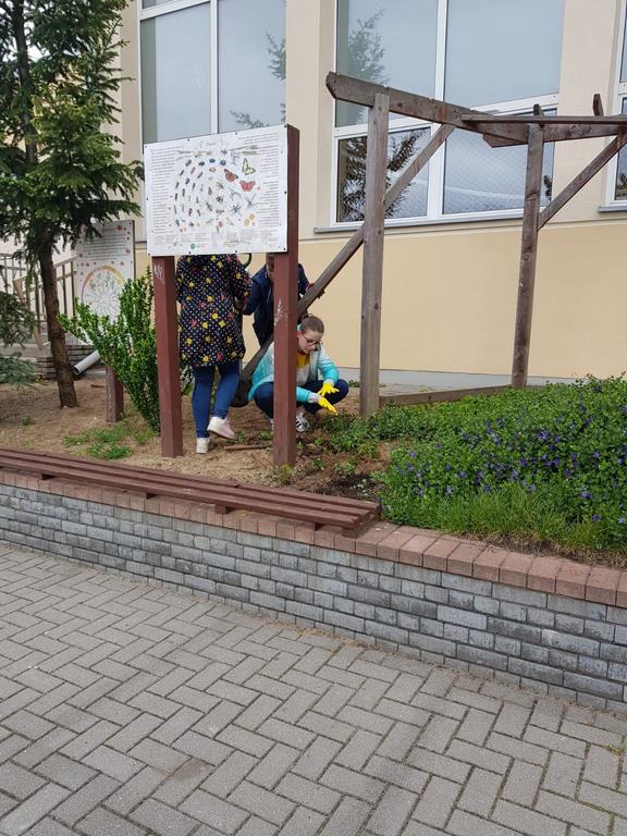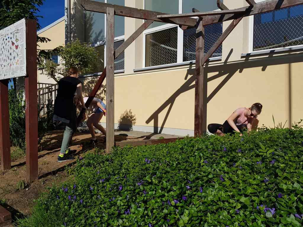 W ramach zajęć zaplanowaliśmy szereg działań. Wypielone zostały gazony, przygotowany klomb dla nowych roślin, rozpoczęliśmy malowanie pergoli i tablic dydaktycznych na ścieżce „Zielona Biblioteka”. Zapraszamy do spędzania wolnego czasu wśród zieleni i kolorowych kwiatów.
